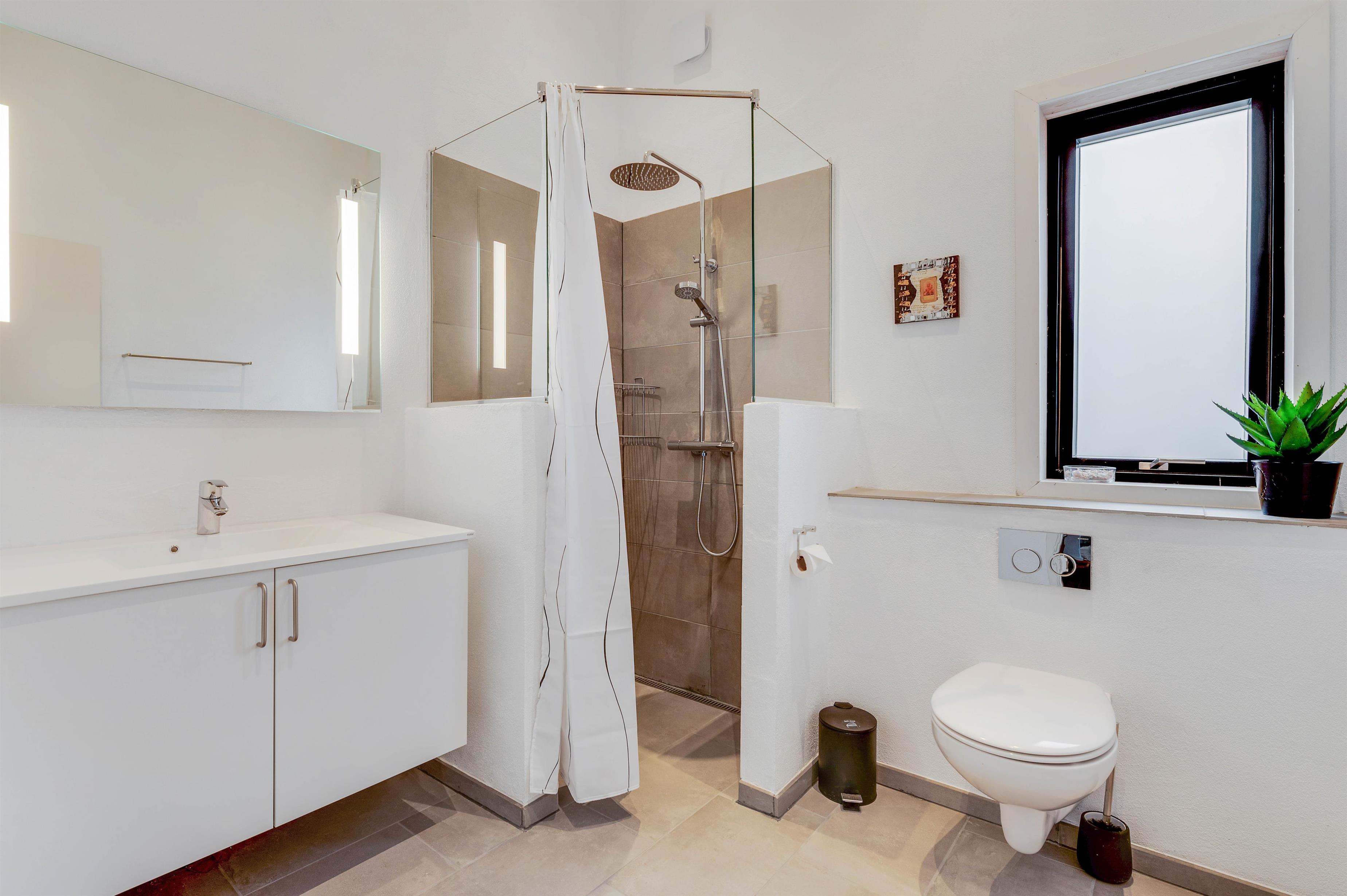 Der er flere udgange til den store, alsidige terrasse. Her finder alle 6 feriegæster – og det firbenede familiemedlem – hurtigt en plads i solen, og der er selvfølgelig sørget for godt med havemøbler og liggestole, så I kan nyde de varme solskinsdage i fulde drag. Der er altid ly og læ at finde til at nyde den friske luft, eftersom terrassen både har en afskærmet og overdækket del. Der er også mulighed for at få et forfriskende skyl under sommerhusets udendørs bruser, som er tilgængelig fra april til november.