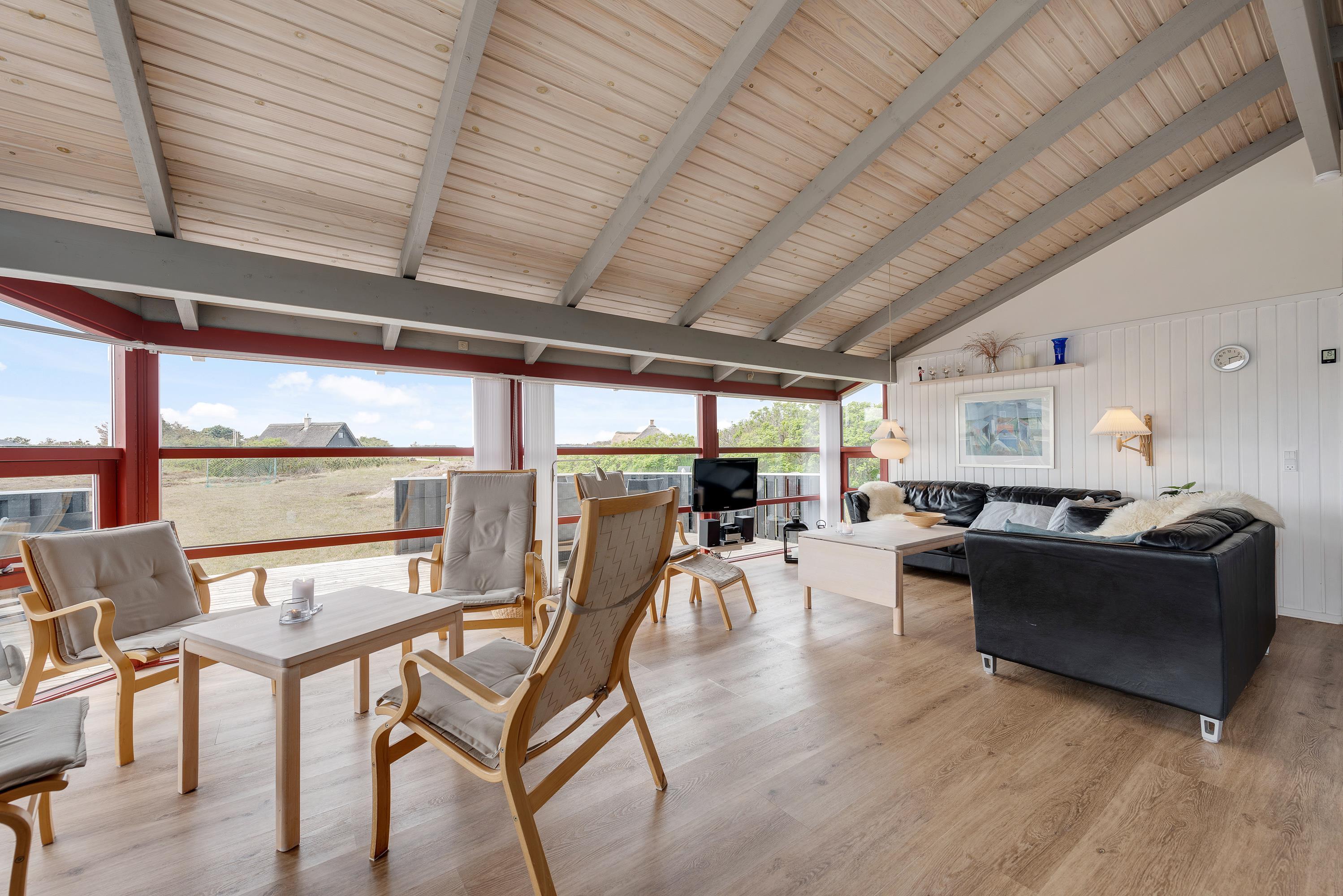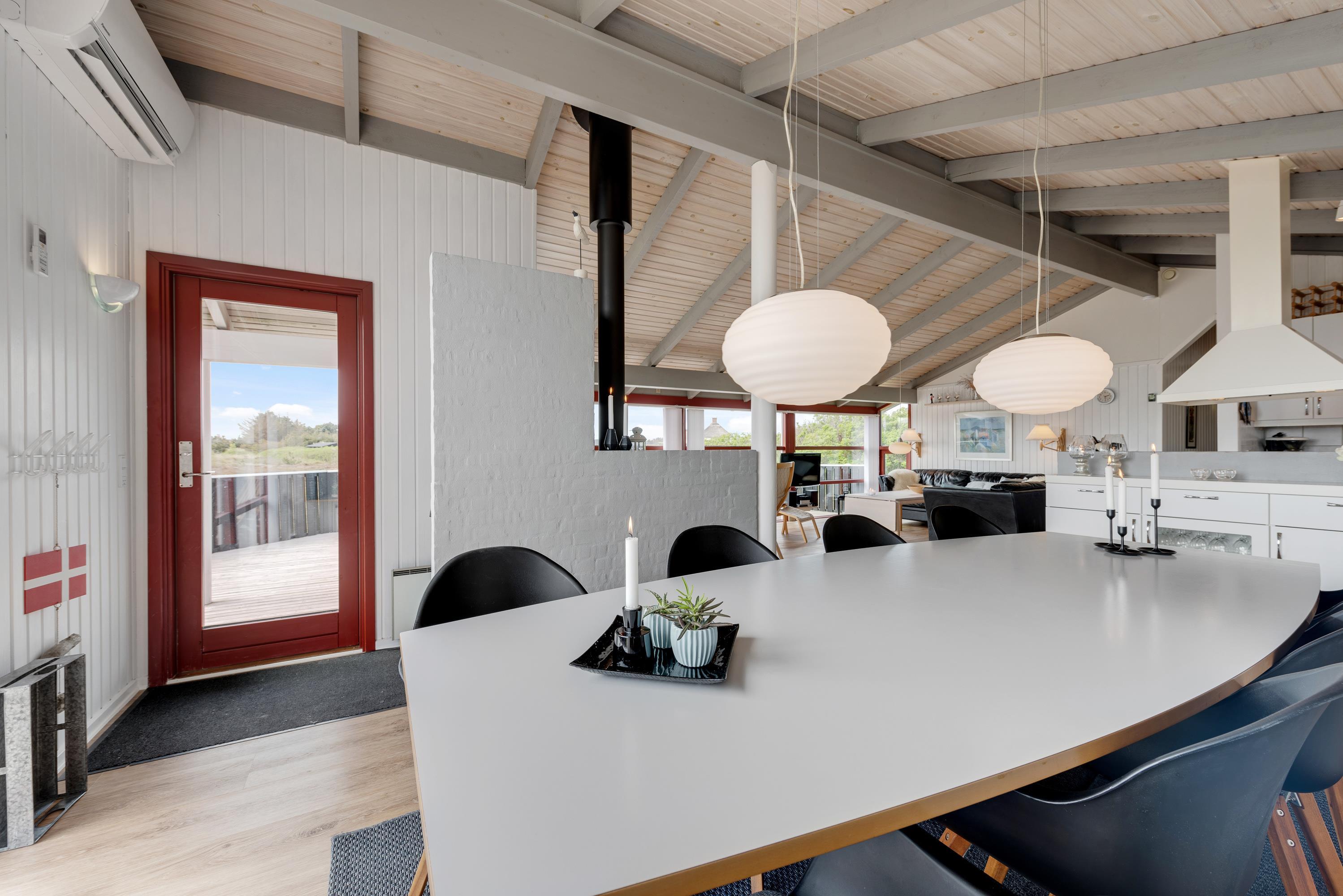 I fællesarealet indbyder lædersofaerne, som rammer op til køkkenet, og siddepladserne tæt på brændeovnen til ren afslapning. Uanset hvor I befinder jer i fællesarealet, kan I dele alle jeres oplevelser sammen, og det åbne rum skaber en varm atmosfære og en hyggelig feriestemning året rundt. Ud ad de store vinduer, der giver et dejligt lysindfald i rummet, kan I nyde den vestjyske hede.