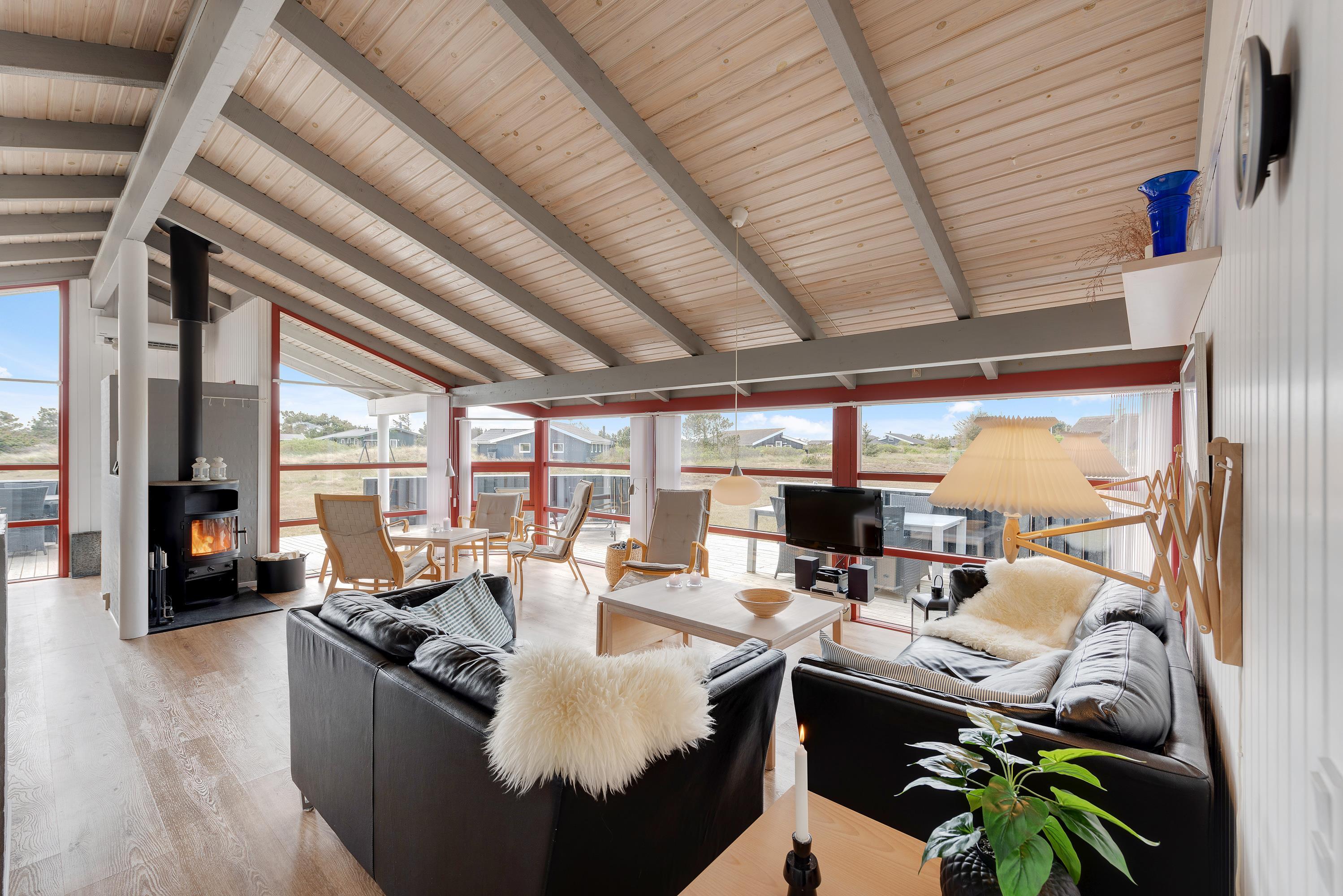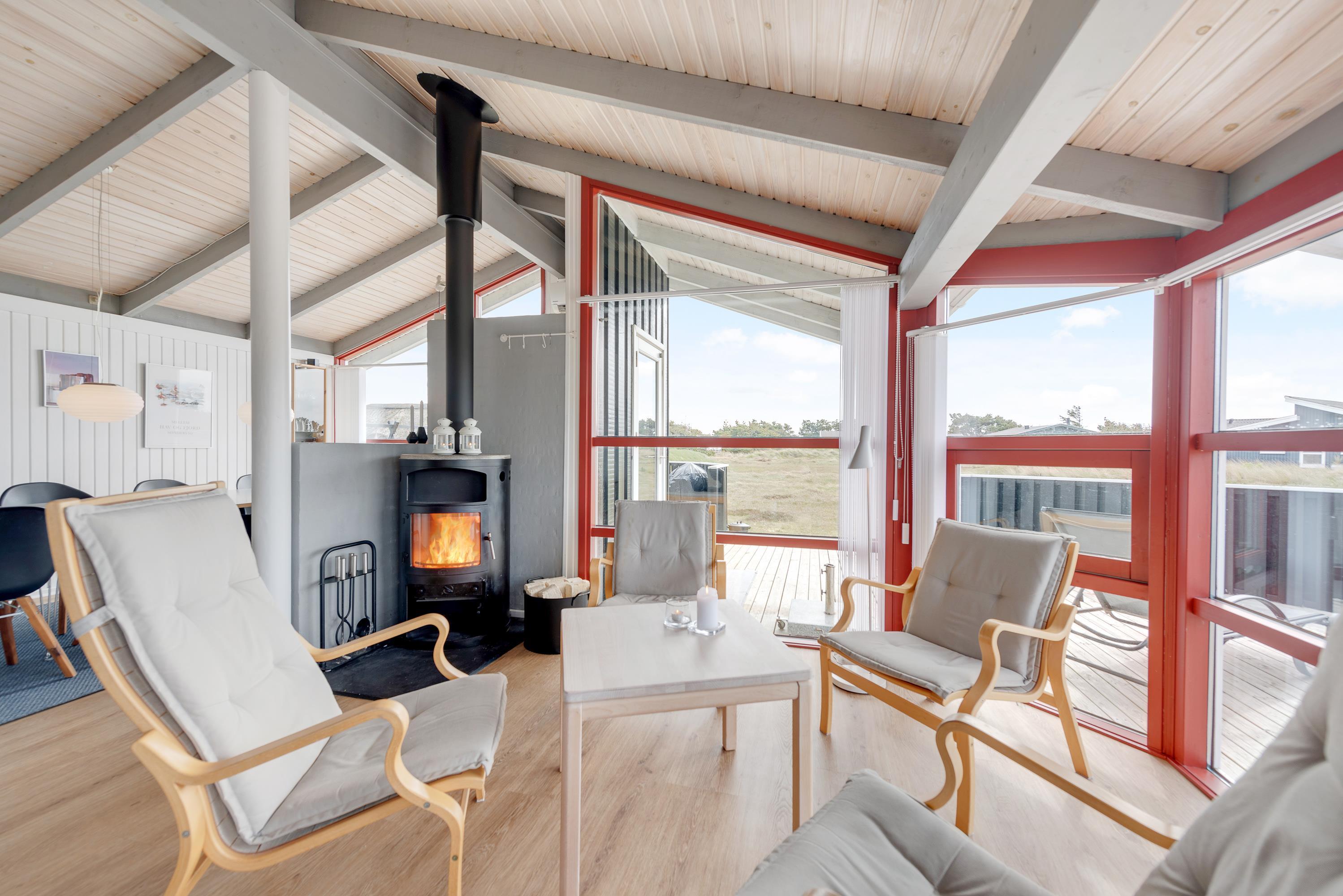 Ud over husets andre faciliteter, inviterer brændeovnen til mange varme og hyggelige timer, når vindens sus og Vesterhavets gus banker på vinduerne.