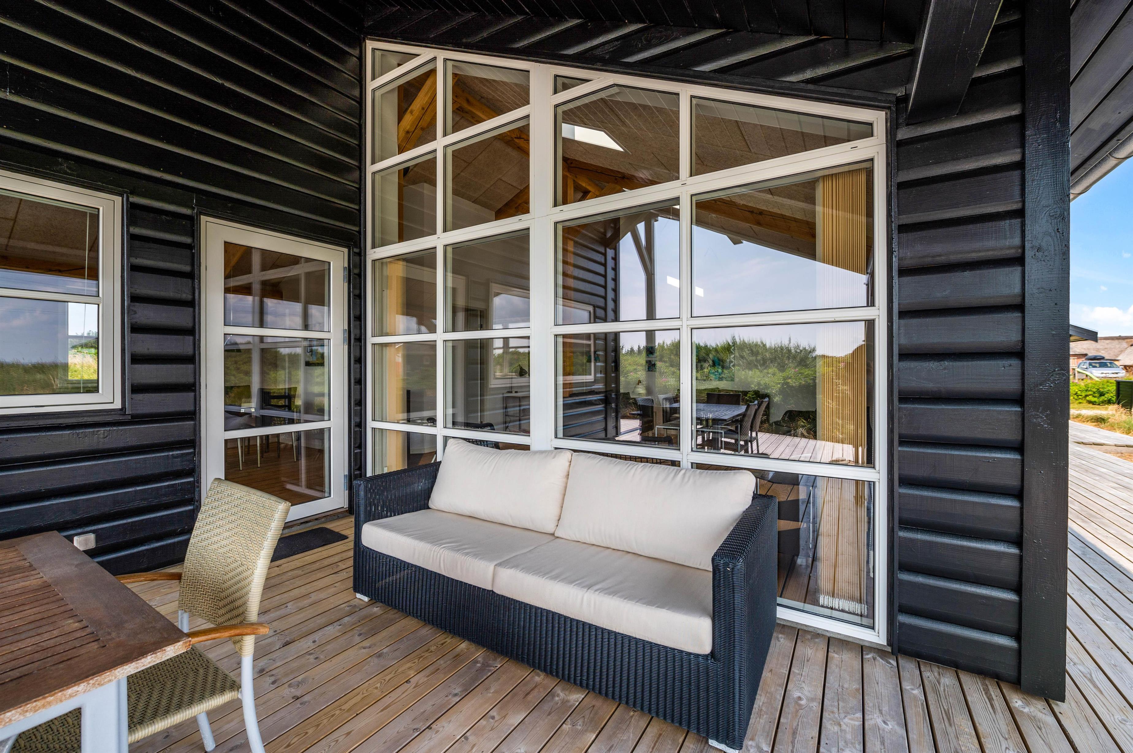 Omkring sommerhuset løber en stor træterrasse, som I kan nyde jeres solrige feriedage fra. På træterrassen står der havemøbler og liggestole klar til jer, så I kan finde jer godt til rette på et godt spot i solen med en spændende bog eller en kold drink.