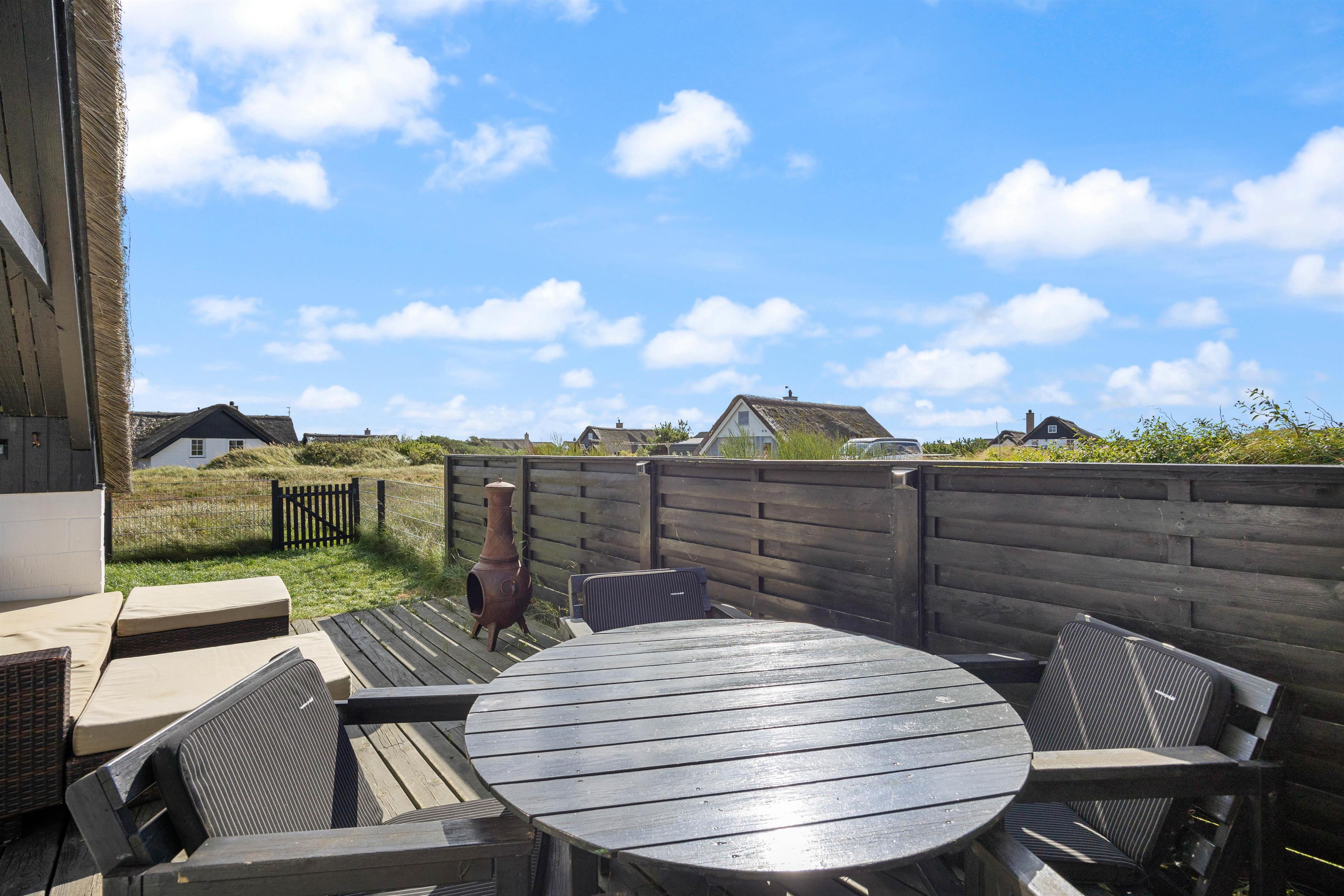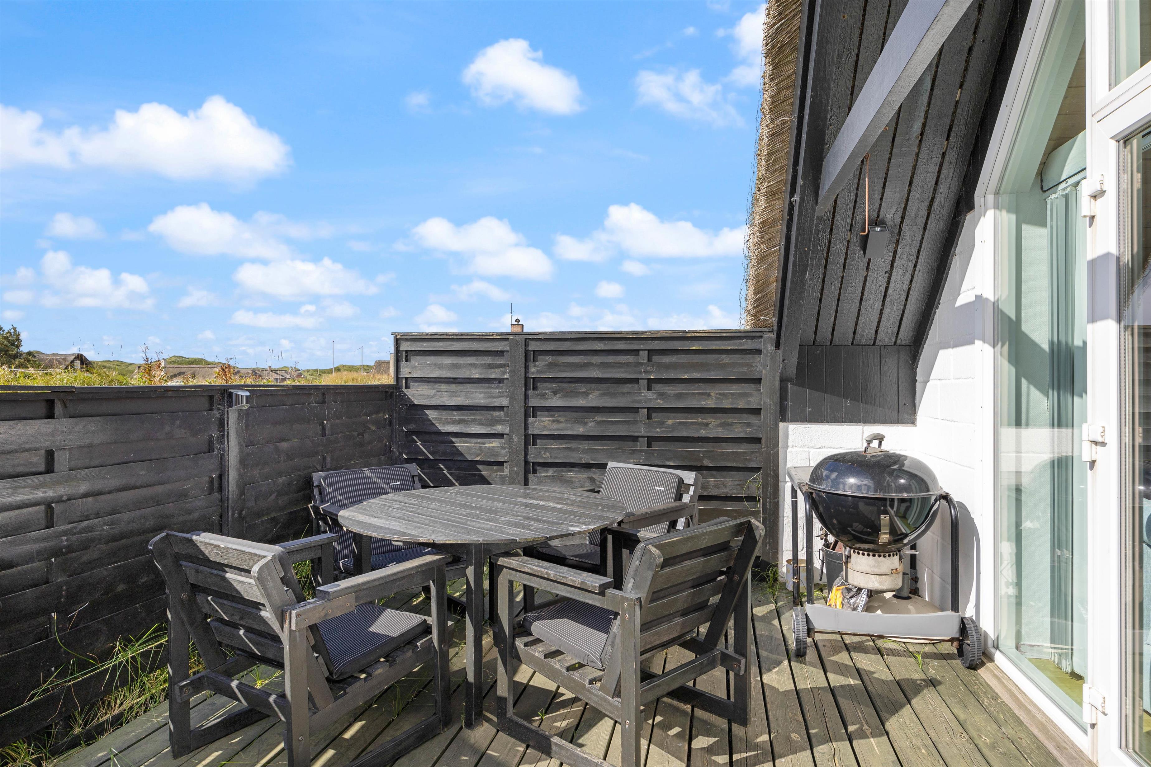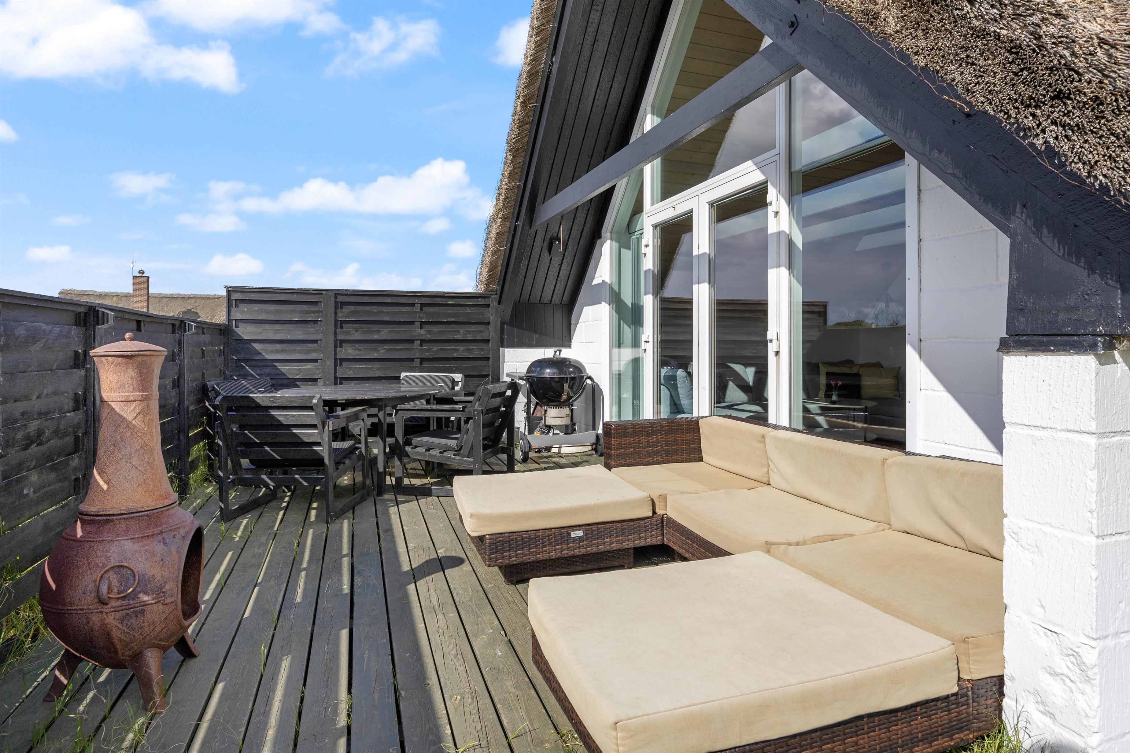 Udendørs byder sommerhuset på flere skønne terrasser – både åben, afskærmet og lukket – vendt mod øst og syd. Her kan I nyde den friske havluft, solens varme og den omkringliggende natur. Havemøbler, grill, solvogne og parasol står naturligvis til rådighed, så udelivet bliver en naturlig del af ferien.