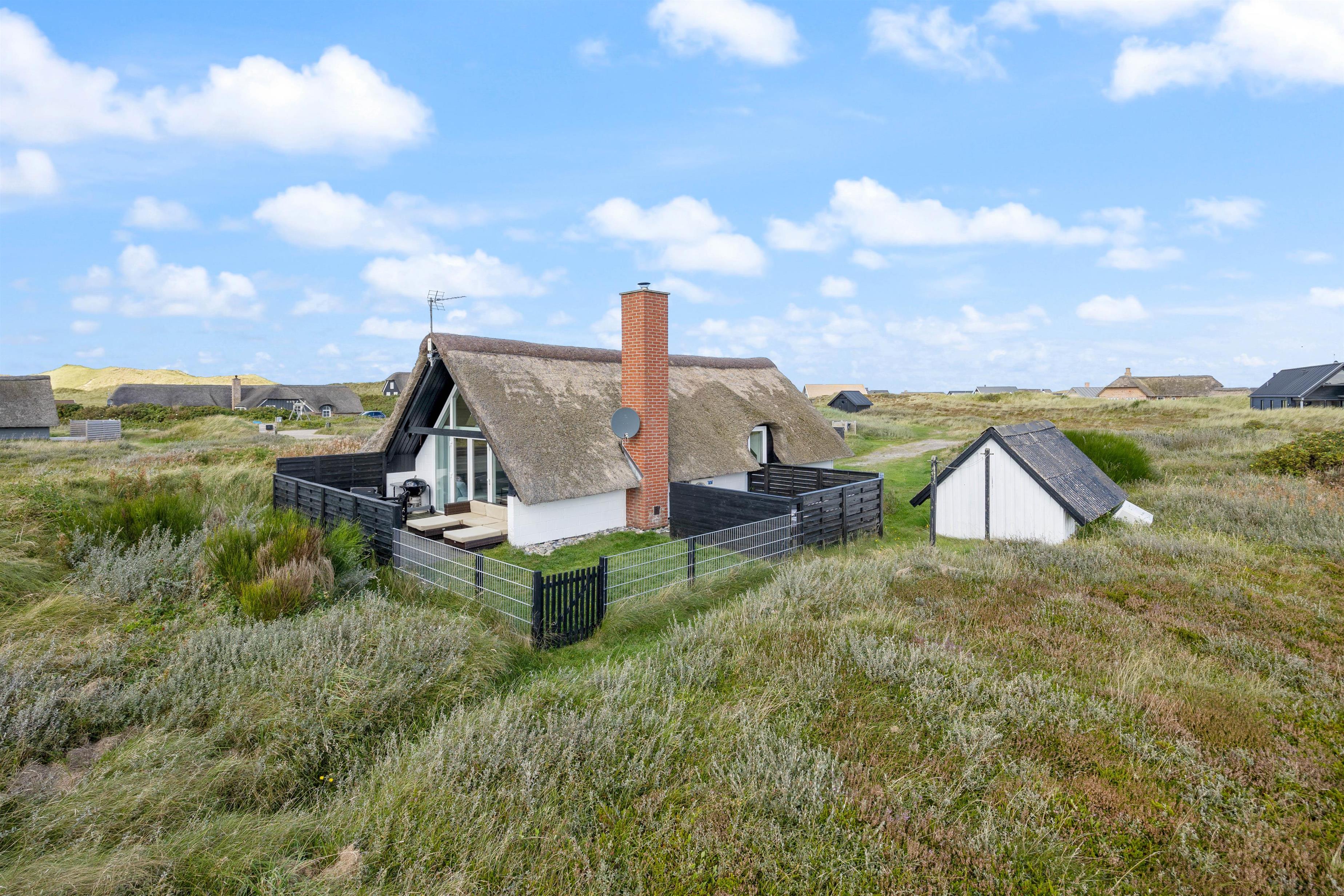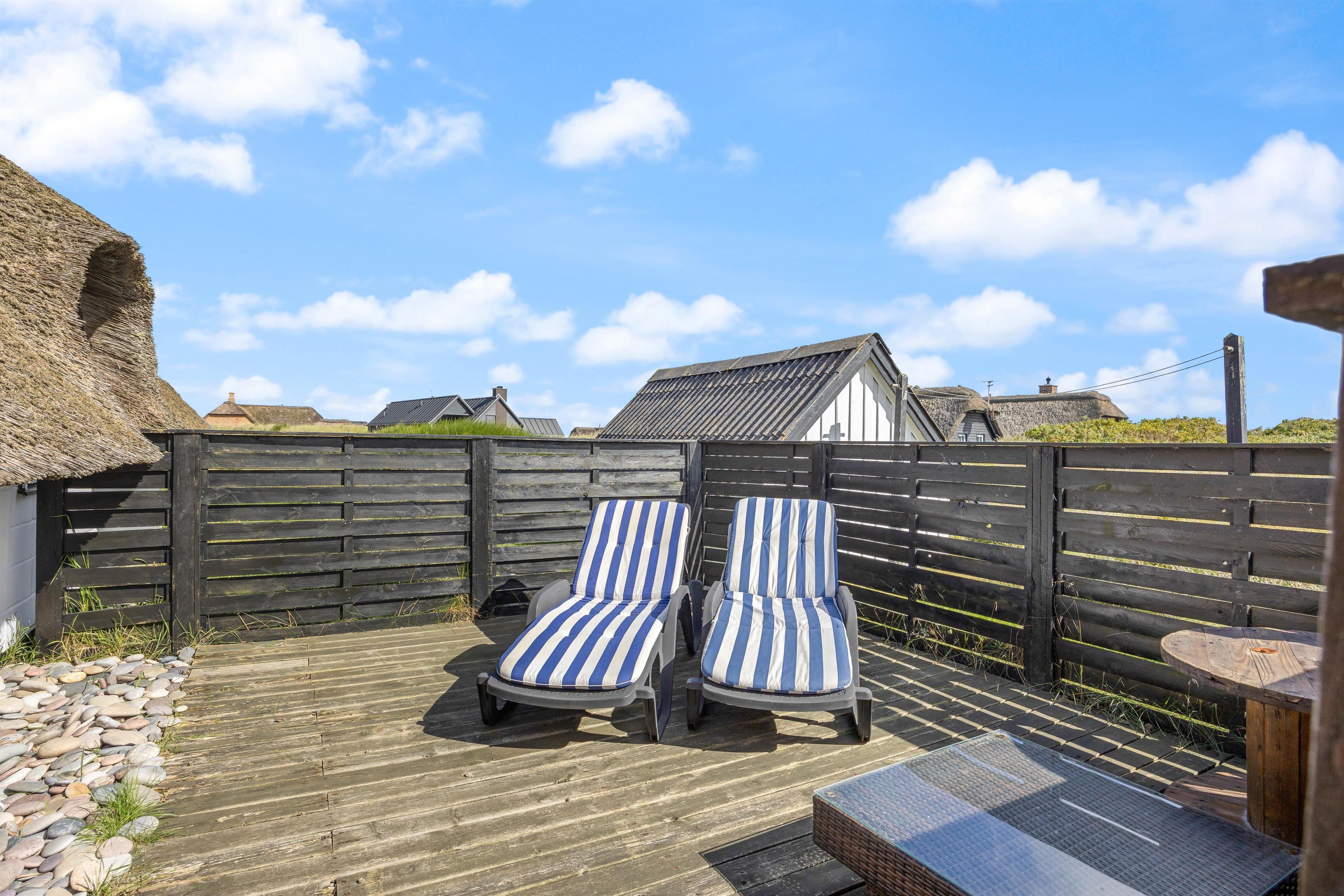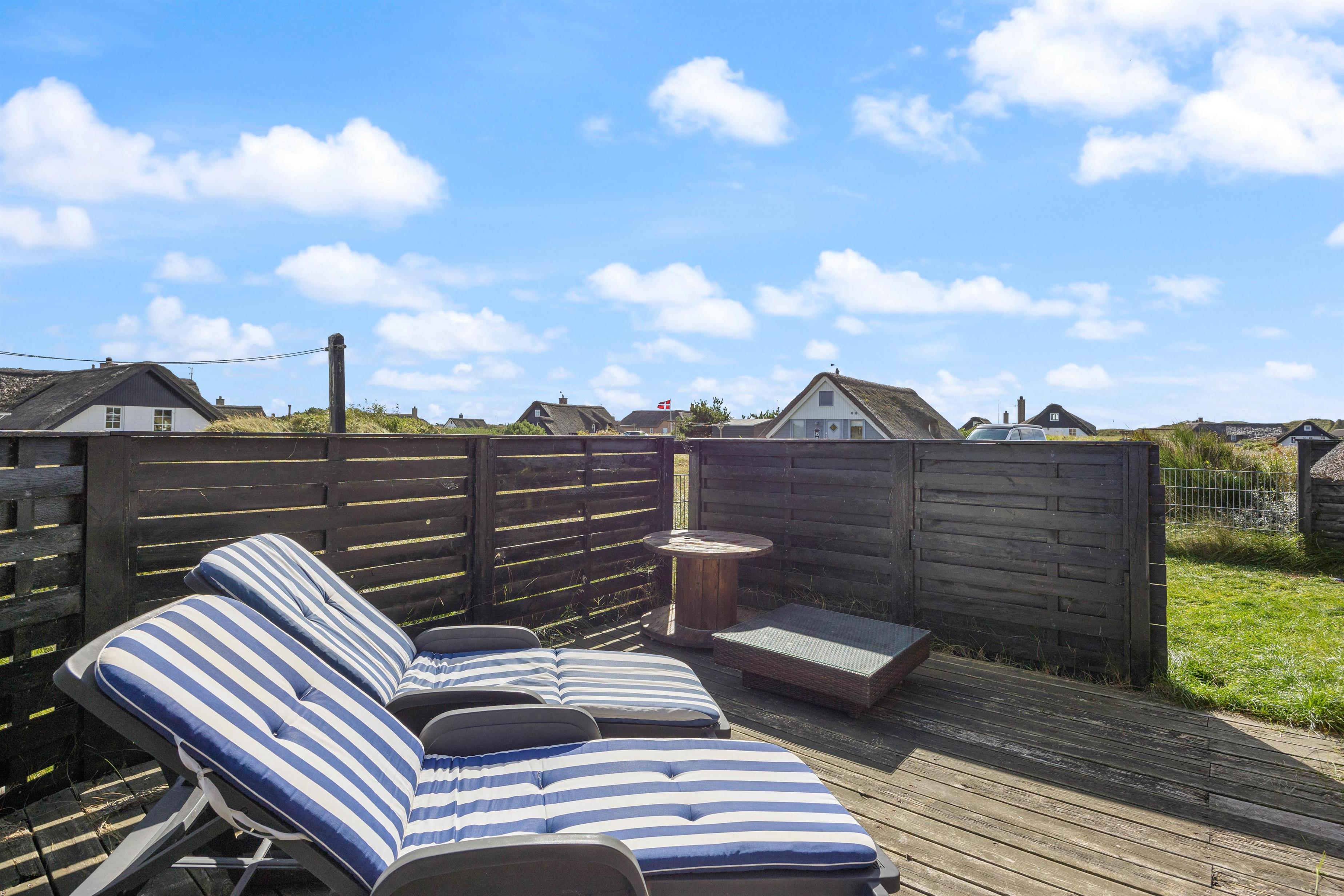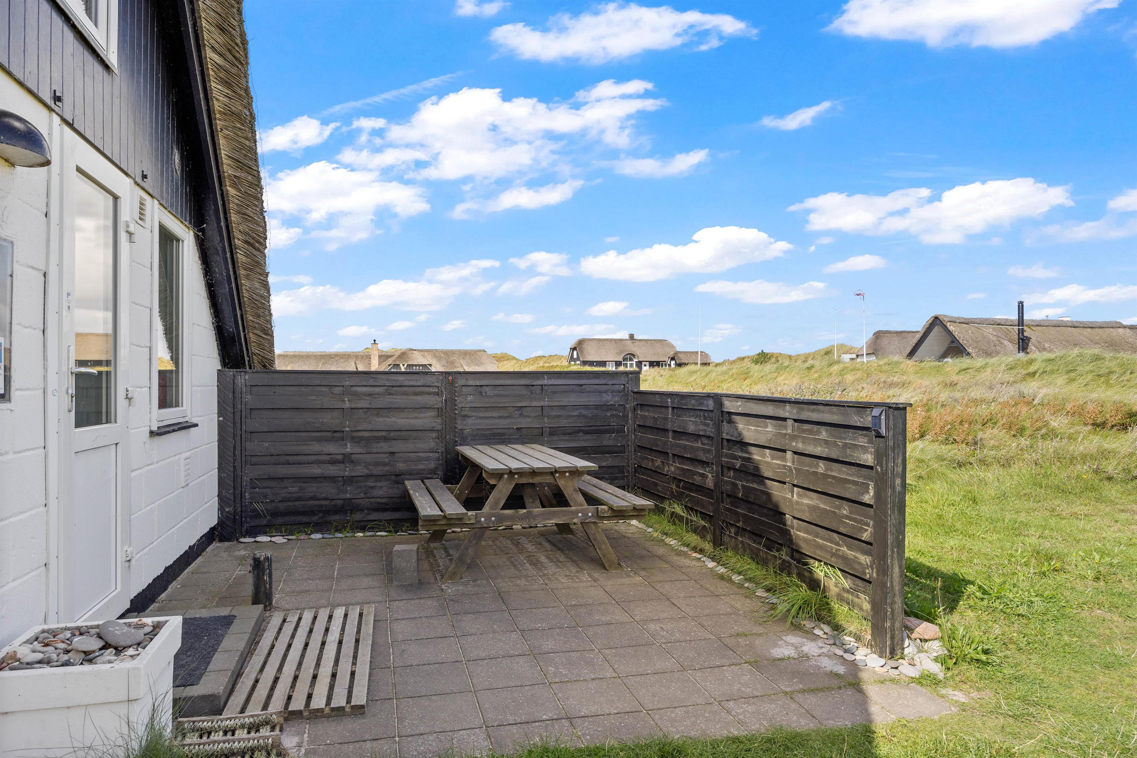 Udendørs byder sommerhuset på flere skønne terrasser – både åben, afskærmet og lukket – vendt mod øst og syd. Her kan I nyde den friske havluft, solens varme og den omkringliggende natur. Havemøbler, grill, solvogne og parasol står naturligvis til rådighed, så udelivet bliver en naturlig del af ferien.