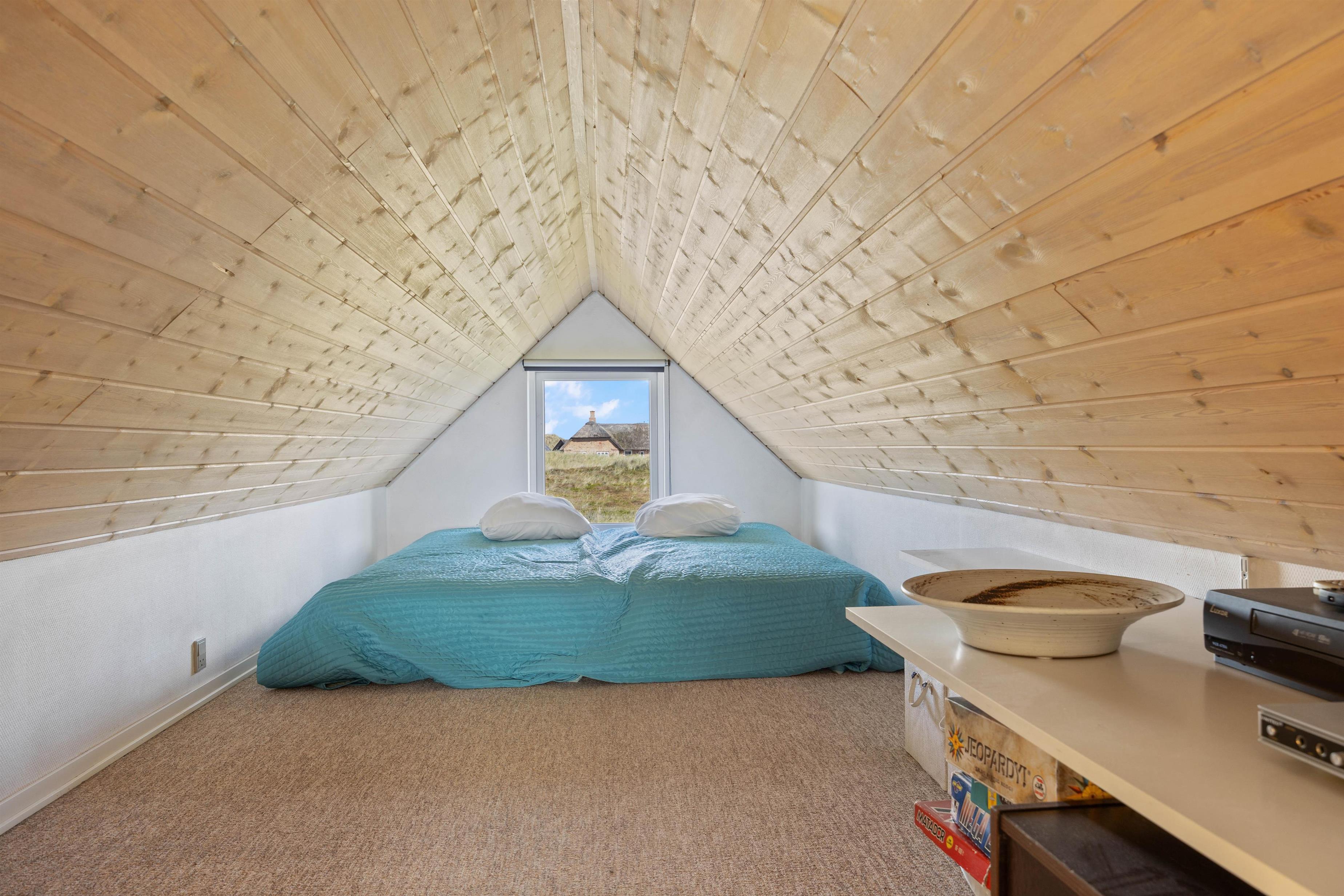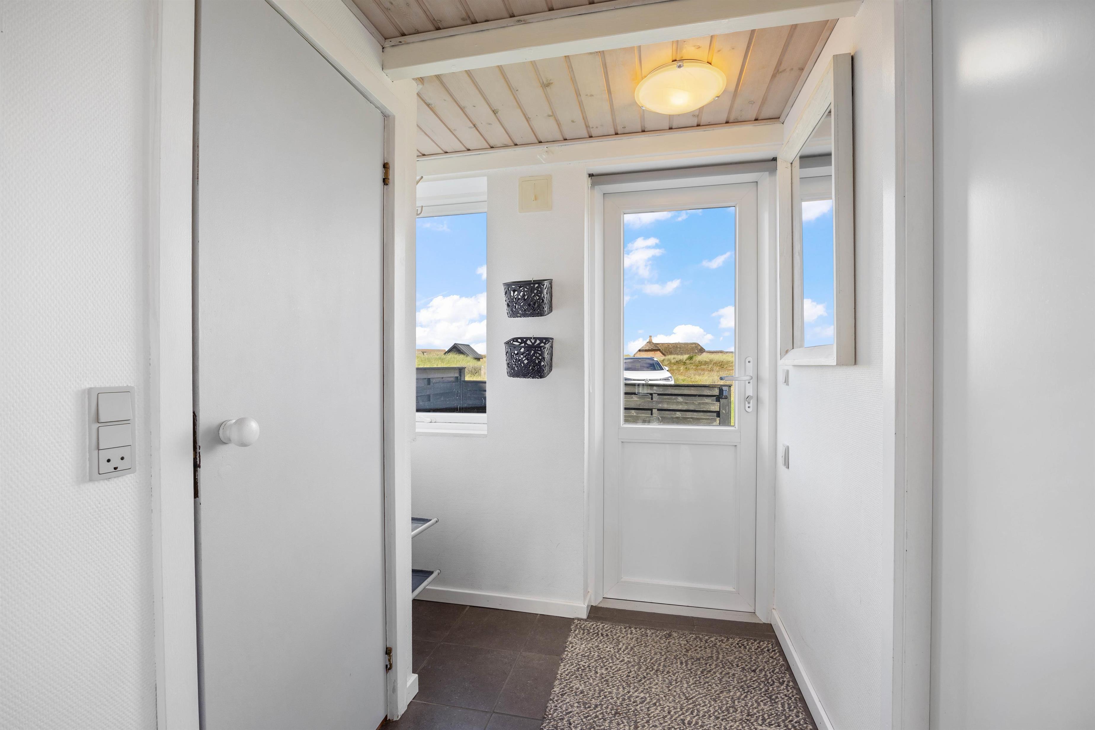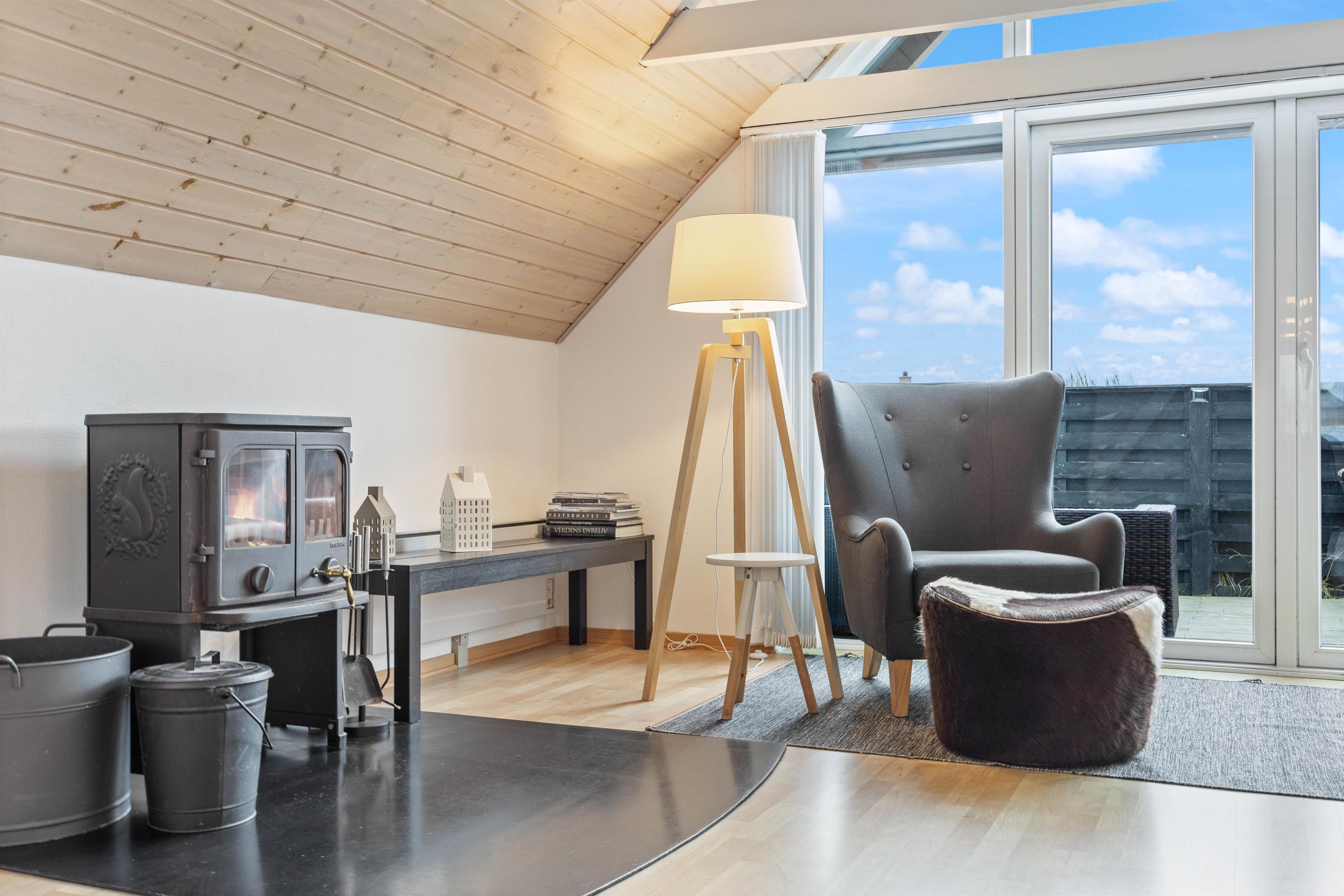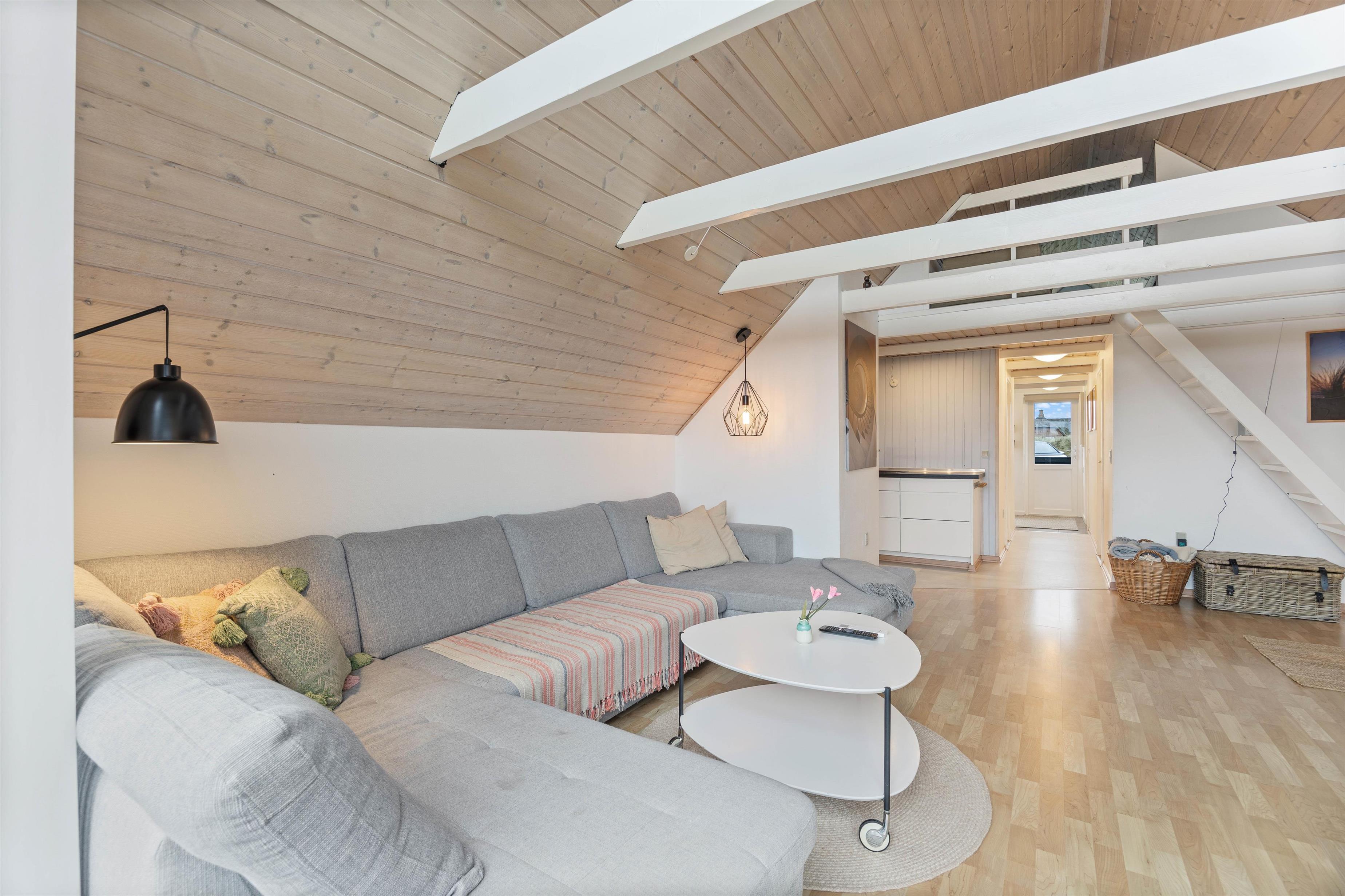 Indenfor mødes I af en lys og smagfuld indretning med store vinduer, der giver et dejligt lysindfald, samt skrå lofter med synlige bjælker, som bidrager til den hyggelige feriestemning. De synlige bjælker er en del af den klassiske danske byggestil og hænger lidt lavt, hvilket de høje iblandt jer skal være opmærksomme på.