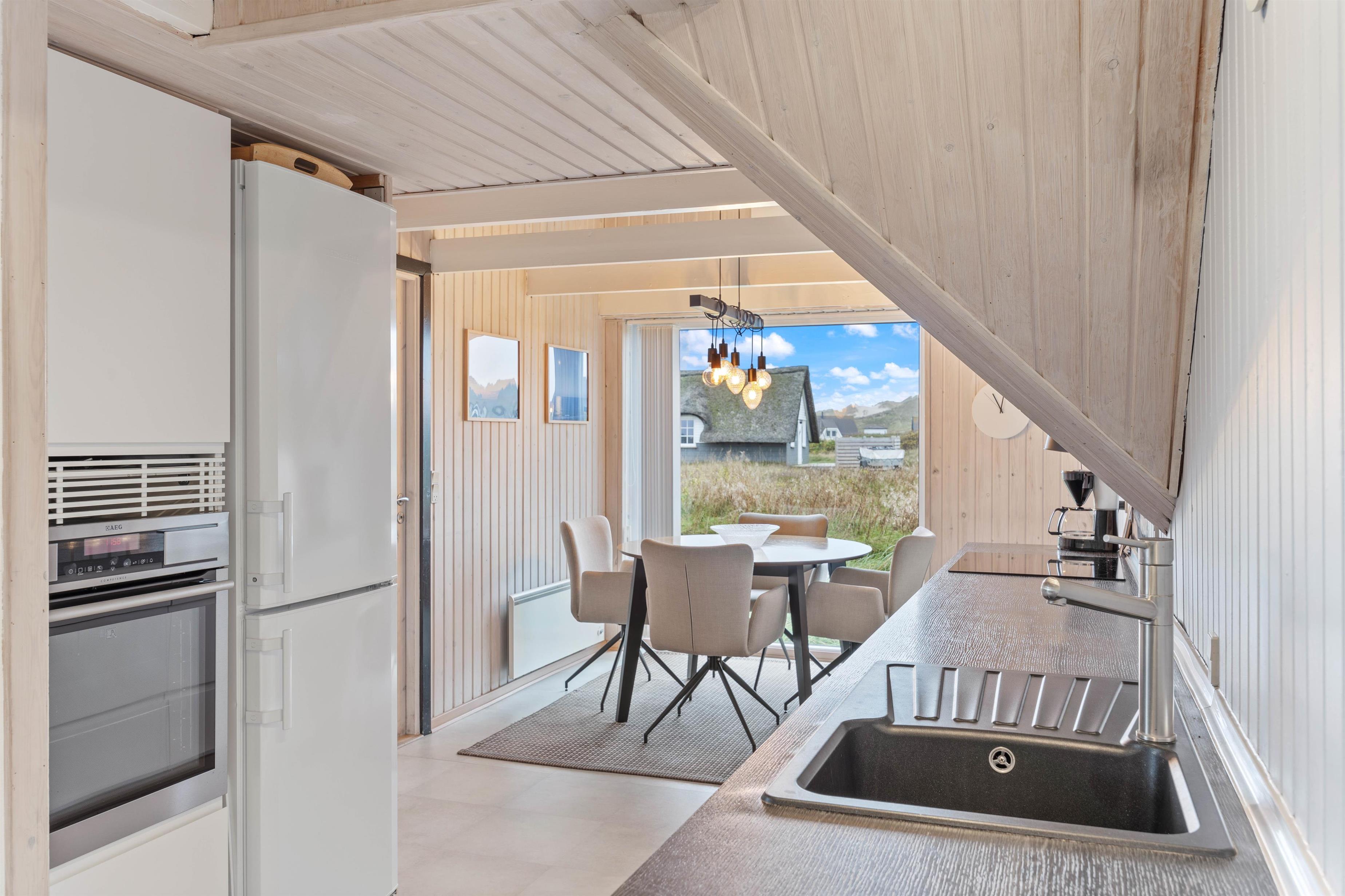 Fra spisekrogen kan I nyde en smuk udsigt til klitterne, mens I samles om morgenmaden. Efter en tur til stranden kan I slappe af på sofaen foran brændeovnen eller forkæle jer selv med ren velvære i husets sauna. Badeværelset er udstyret med gulvvarme, som giver ekstra komfort – især på køligere dage.