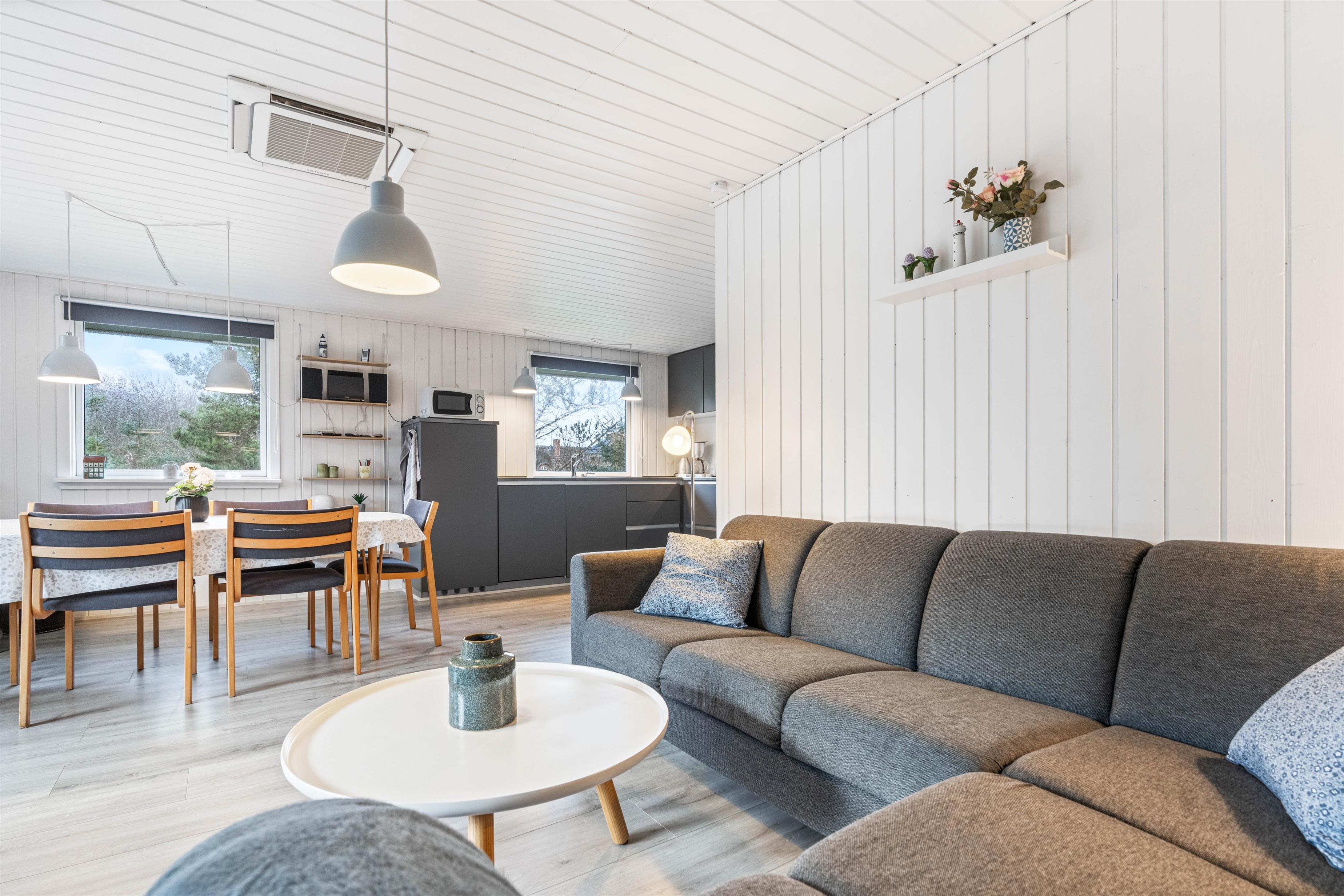 Dette moderne sommerhus beliggende på Lyngsletten 30 har plads til 5 personer. Sommerhuset er velindrettet med lyse trævægge og -lofter, som tilsammen skaber god rummelighed og giver lys. Hjertet af huset er absolut det hyggelige alrum, der ligger i åben forbindelse med det flotte køkken. Køkkenet er veludstyret, så der er god plads til at lave mad til hele familien. Samtidig har sommerhuset en økonomivenlig varmepumpe, så I kan undgå de alt for dyre varmeregninger.