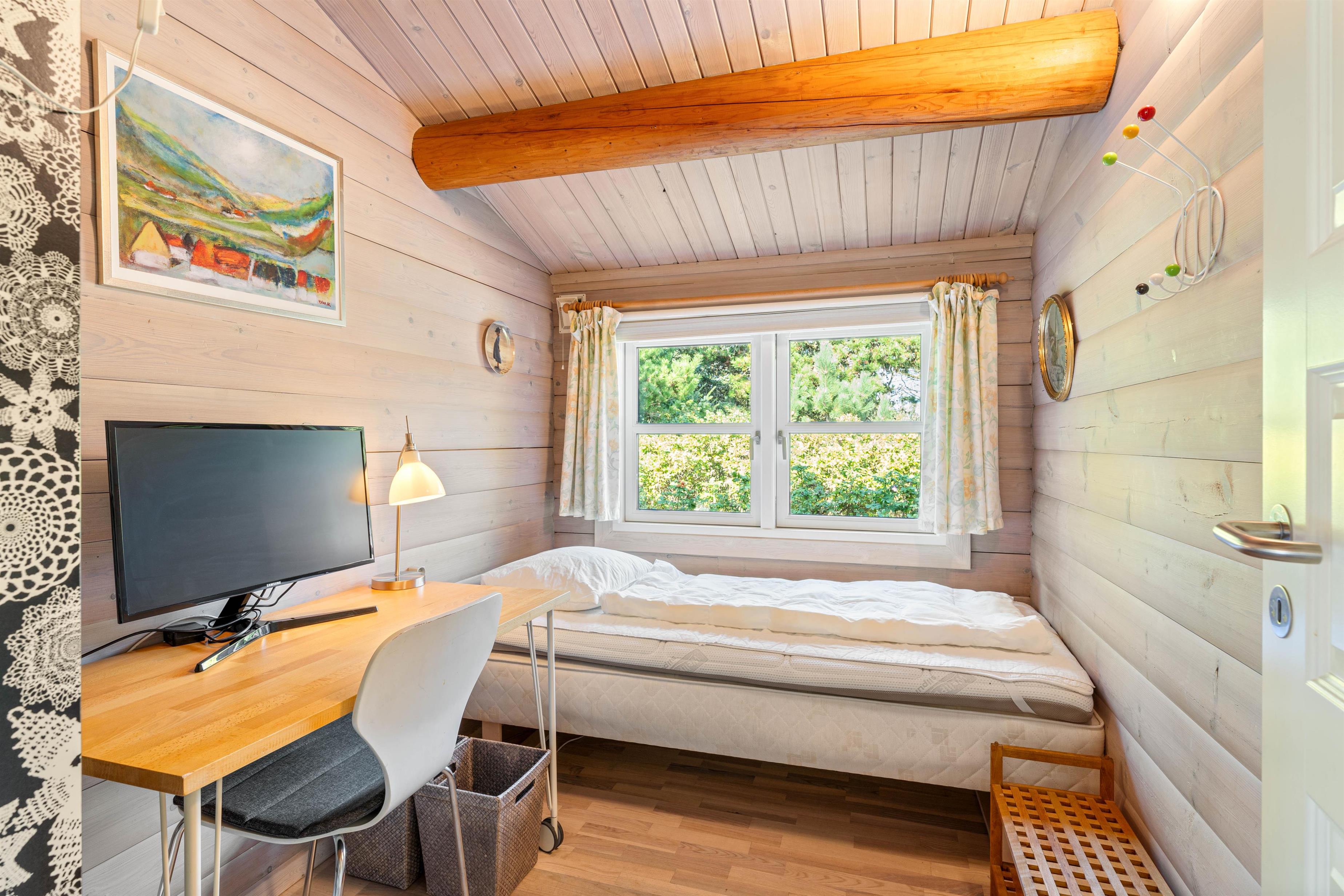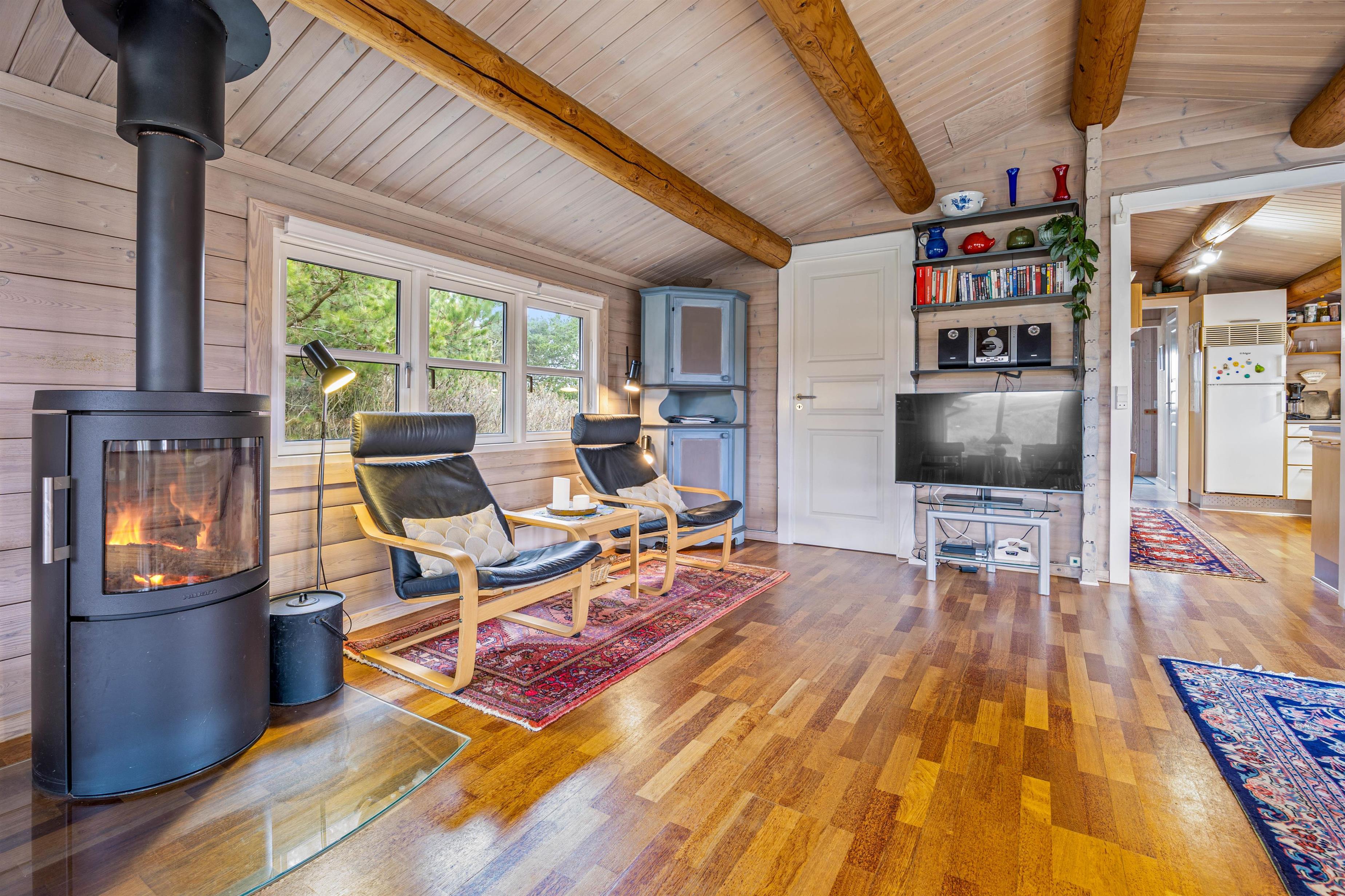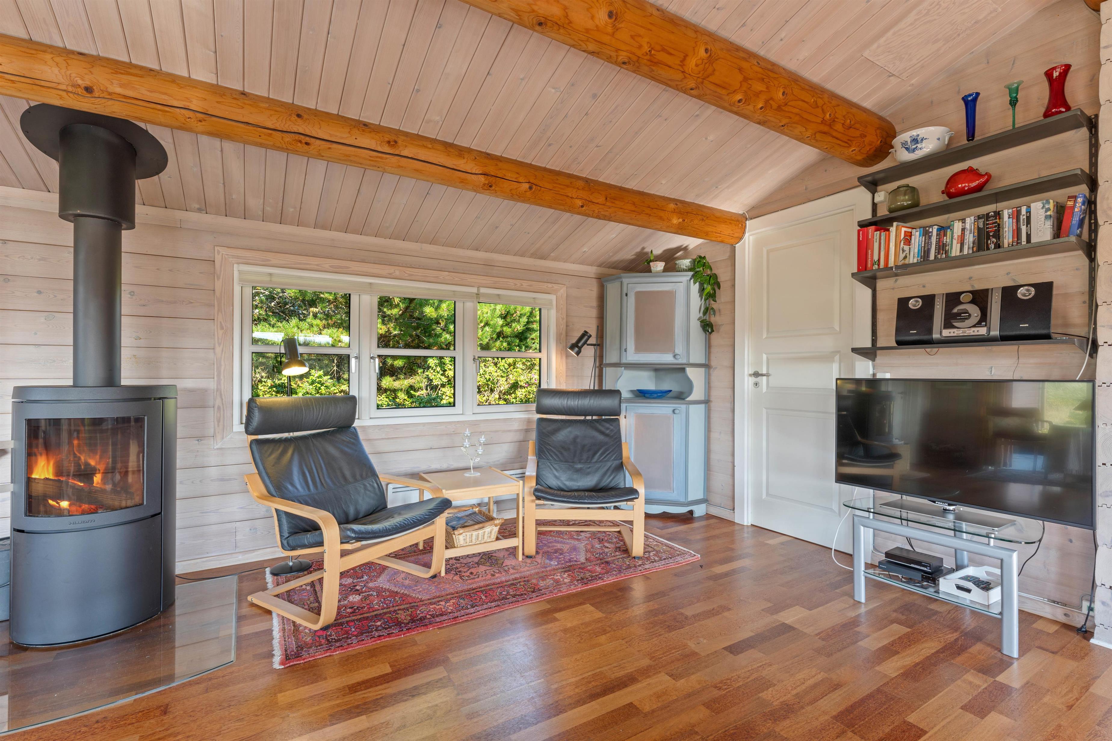 Dejligt, charmerende og velindrettet feriehus med dejlig fredelig beliggenhed på en kuperet naturgrund i et attraktivt område. Huset er omgivet af flere terrasser, – en delvist overdækket og med en flot udsigt mod syd. Indretningen er i en flot, personlig stil, hvor tingene passer godt sammen.