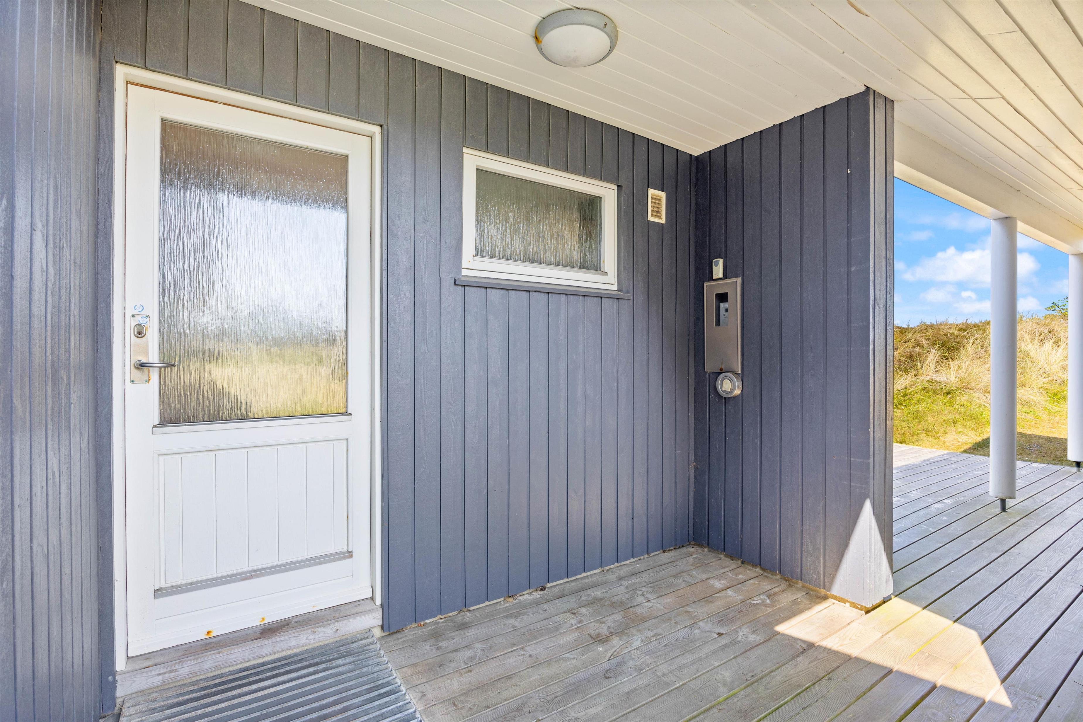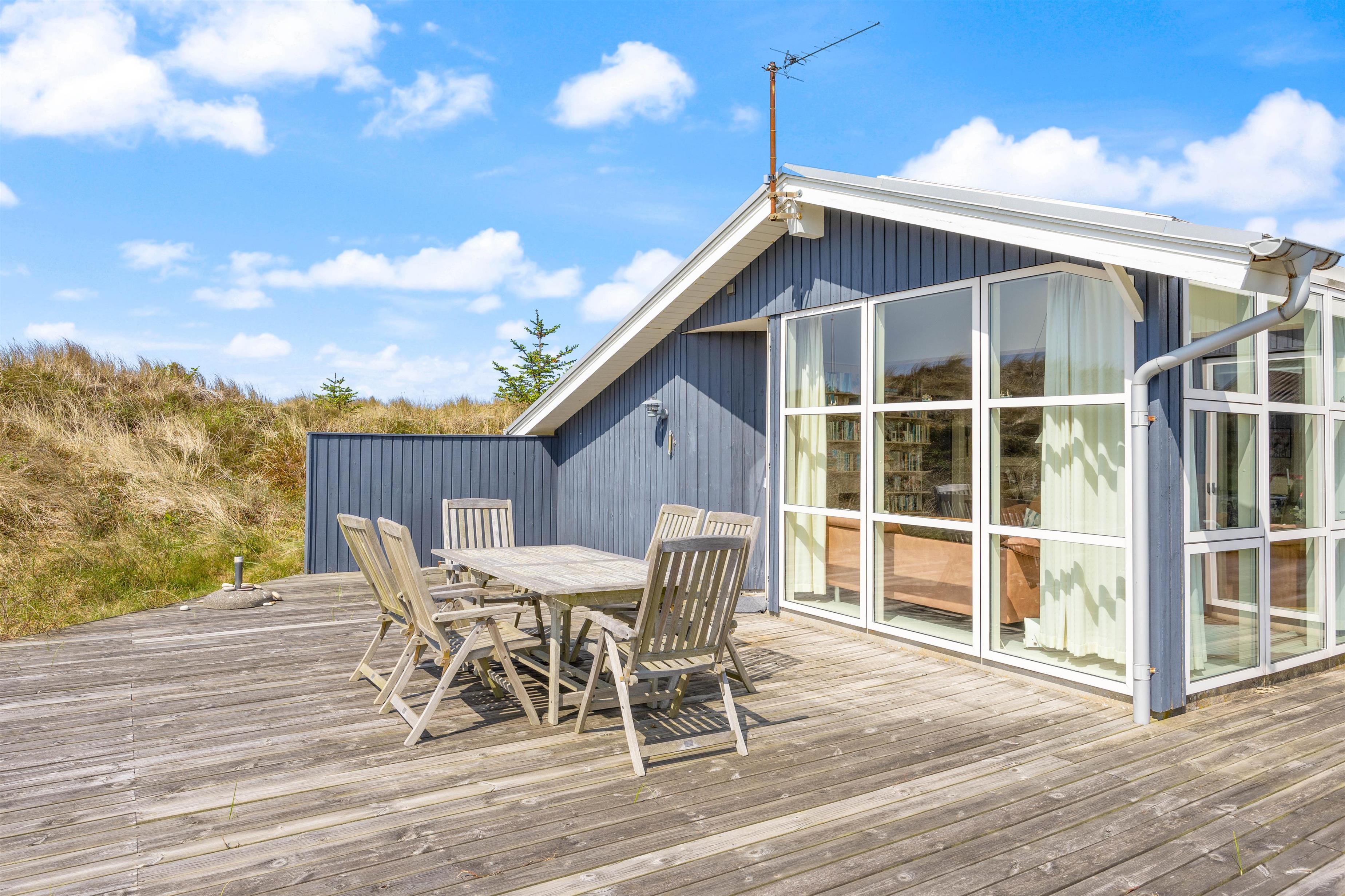 Fra stuen er der udgang til den store træterrasse, som omringer feriehuset. Terrassen er åben samt delvis afskærmet. Her kan I sidde i sommerhusets havemøbler og nyde udsigten til klitterne med en god kop kaffe, og om aftenen kan I finde feriehusets grill frem og tilberede en behagelig middag herpå. Udenfor finder I også et redskabsrum, hvor I kan opbevare diverse ting.