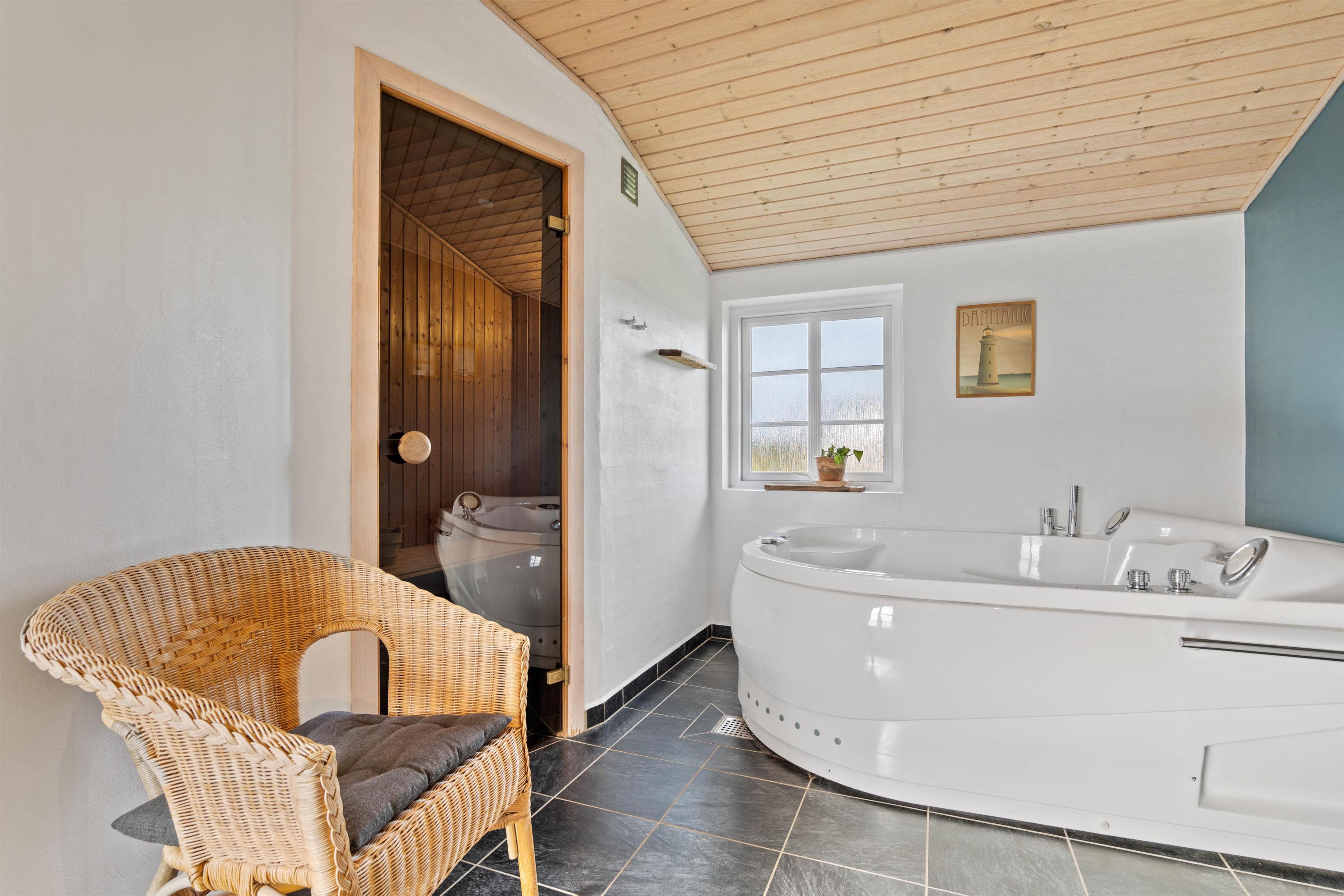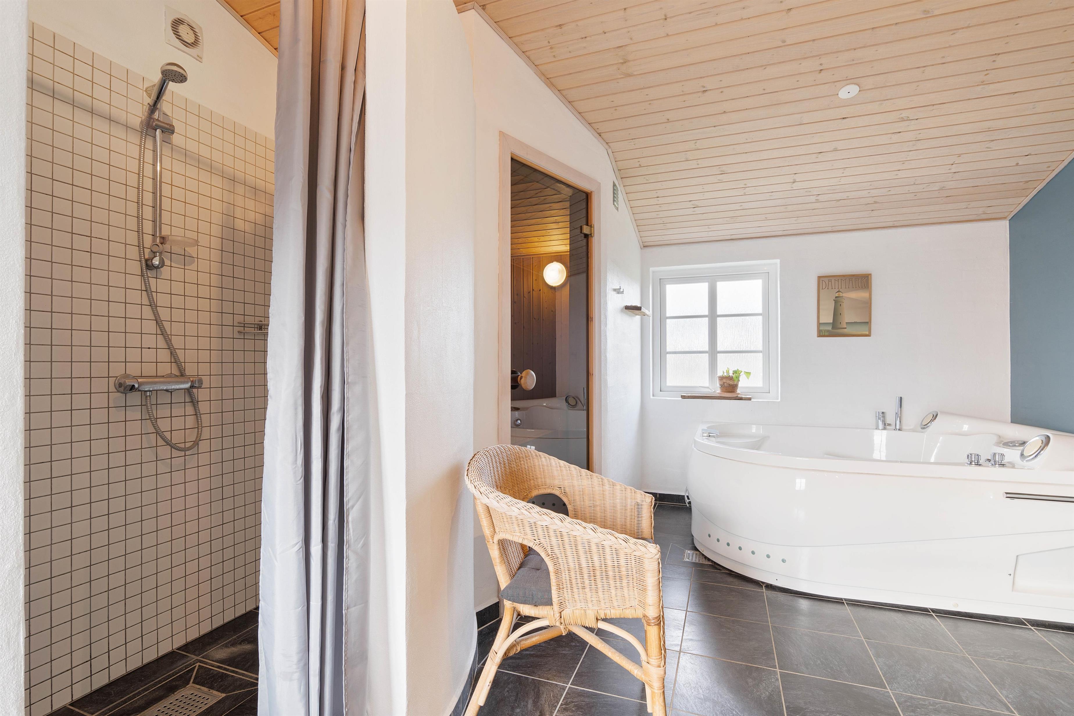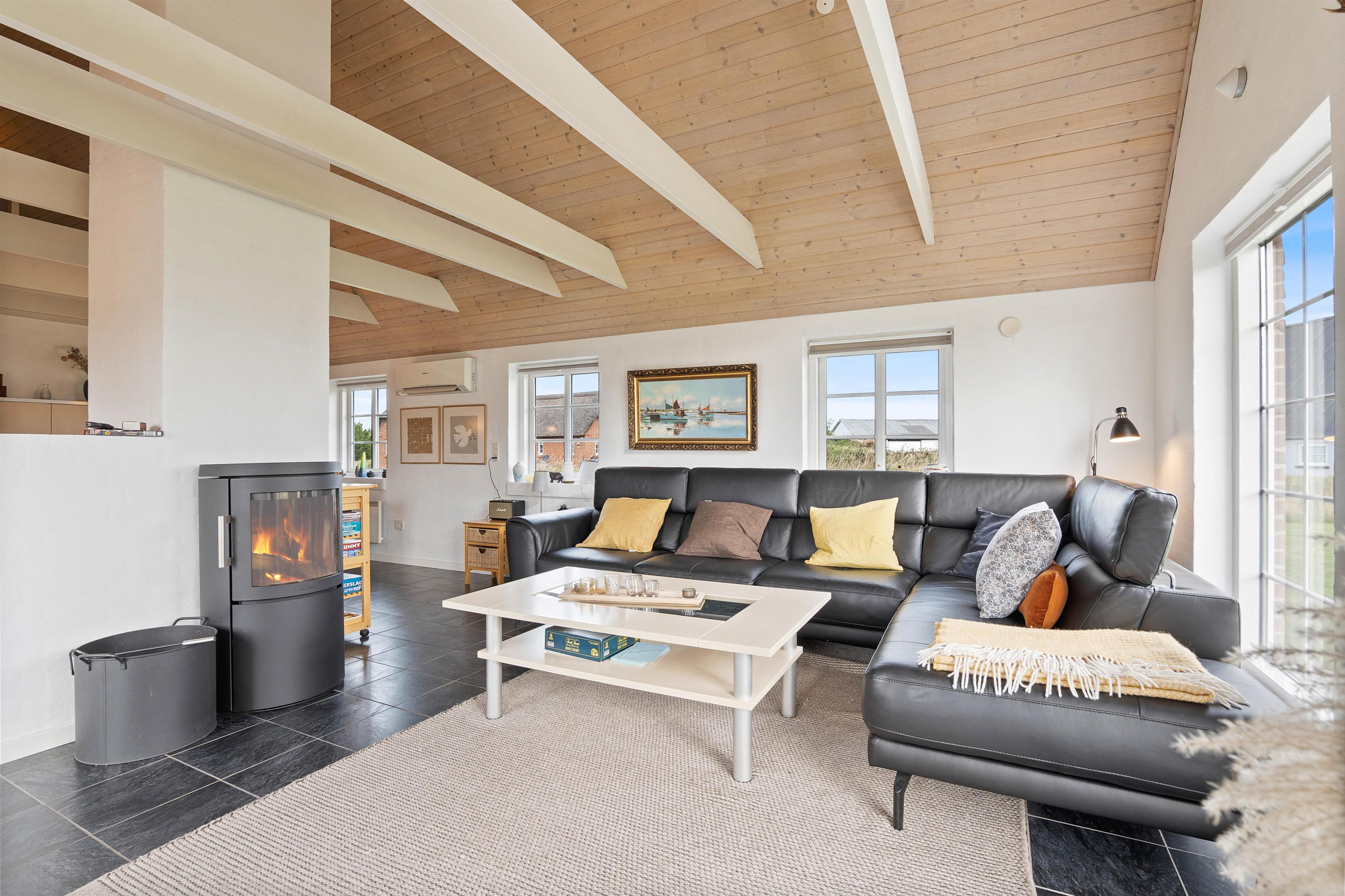 Derudover er der to gode badeværelser, hvoraf det store har både spa og sauna, så I virkelig kan slappe af og få ladt batterierne op. I stuen er der et flot træloft til kip og med synlige bjælker, som giver huset særlig karakter. På køligere dage kan I tænde op i husets brændeovn, som er centralt palceret i boligen.