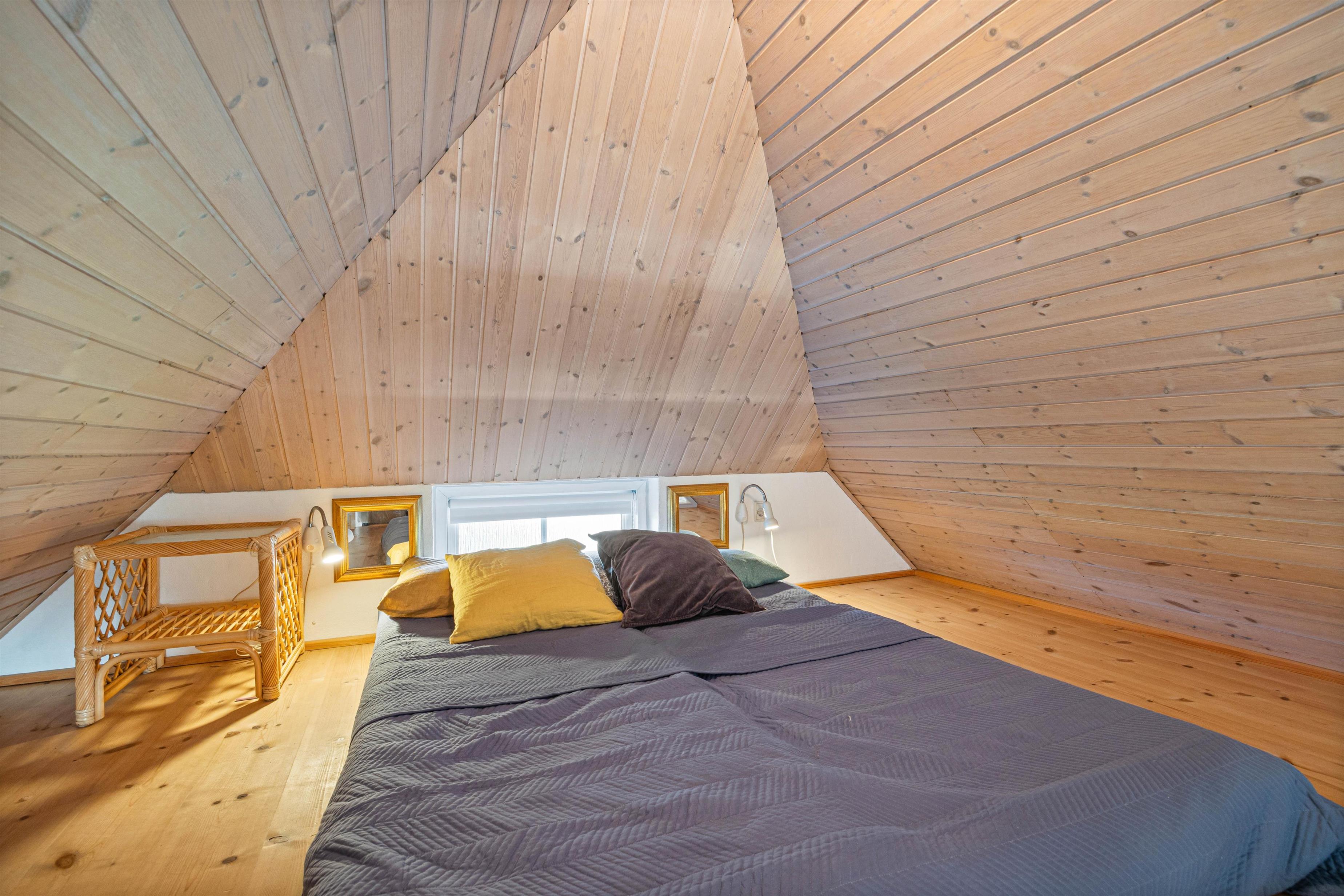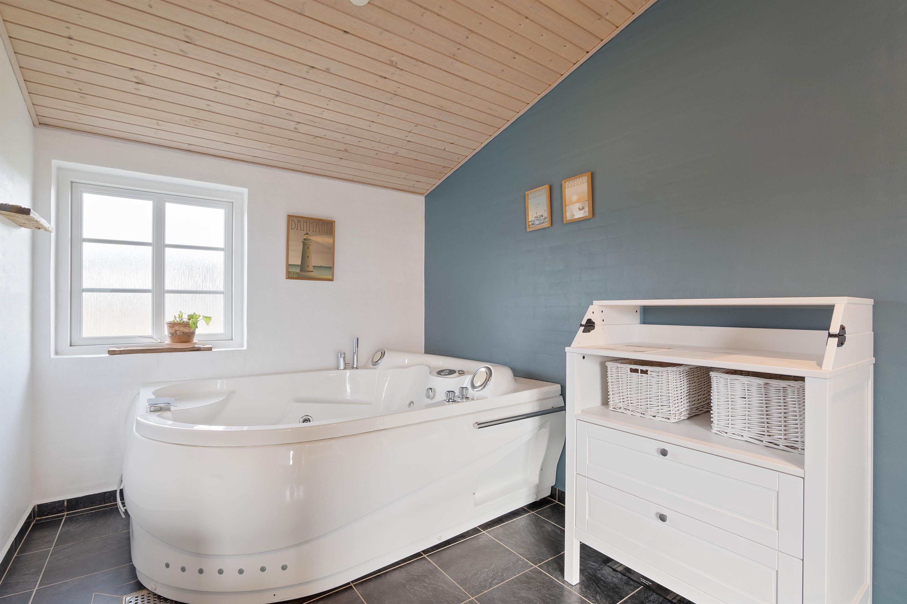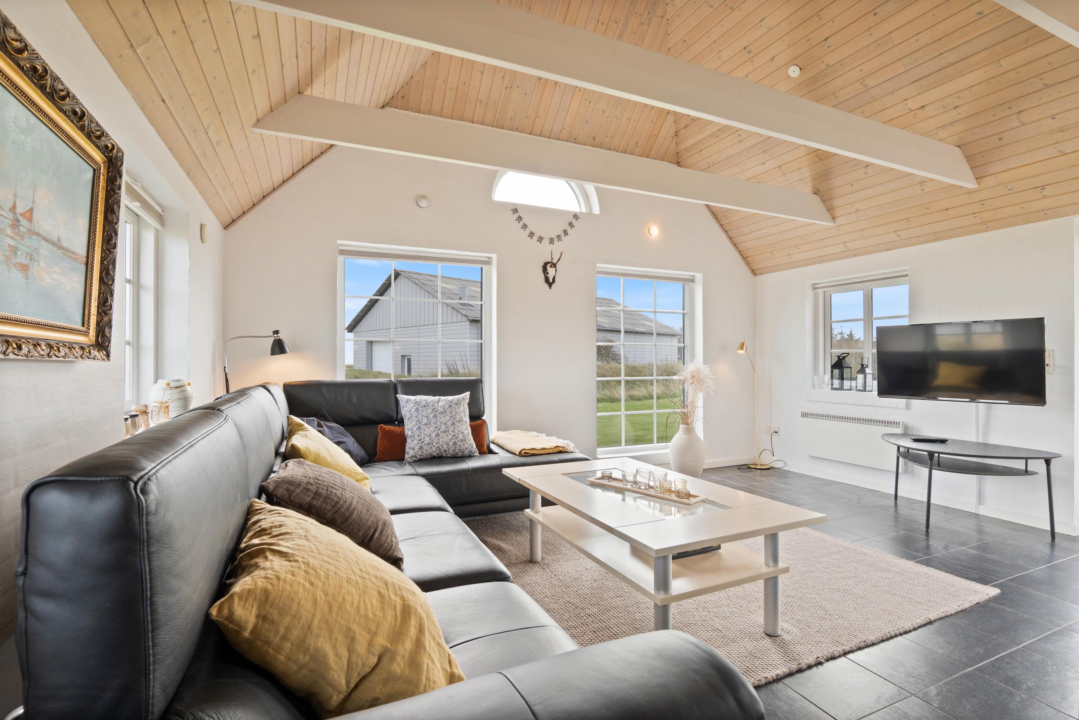 Derudover er der to gode badeværelser, hvoraf det store har både spa og sauna, så I virkelig kan slappe af og få ladt batterierne op. I stuen er der et flot træloft til kip og med synlige bjælker, som giver huset særlig karakter. På køligere dage kan I tænde op i husets brændeovn, som er centralt palceret i boligen.