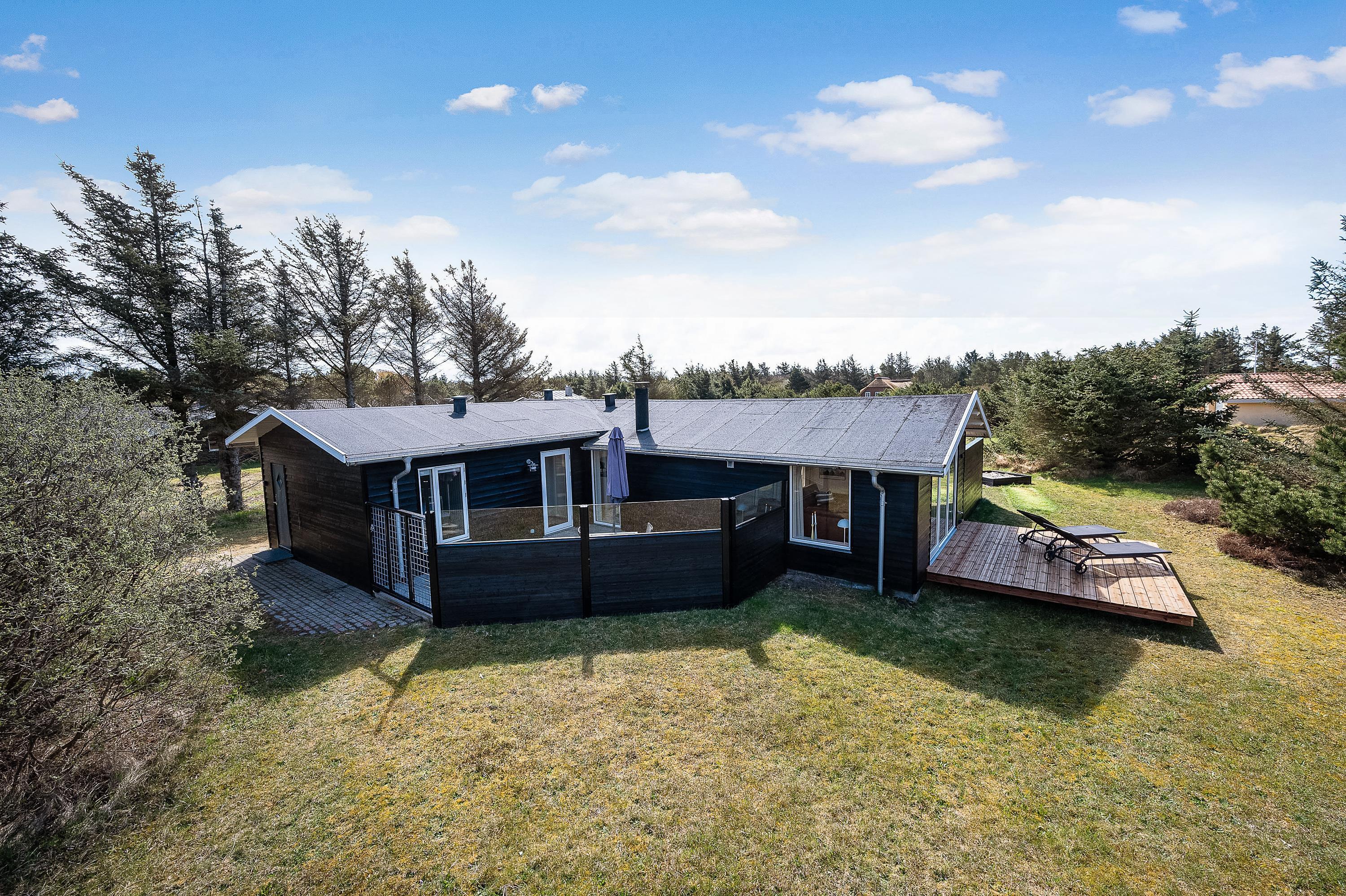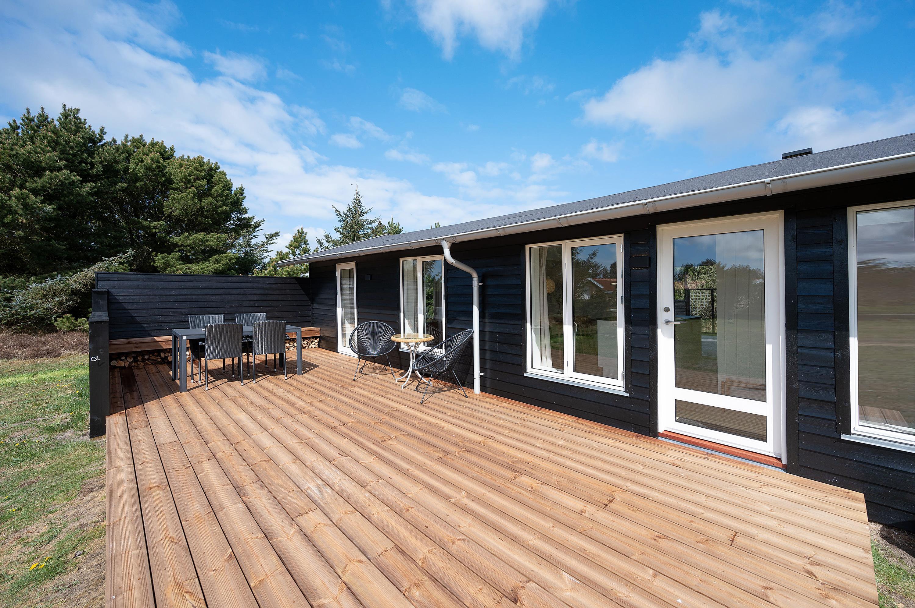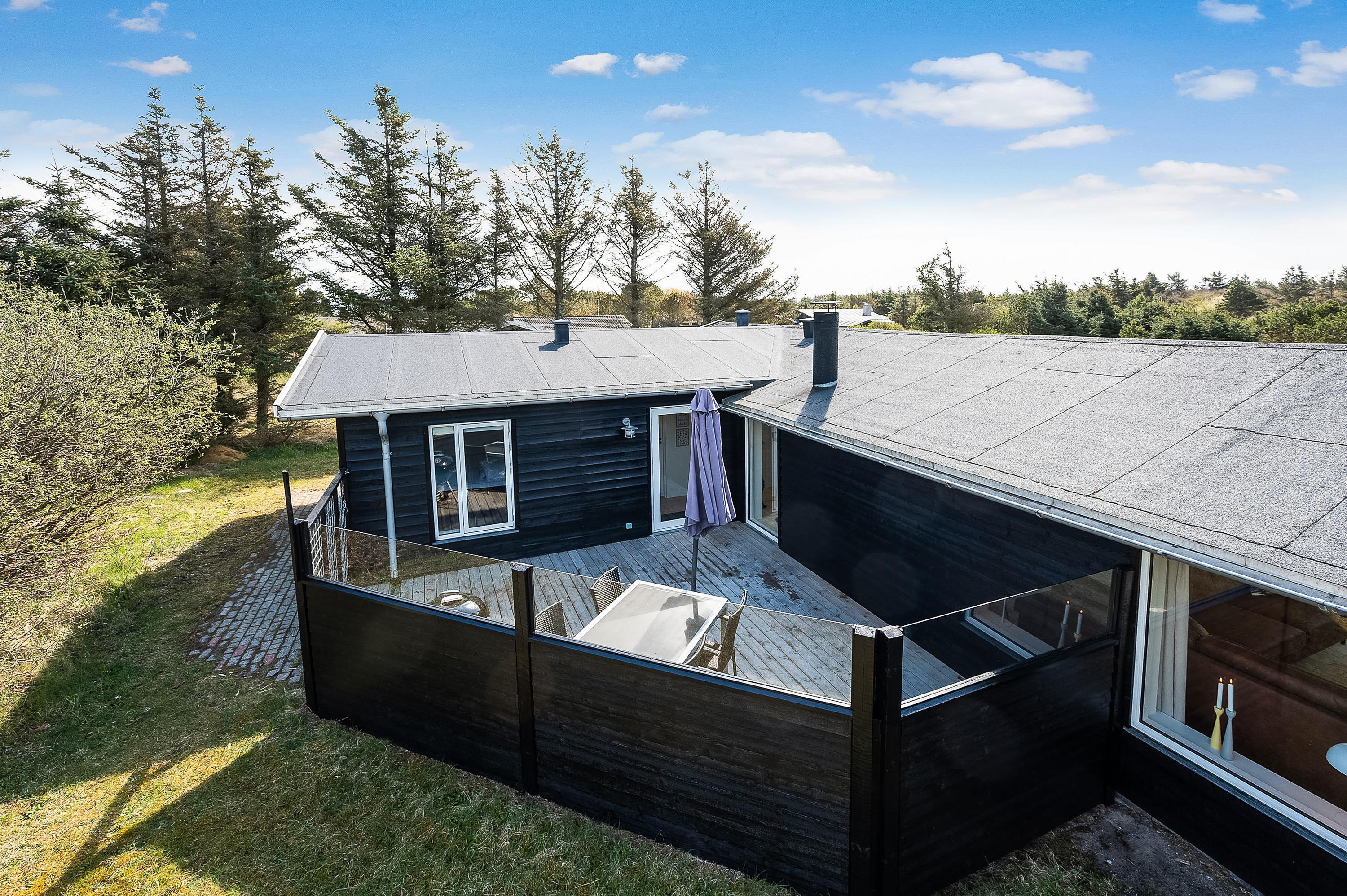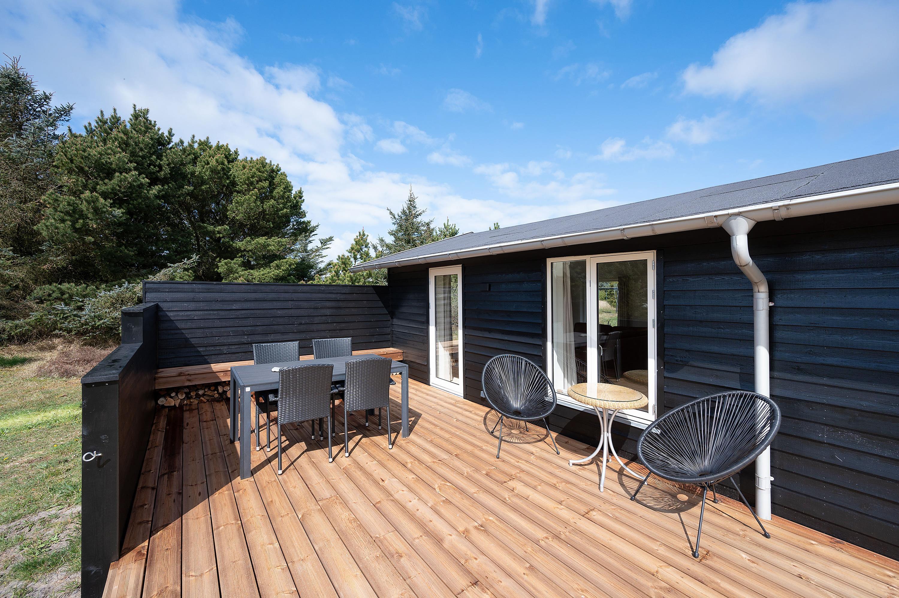 Feriehuset har også en lukket terrasse mod nord og en lille åben terrasse mod vest. I har altså god mulighed for at finde en god plads at nyde ferien fra på de 3 gode terrasser. Om aftenen kan I tænde op i grillen og samles om en lækker middag på én af terrasserne.