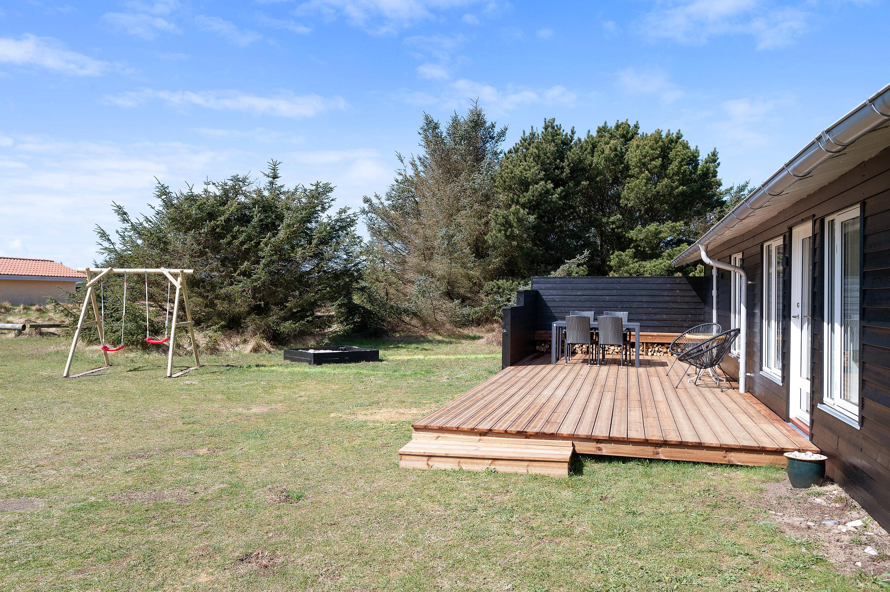 Sommerhuset har hele 3 gode terrasser. På sommerhusets sydside har I en afskærmet terrasse, hvor I kan nyde solen det meste af dagen. Fra denne terrasse kan I også se ud til haven, hvor hunden kan snuse rundt, og børnene har god plads at lege på – og så er der også gyngestativ og sandkasse til dem.