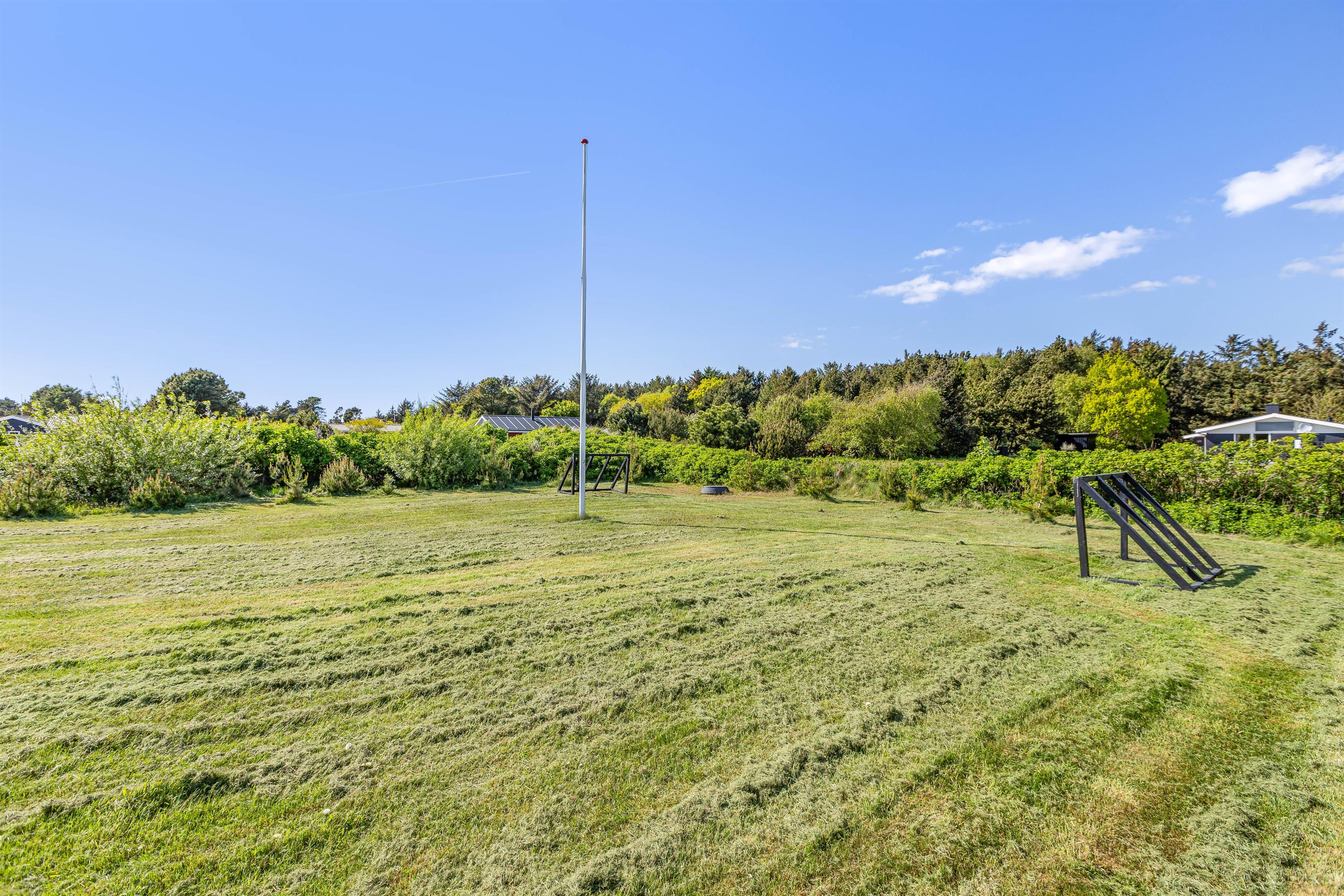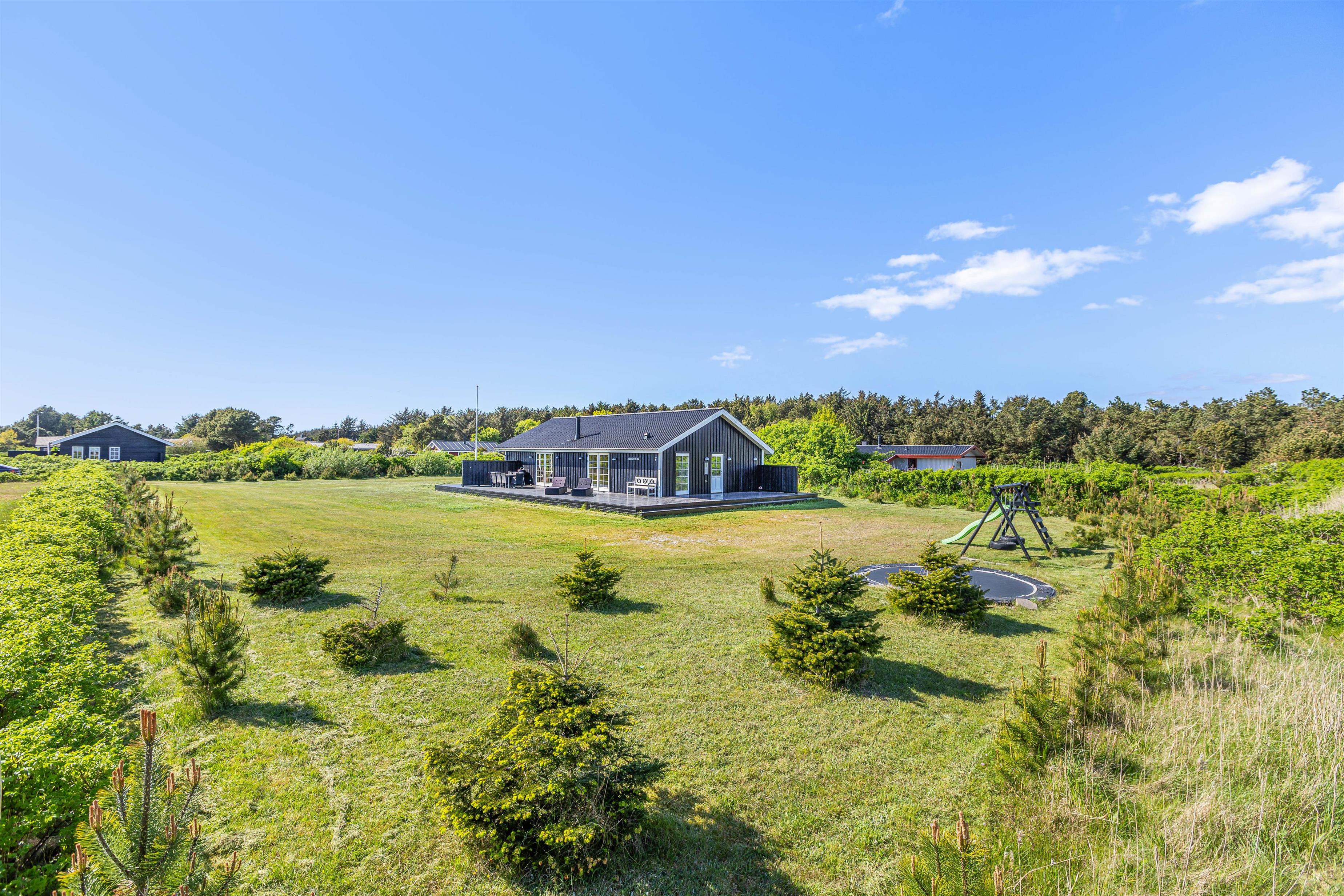 Den lækre træterrasse strækker sig hele vejen rundt om huset. Her kan I følge solen rundt i liggestolene. Sydsiden af terrassen er afskærmet, så I kan sidde og nyde jeres lækre grillmad i læ. Børnene behøver på ingen måde at kede sig i ulvetimen. På den store græsplæne er der både gyngestativ med rutsjebane, trampolin og fodboldmål. Masser af plads til at boltre sig på for børn og barnlige sjæle.
