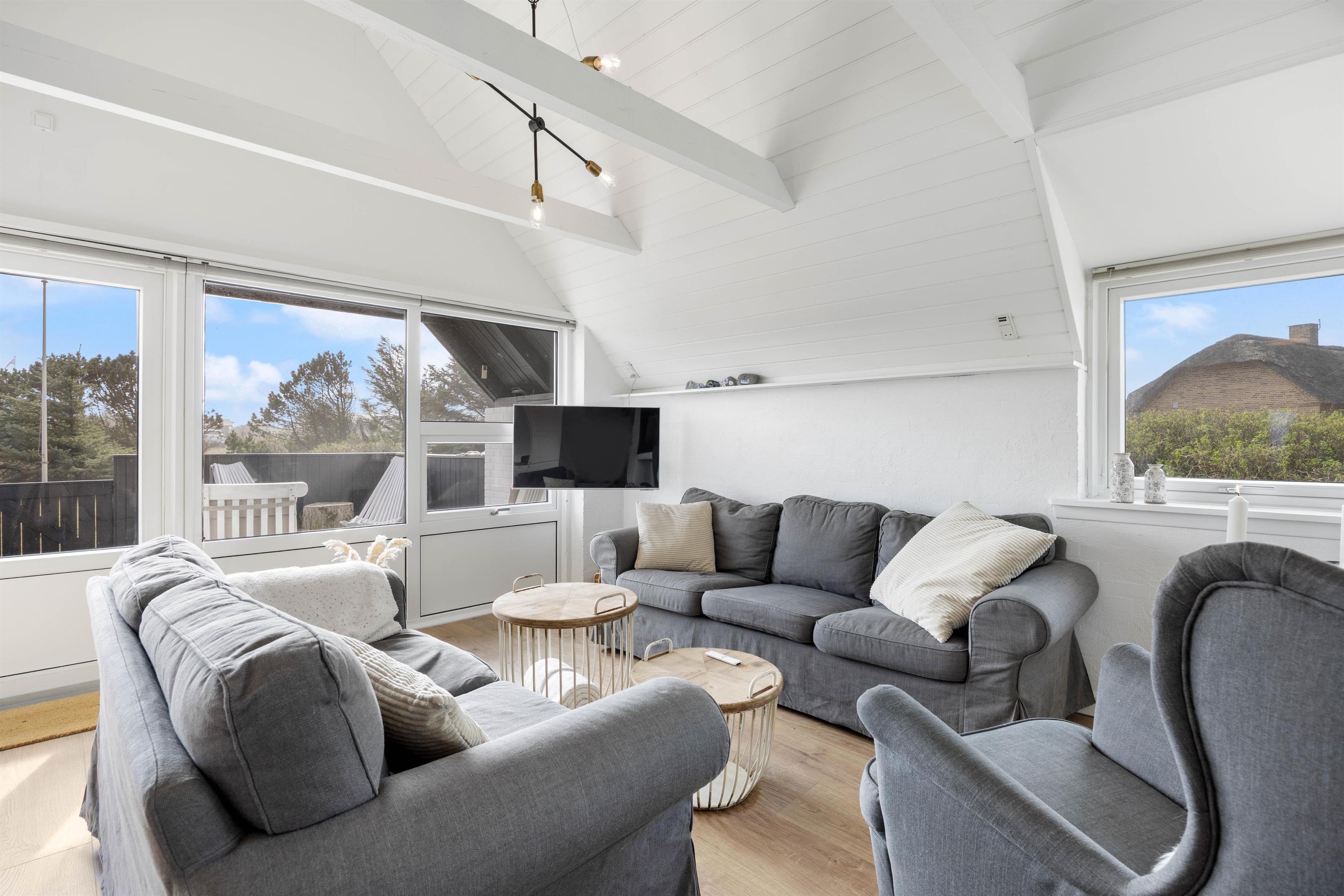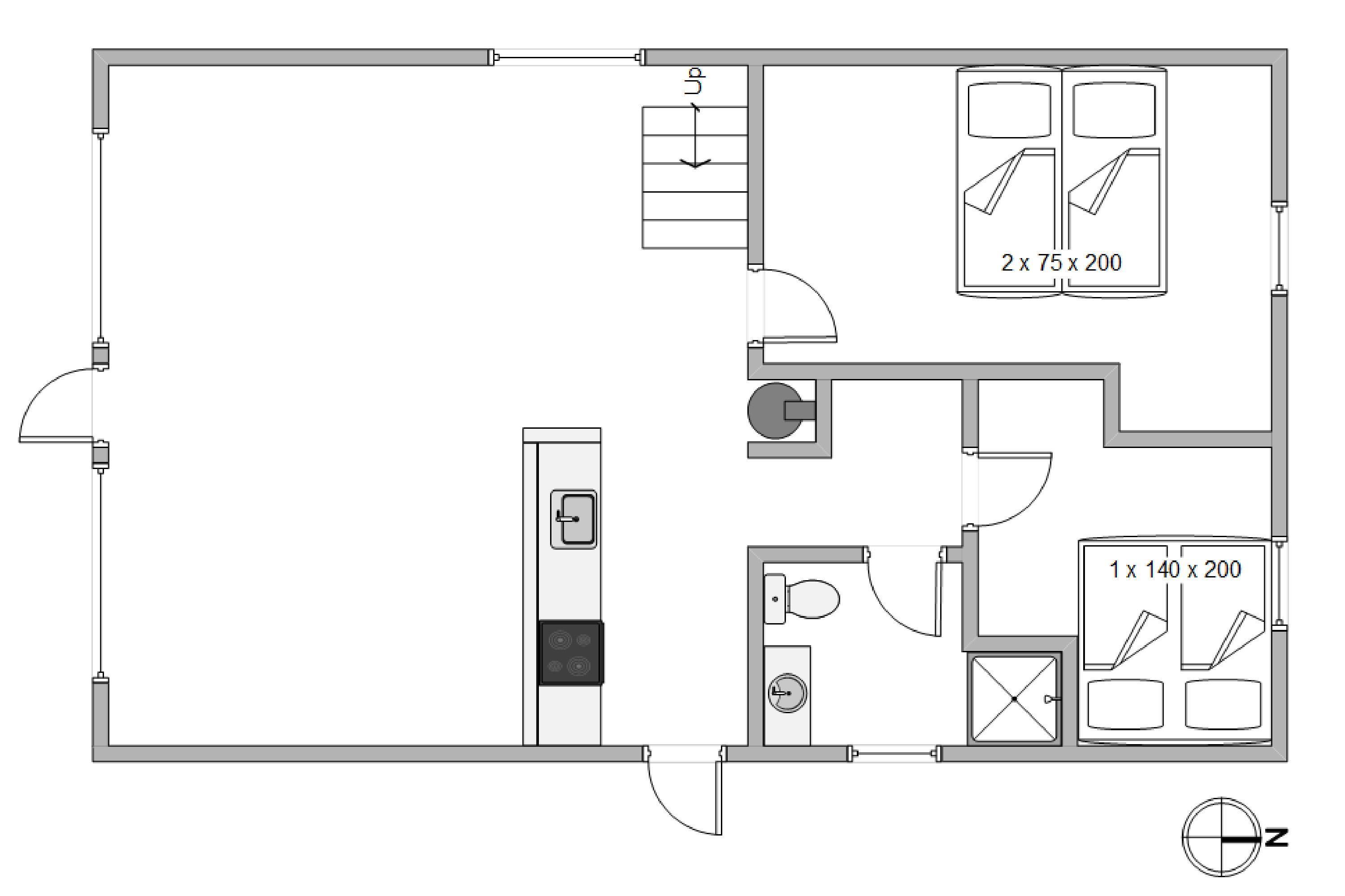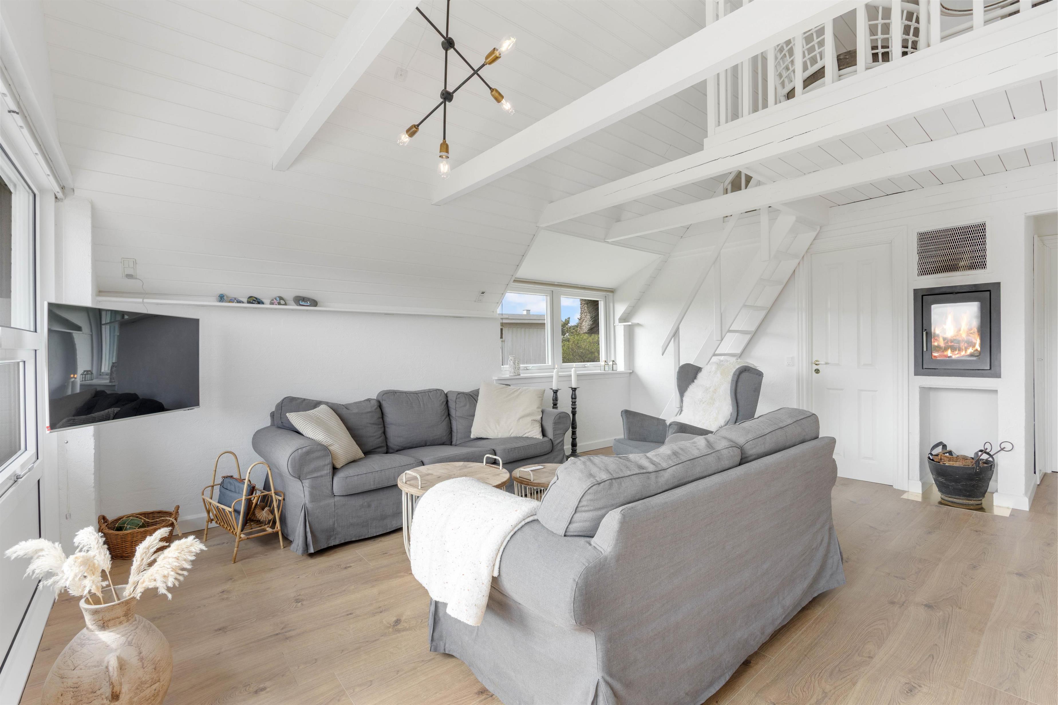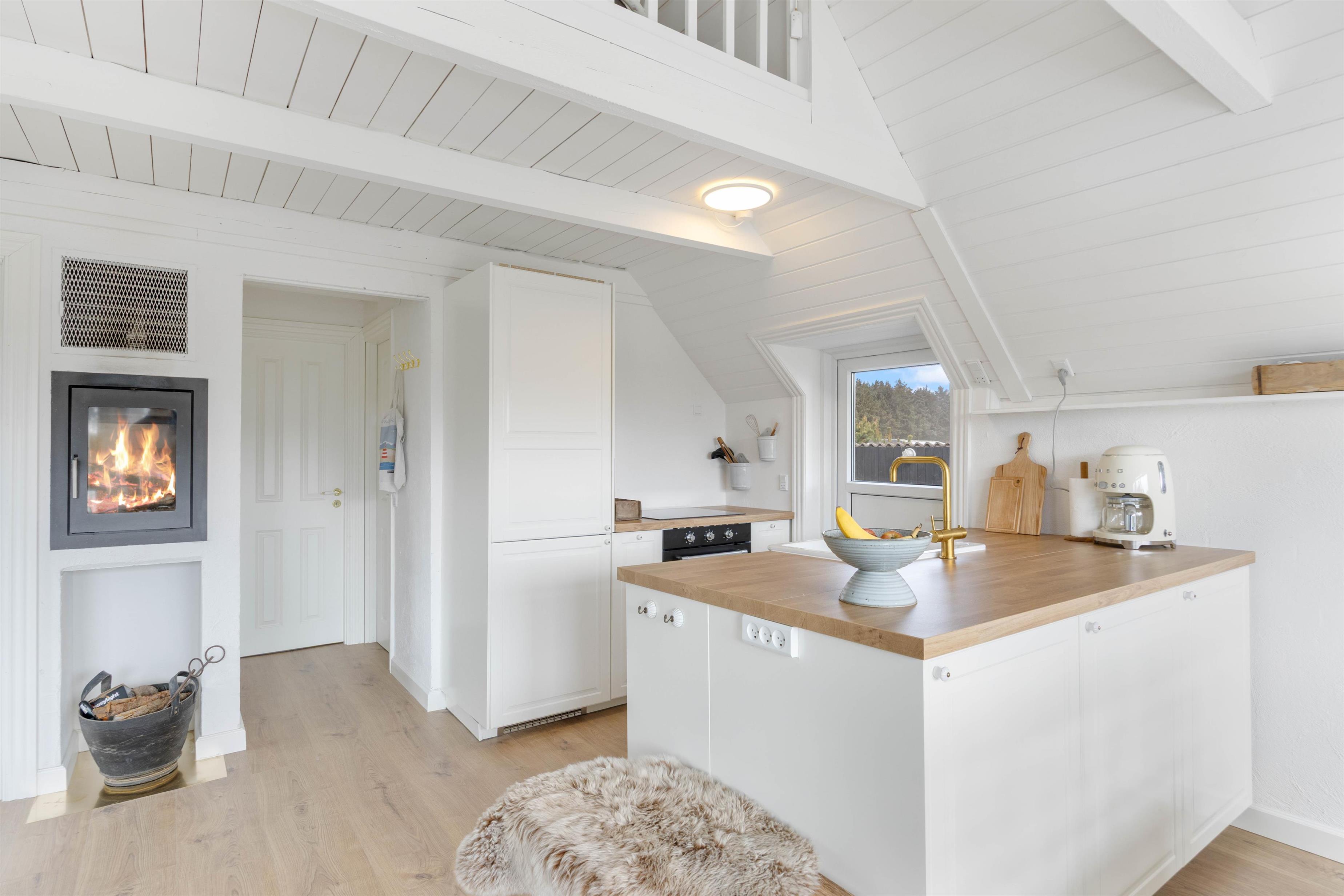 Køkkenet-alrummet er sommerhusets samlingspunkt og her emmer af hygge og afslapning. Stuen er dejligt indrettet og brændeovnen skaber en hyggelig atmosfære. Køkkenet er veludstyret med køleskab med fryseboks, mikrobølgeovn og opvaskemaskine. Fra stuen er der adgang til en lille hems med et fjernsyn og en seng. Her kan børnene hygge sig med “hulestemning”, mens I slapper af i stuen.