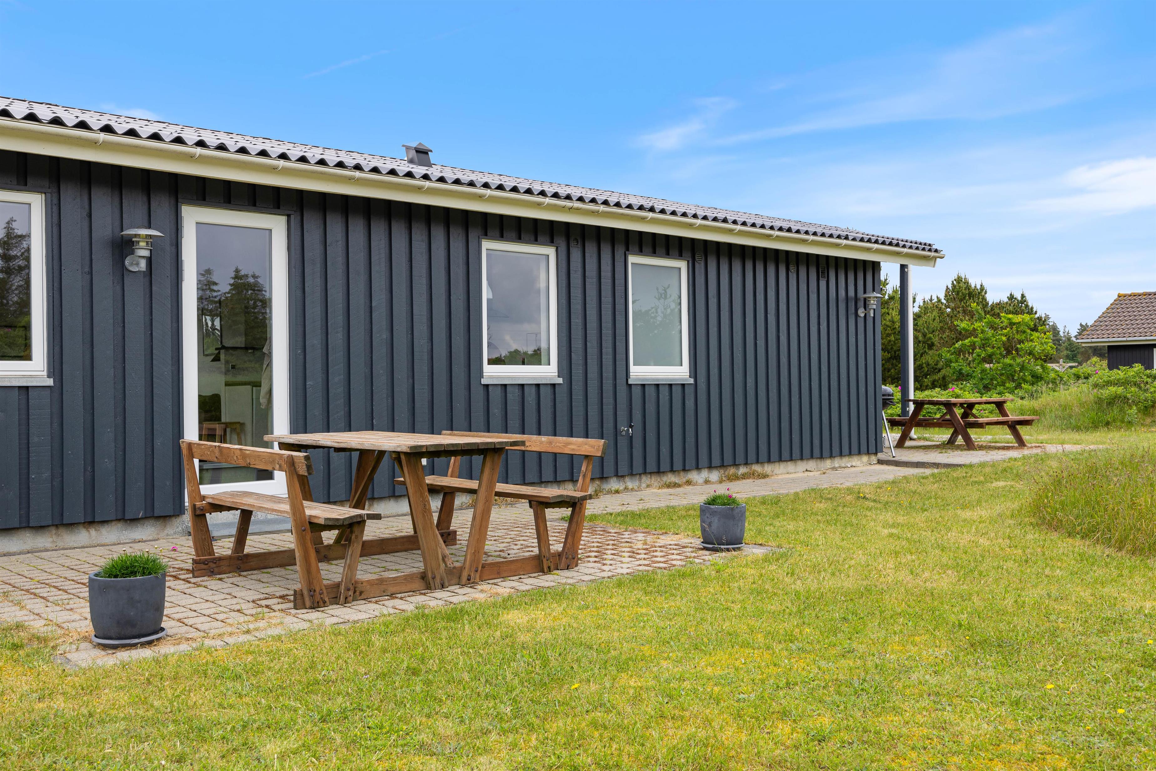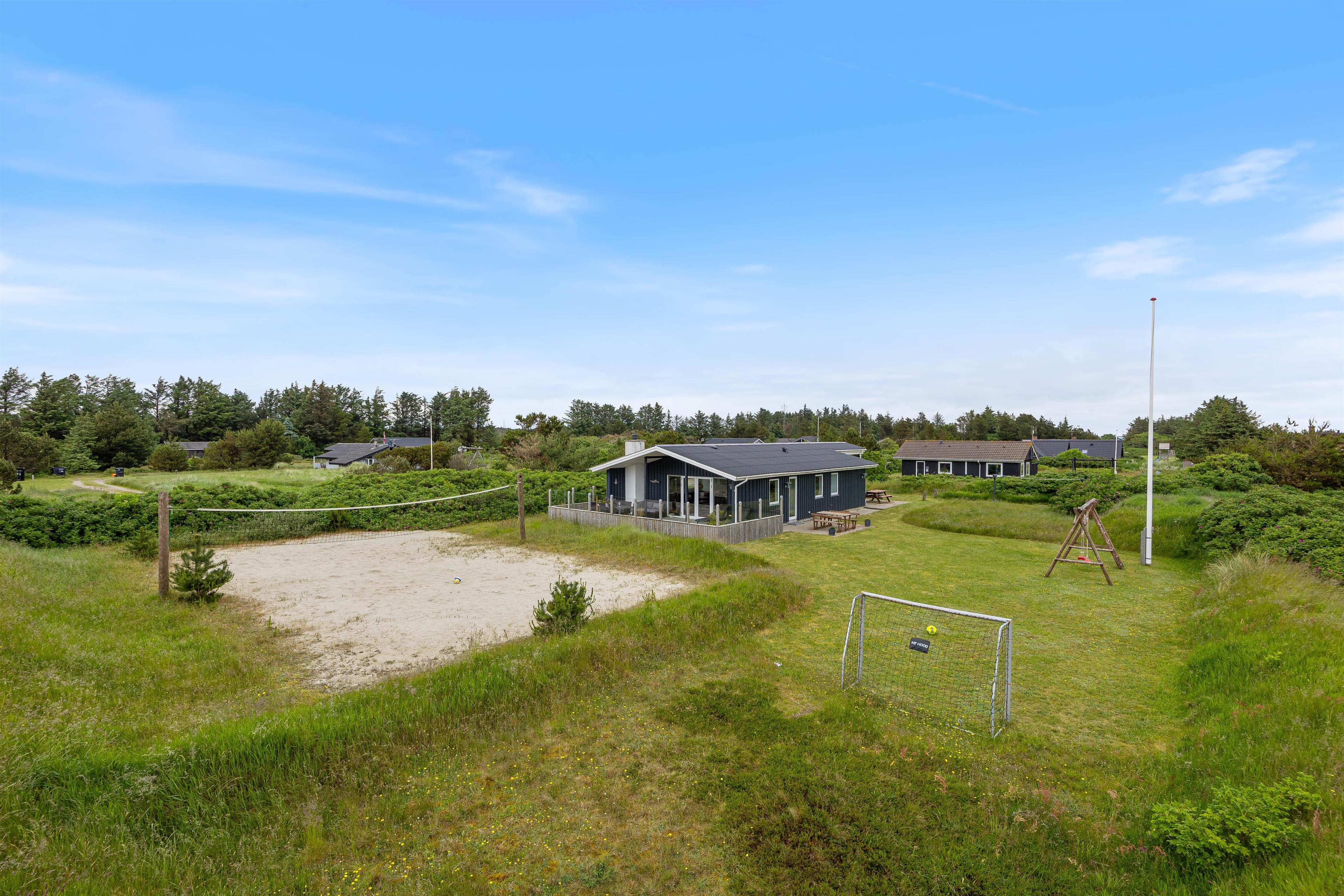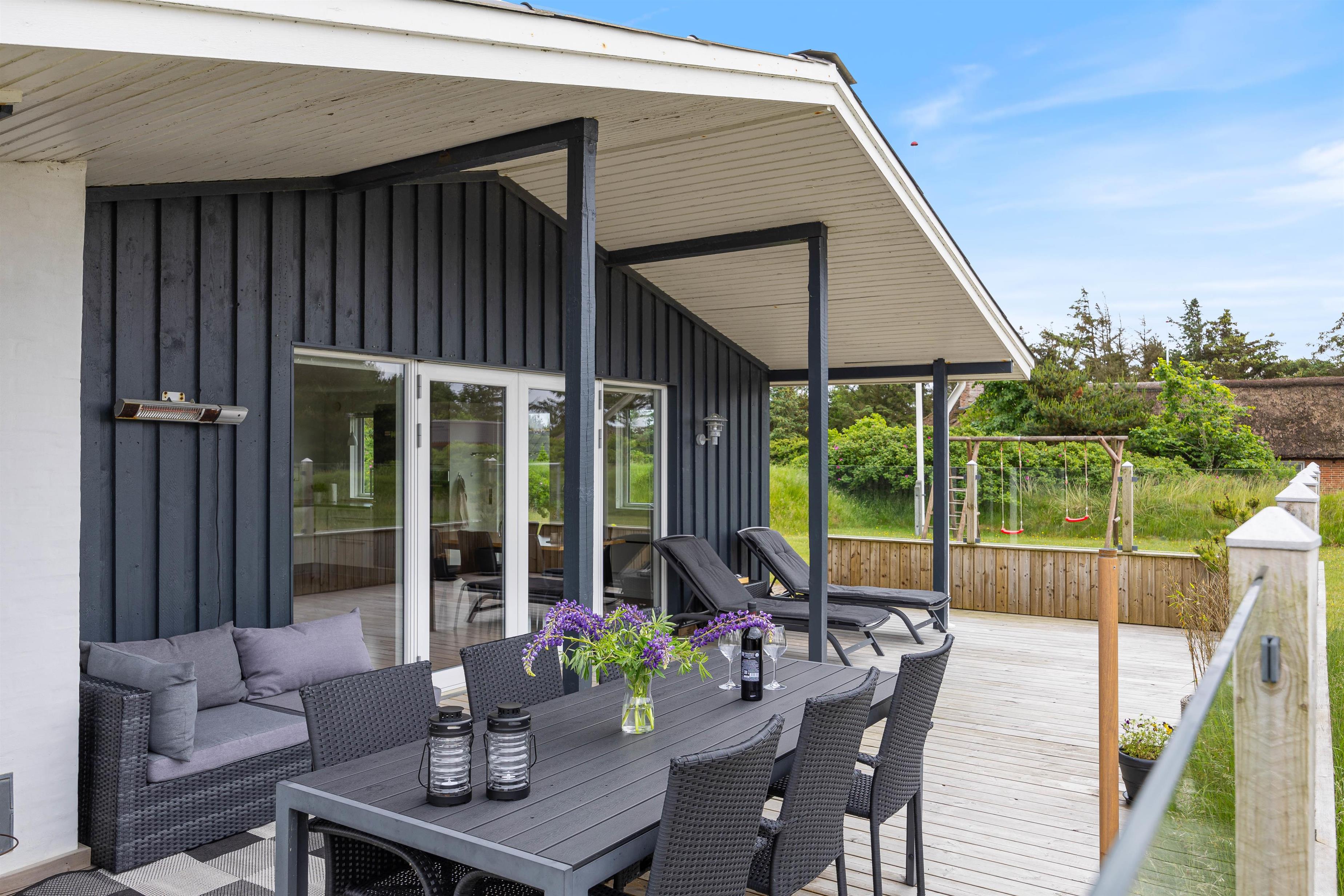 Udenfor finder I en dejlig terrasse, som er delvist overdækket. Her kan I sidde og nyde solen, imens børnene leger på naturgrunden hvor der er en gynge og volleyballbane. Når vejret byder op til det, kan I rykke aftensmaden udenfor og lave et lækkert måltid på sommerhusets grill.