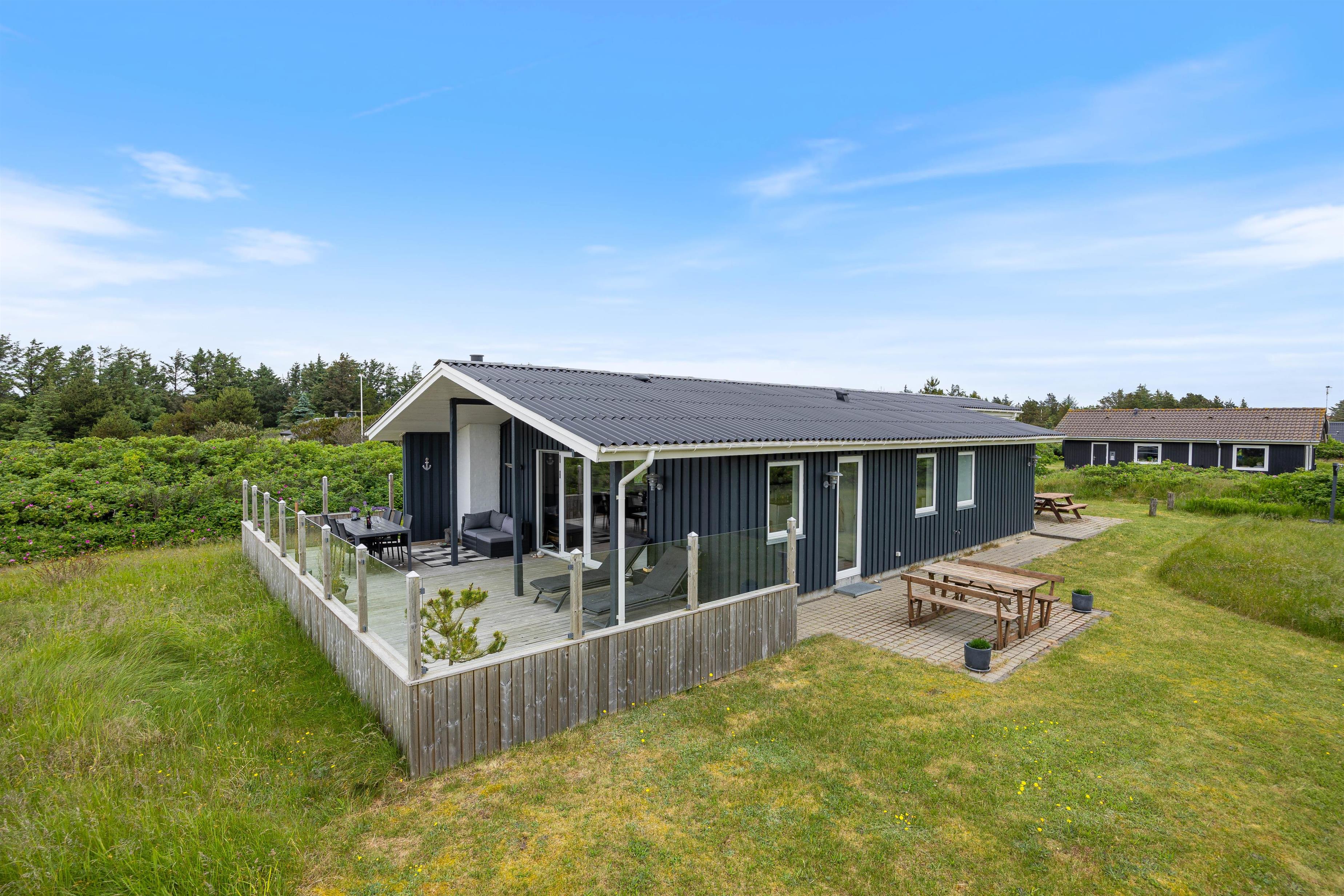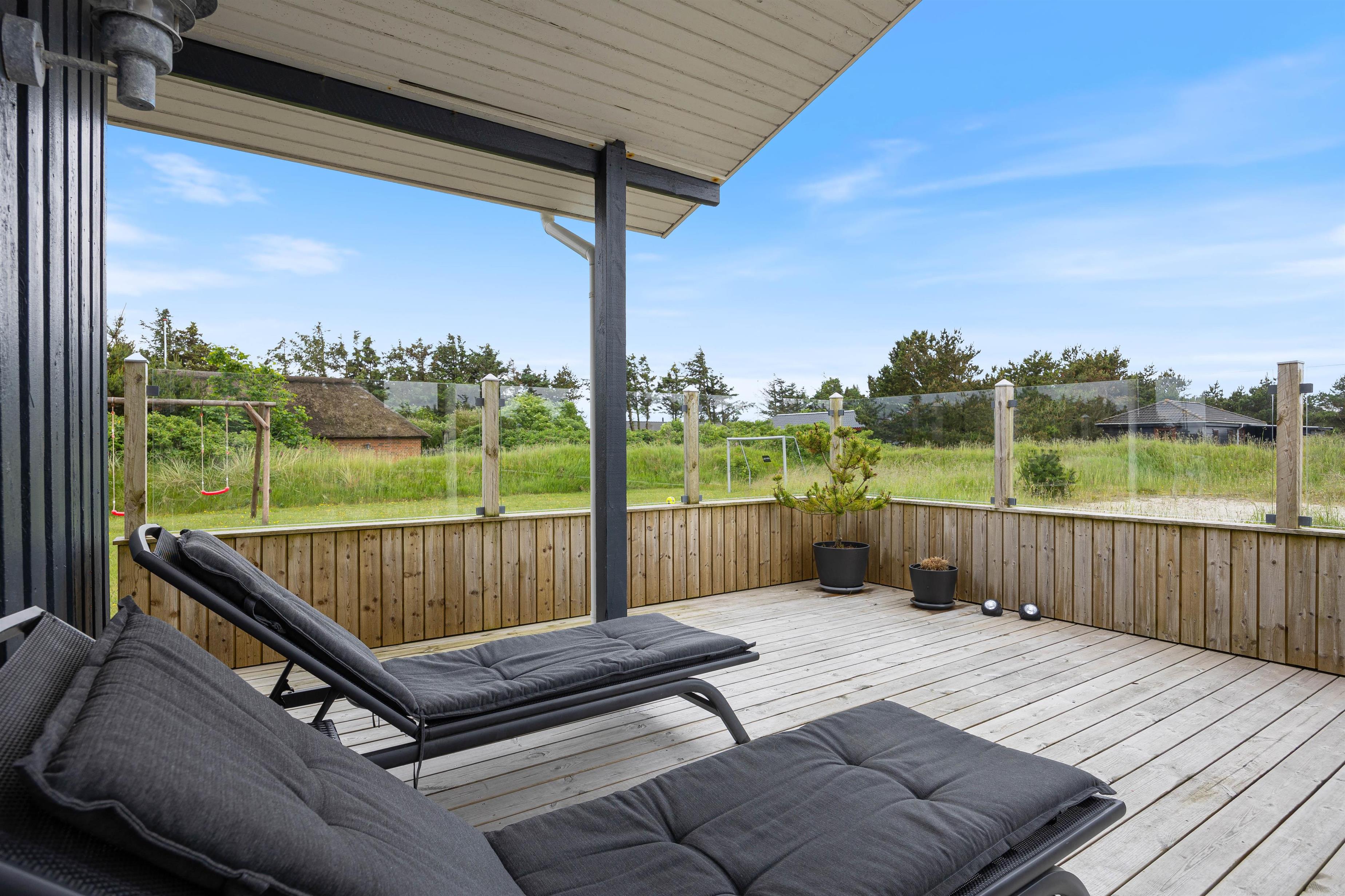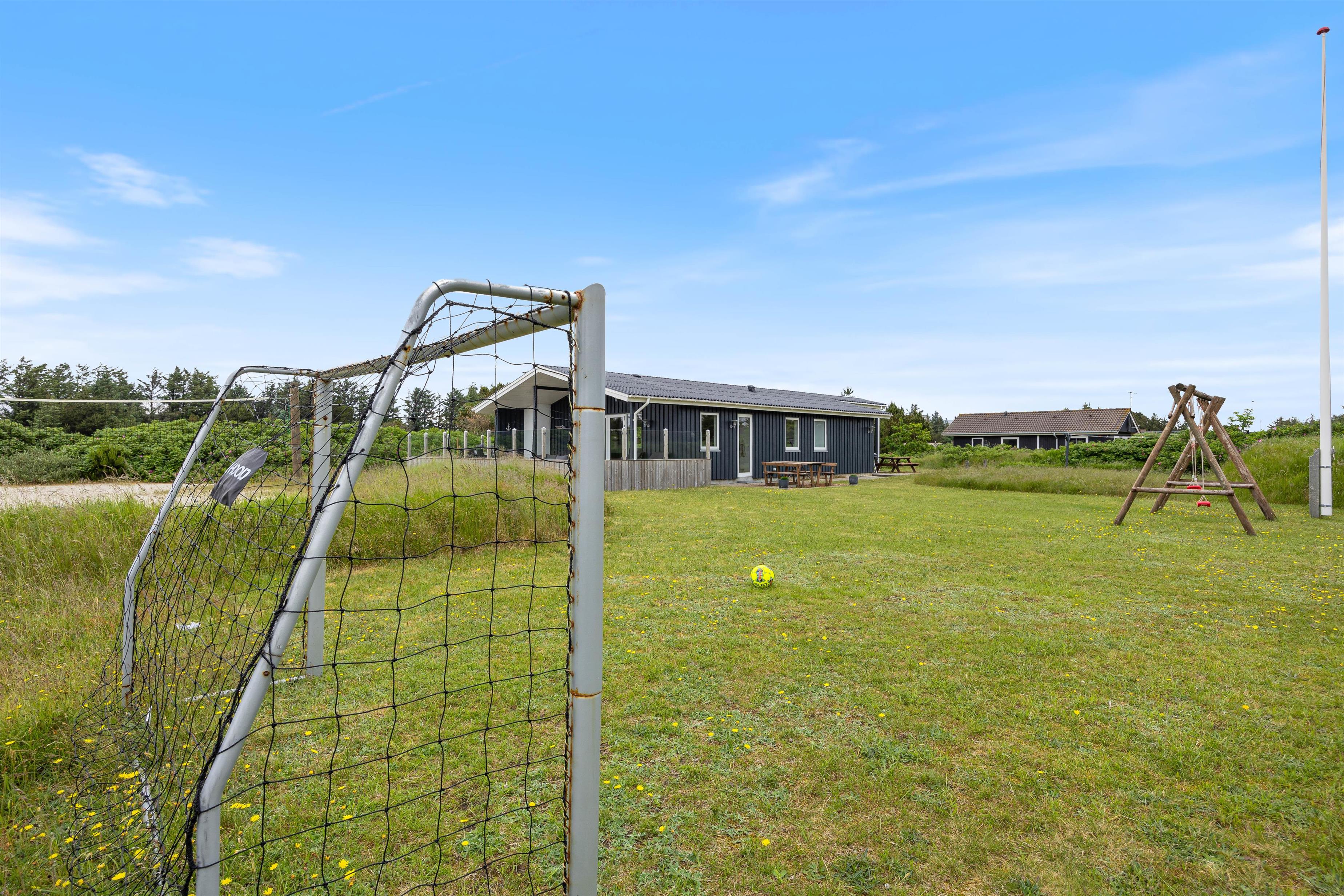 Udenfor finder I en dejlig terrasse, som er delvist overdækket. Her kan I sidde og nyde solen, imens børnene leger på naturgrunden hvor der er en gynge og volleyballbane. Når vejret byder op til det, kan I rykke aftensmaden udenfor og lave et lækkert måltid på sommerhusets grill.