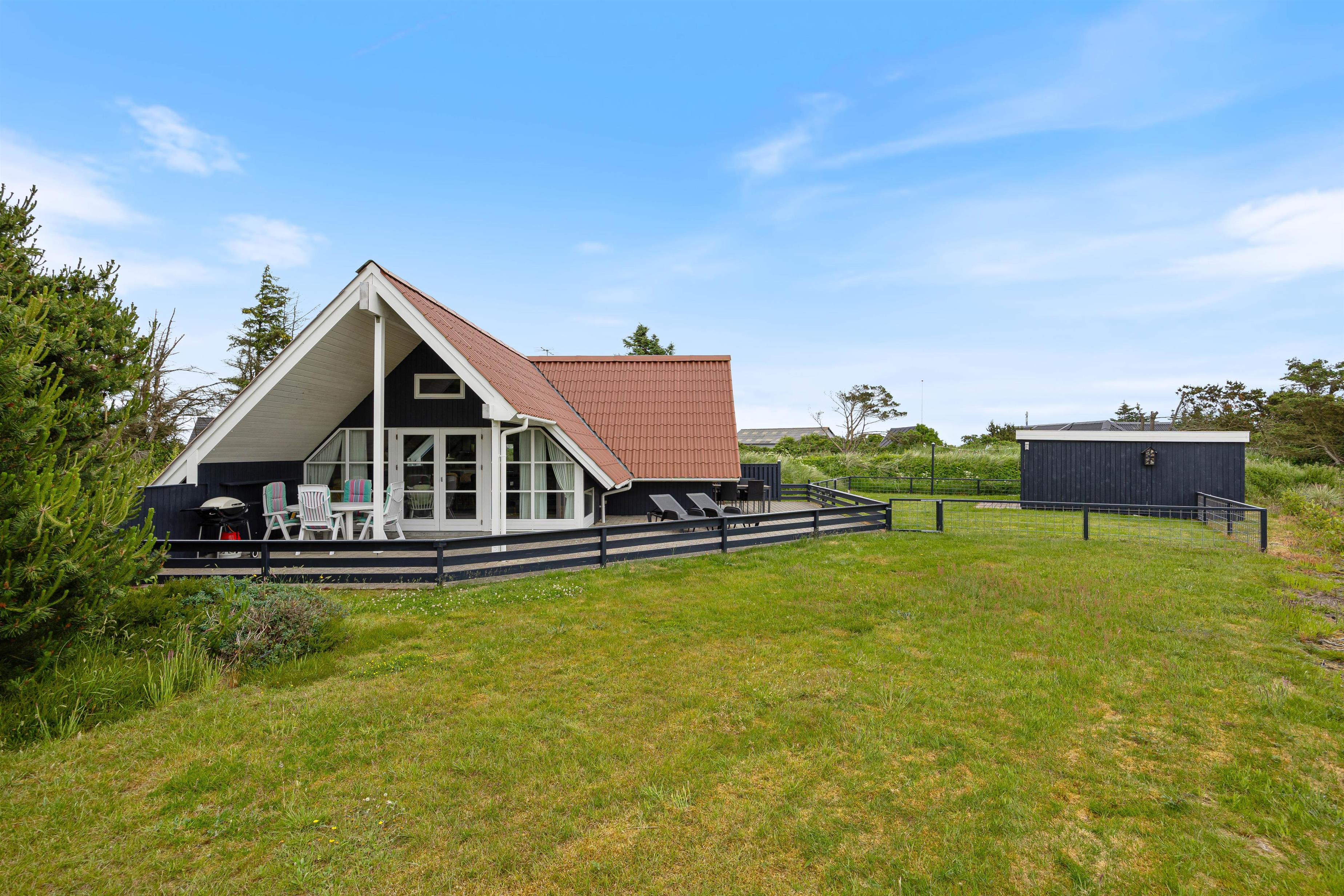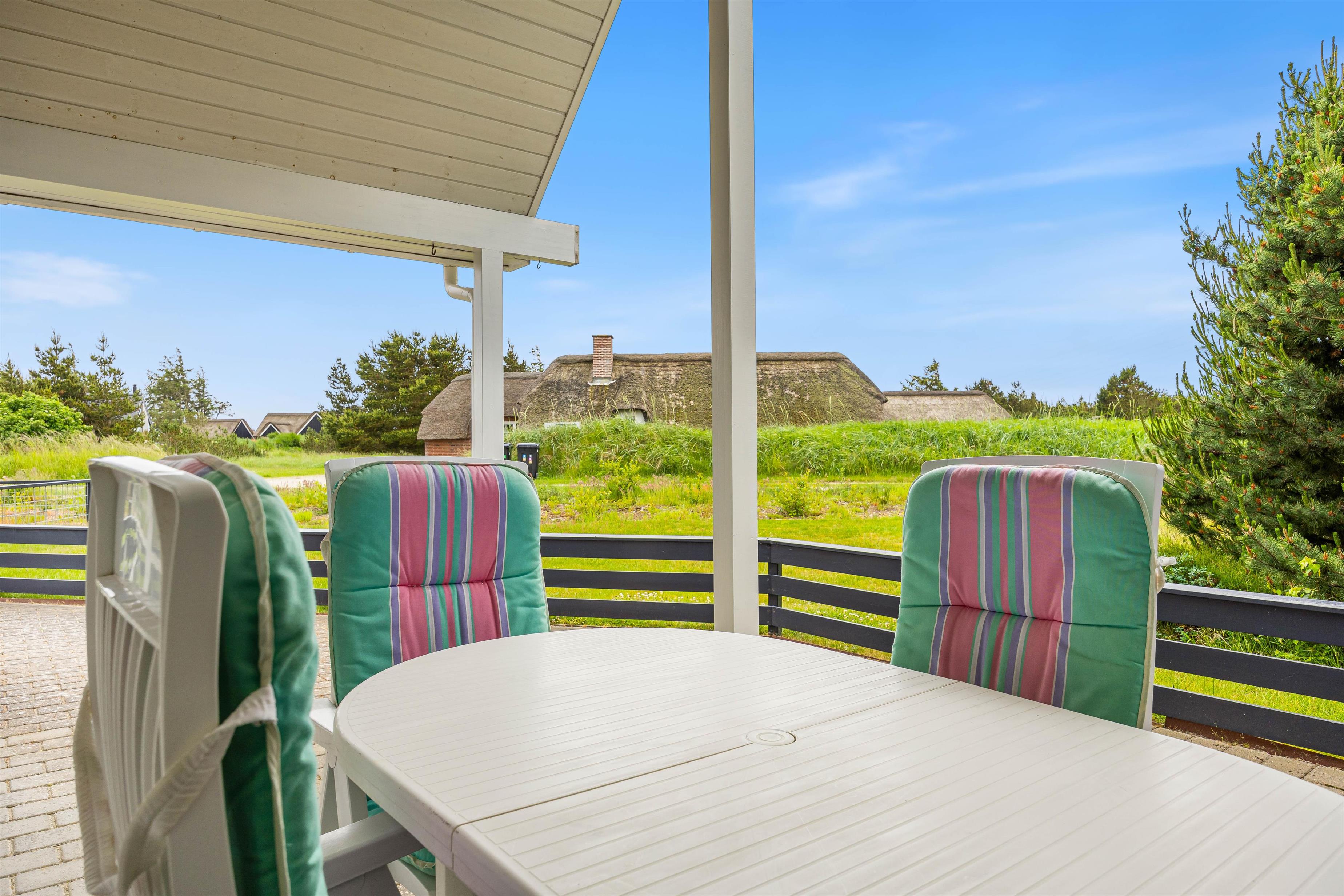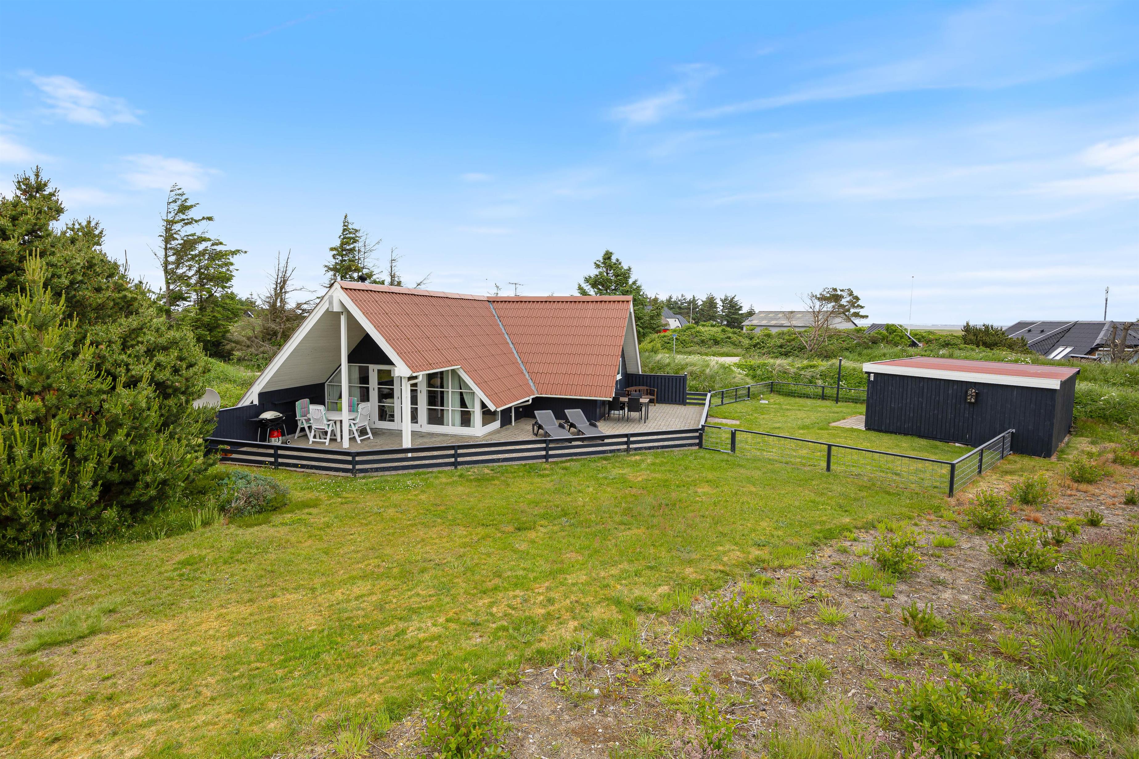Udenfor finder I en dejlig stor terrasse, som både er åben, afskærmet og overdækket. Sæt jer i de dejlige havemøbler og nyd den skønne udsigt udover den store naturgrund, som sommerhuset ligger på. På en dejlig lun sommeraften kan I grille aftensmaden på sommerhusets gasgrill, imens I nyder den friske vesterhavsluft.