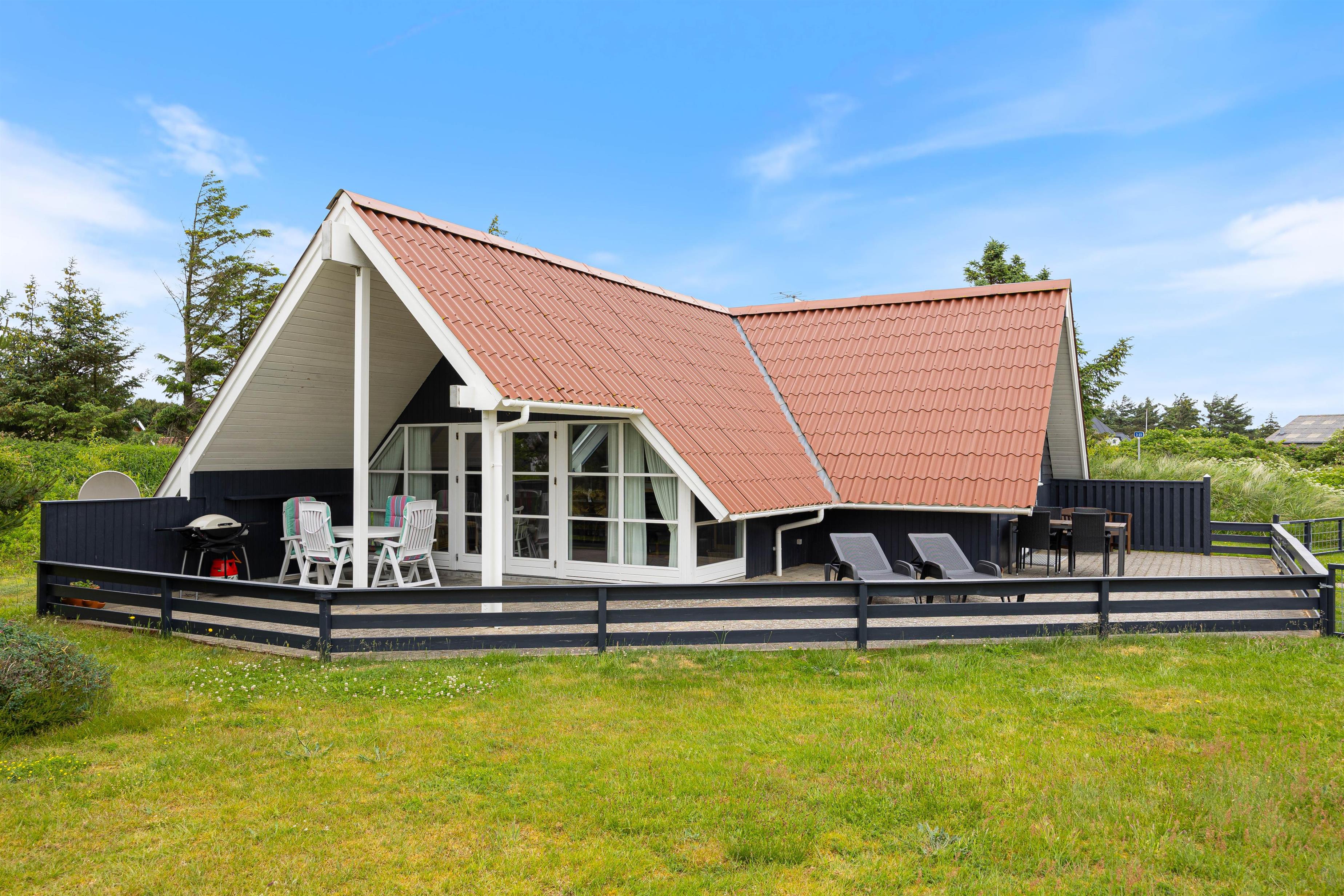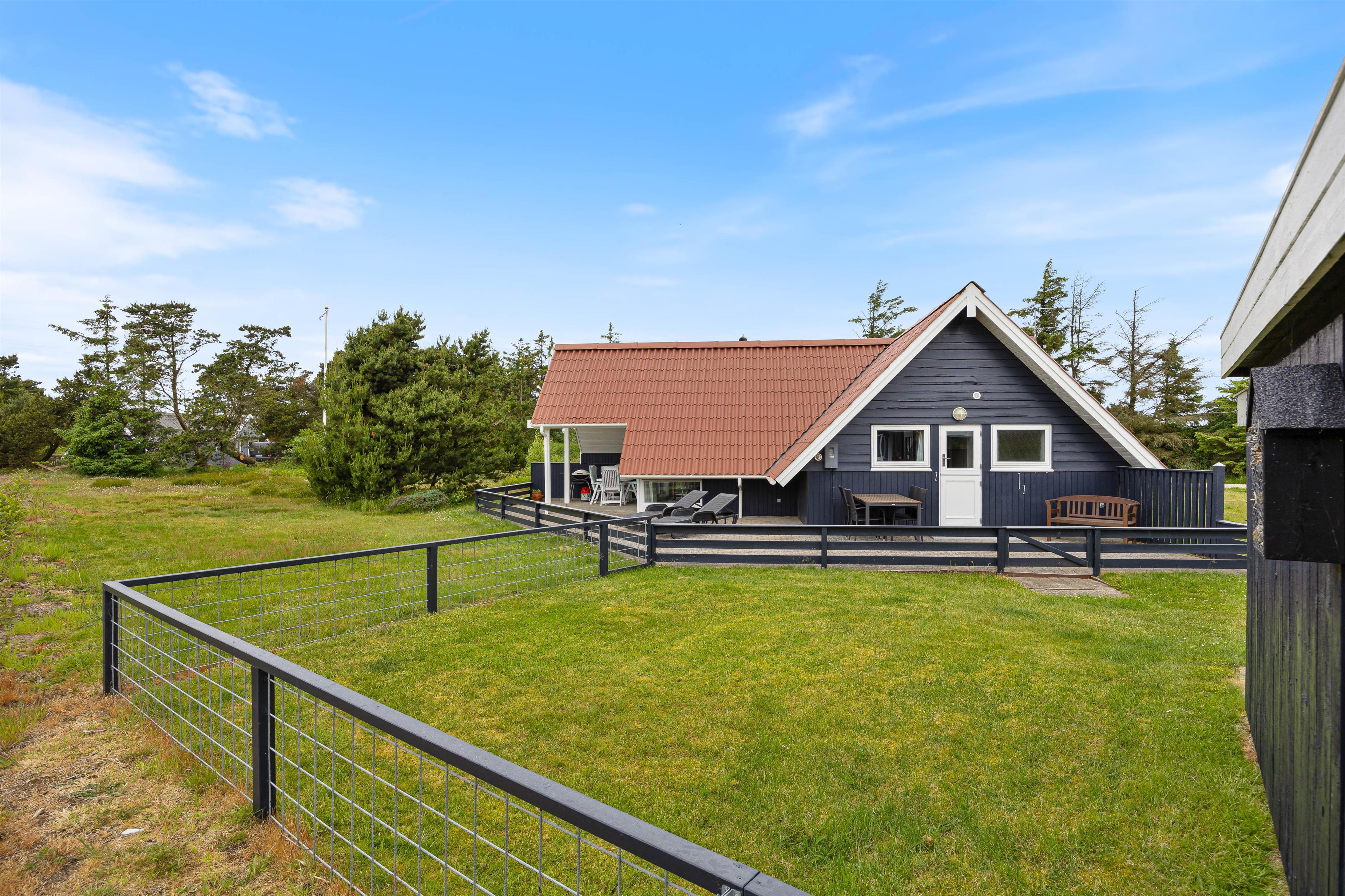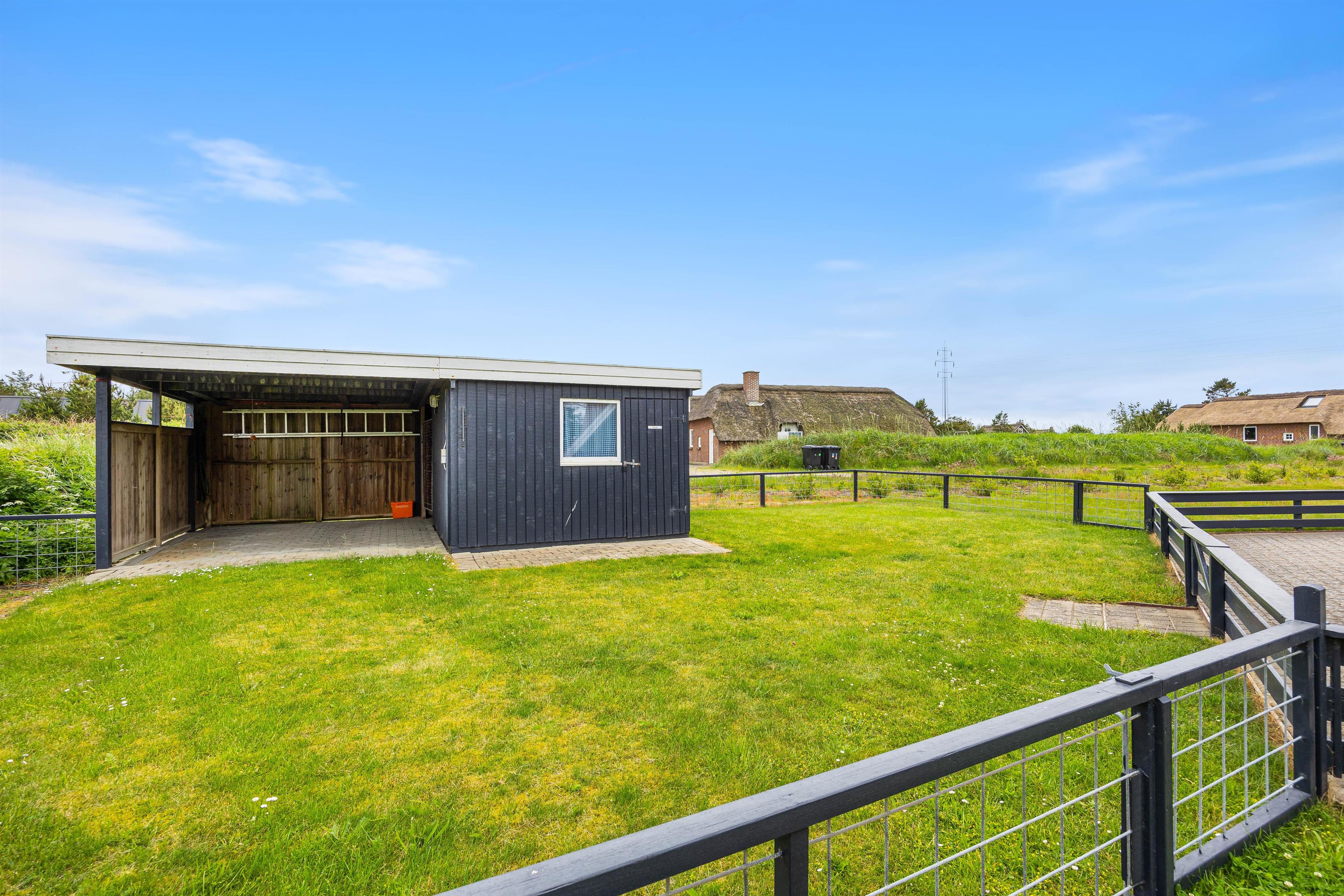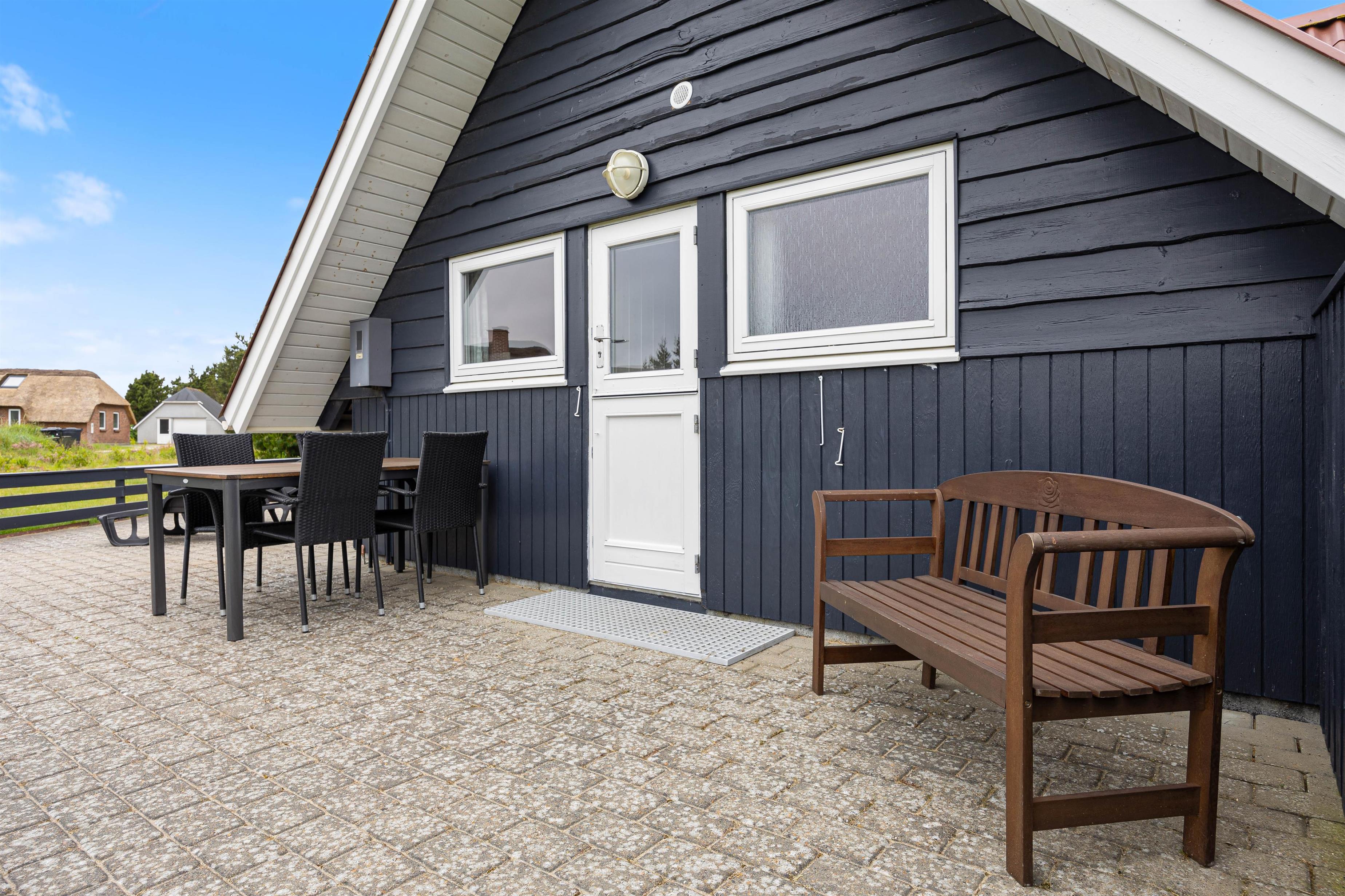 Udenfor finder I en dejlig stor terrasse, som både er åben, afskærmet og overdækket. Sæt jer i de dejlige havemøbler og nyd den skønne udsigt udover den store naturgrund, som sommerhuset ligger på. På en dejlig lun sommeraften kan I grille aftensmaden på sommerhusets gasgrill, imens I nyder den friske vesterhavsluft.