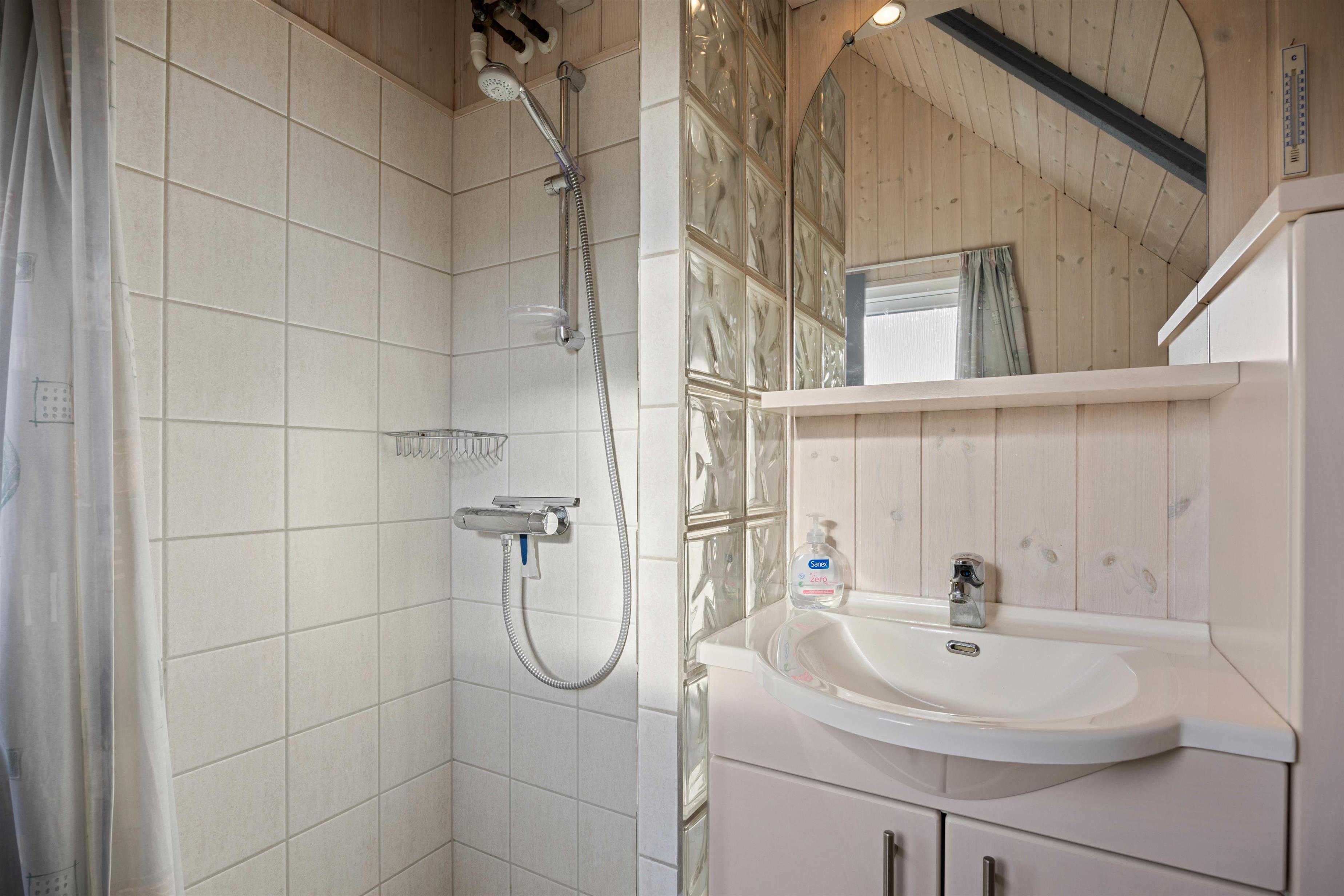 De 4 sovepladser er fordelt på 2 soverum, hvor der er en dobbeltseng og en køjeseng med 2 køjer. Derudover finder I også et badeværelse med gulvvarme i sommerhuset.