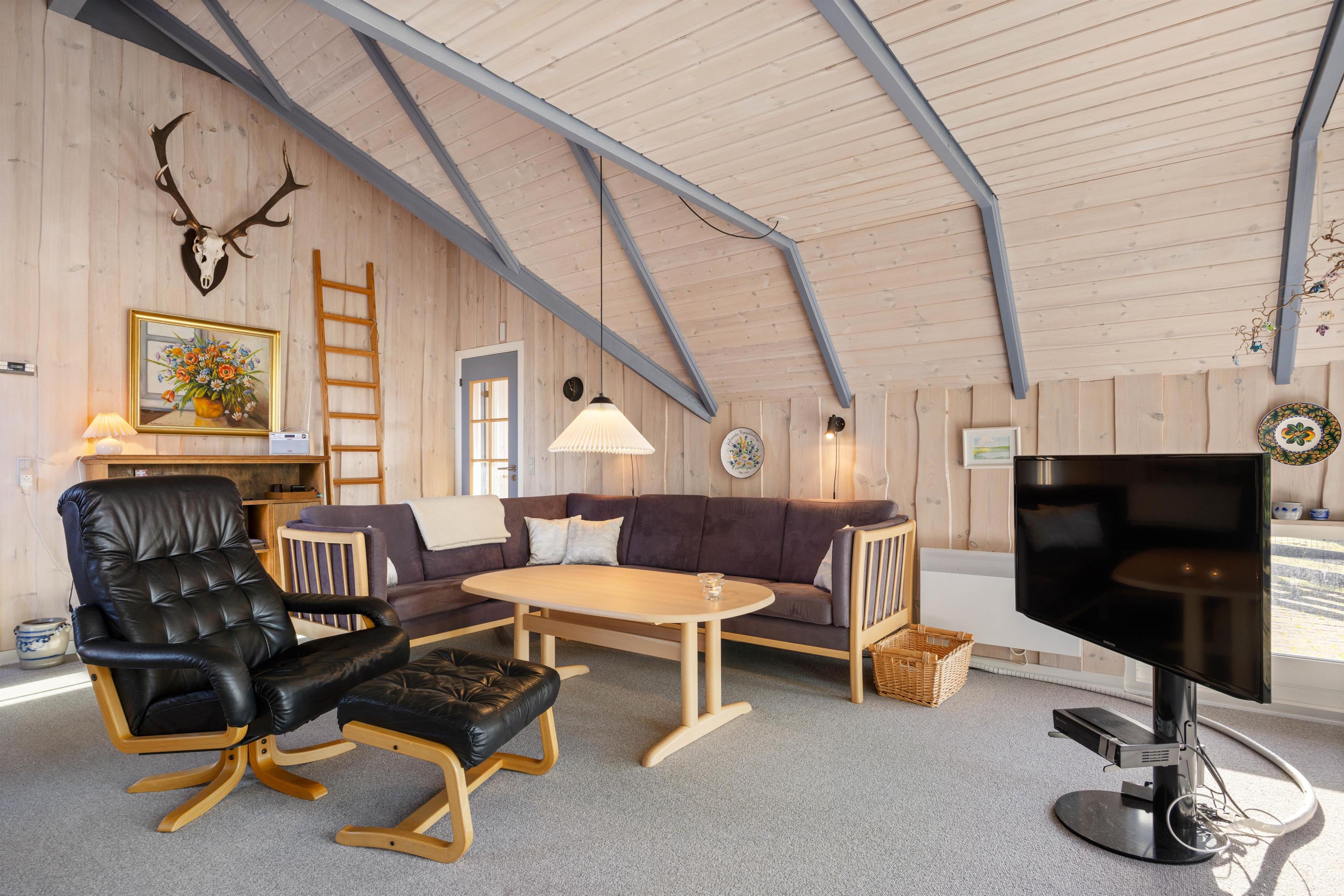 Når I træder ind ad hoveddøren, vil I med det samme blive mødt af sommerhusets hyggelige atmosfære. Trævæggene og -loftet danner en hyggelig atmosfære, som er med til at gøre jeres ferie dejlig og afslappende. Læn jer tilbage i de dejlige stole eller sofaen og nyd lydene fra den knitrende brændeovn, som vil skabe en dejlig varme i sommerhuset. Der er også en varmepumpe i sommerhuset, som er med til at holde sommerhuset varmt på de kolde dage.
