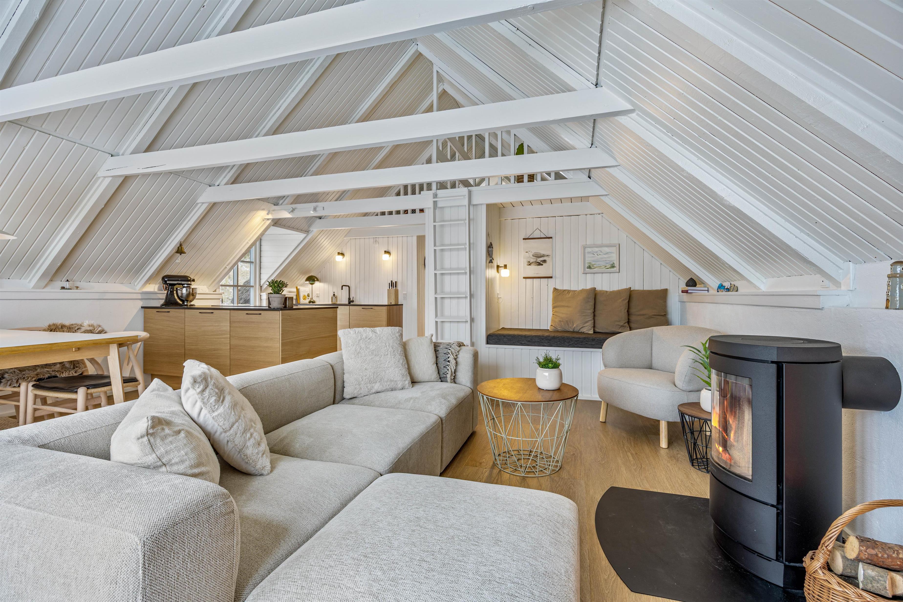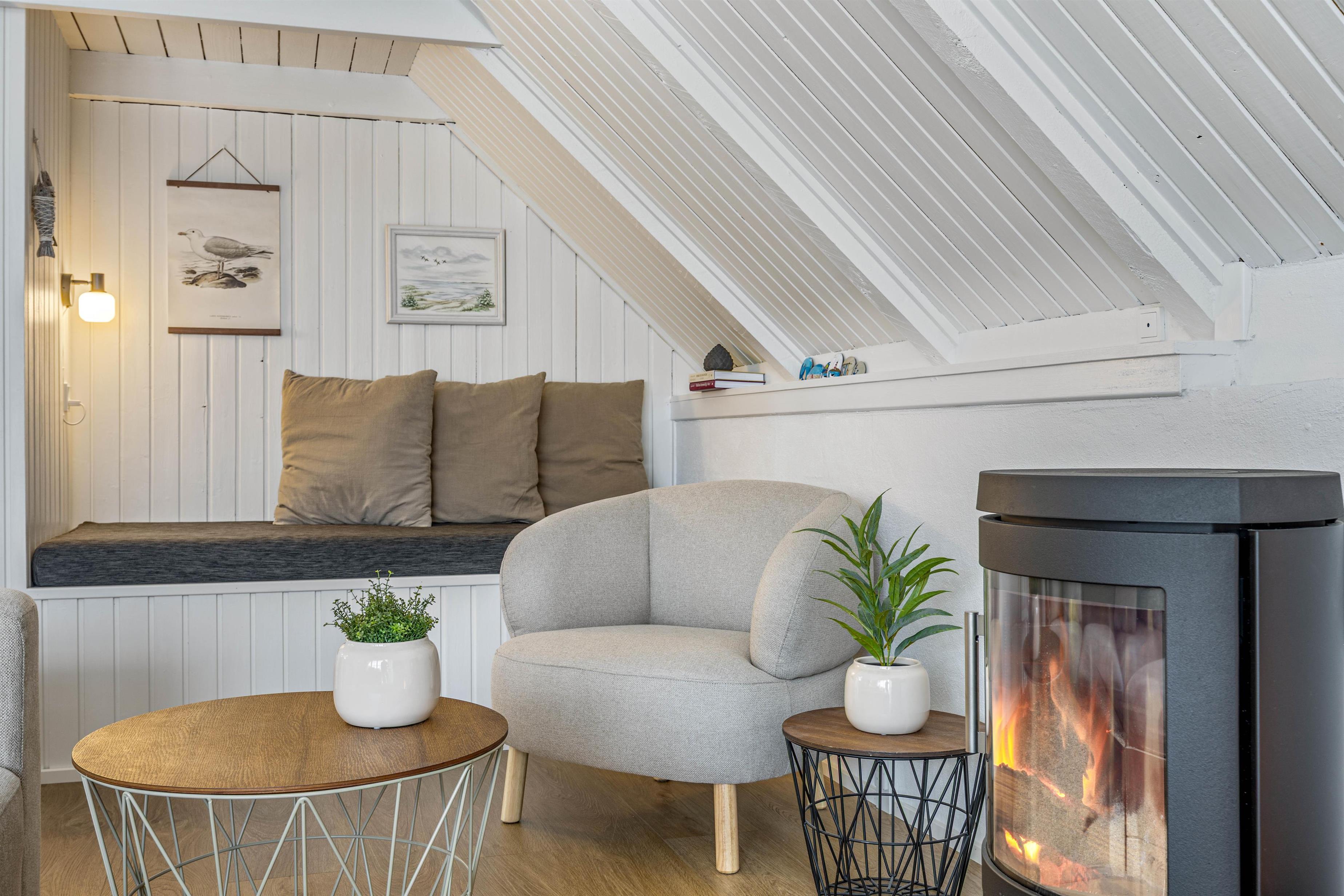 Indenfor venter jer et lyst og indbydende sommerhus med synlige bjælker og en hyggelig atmosfære. Stuen ligger i åben forbindelse med køkken og spiseplads, så I kan nyde samværet, mens maden tilberedes eller brætspillene findes frem. Brændeovnen skaber ekstra hygge på kølige aftener, og varmepumpen sørger for en behagelig temperatur året rundt.