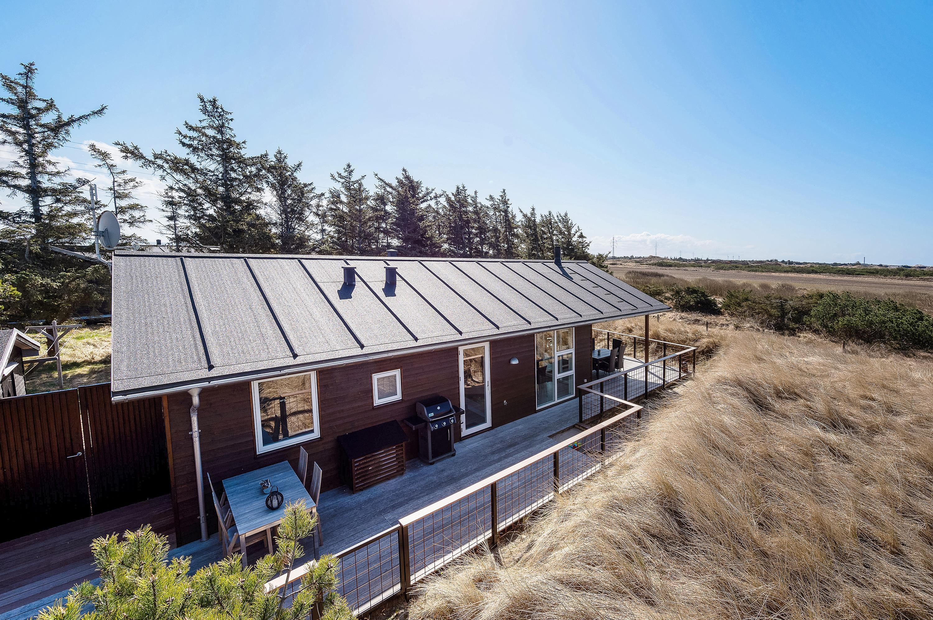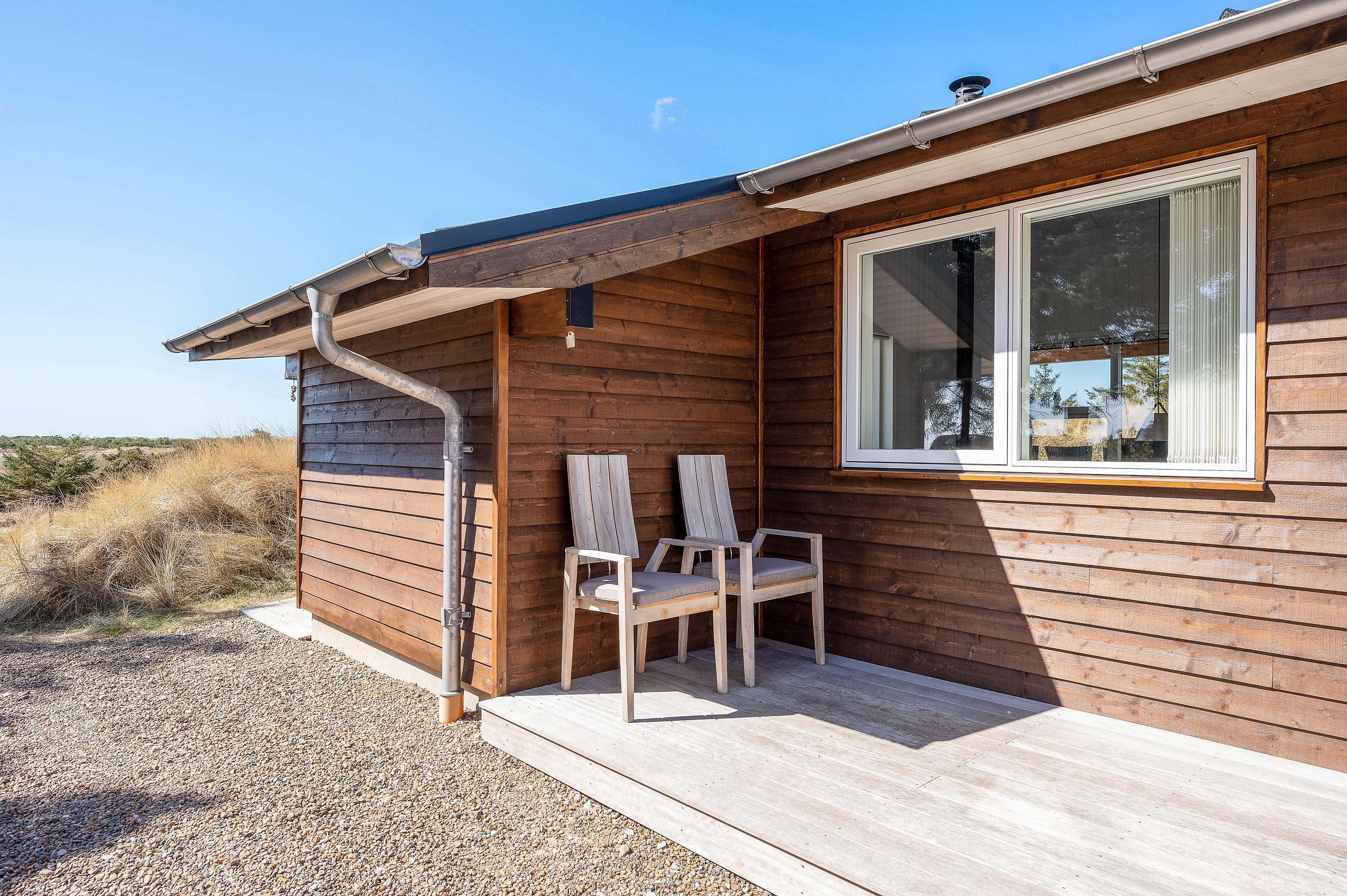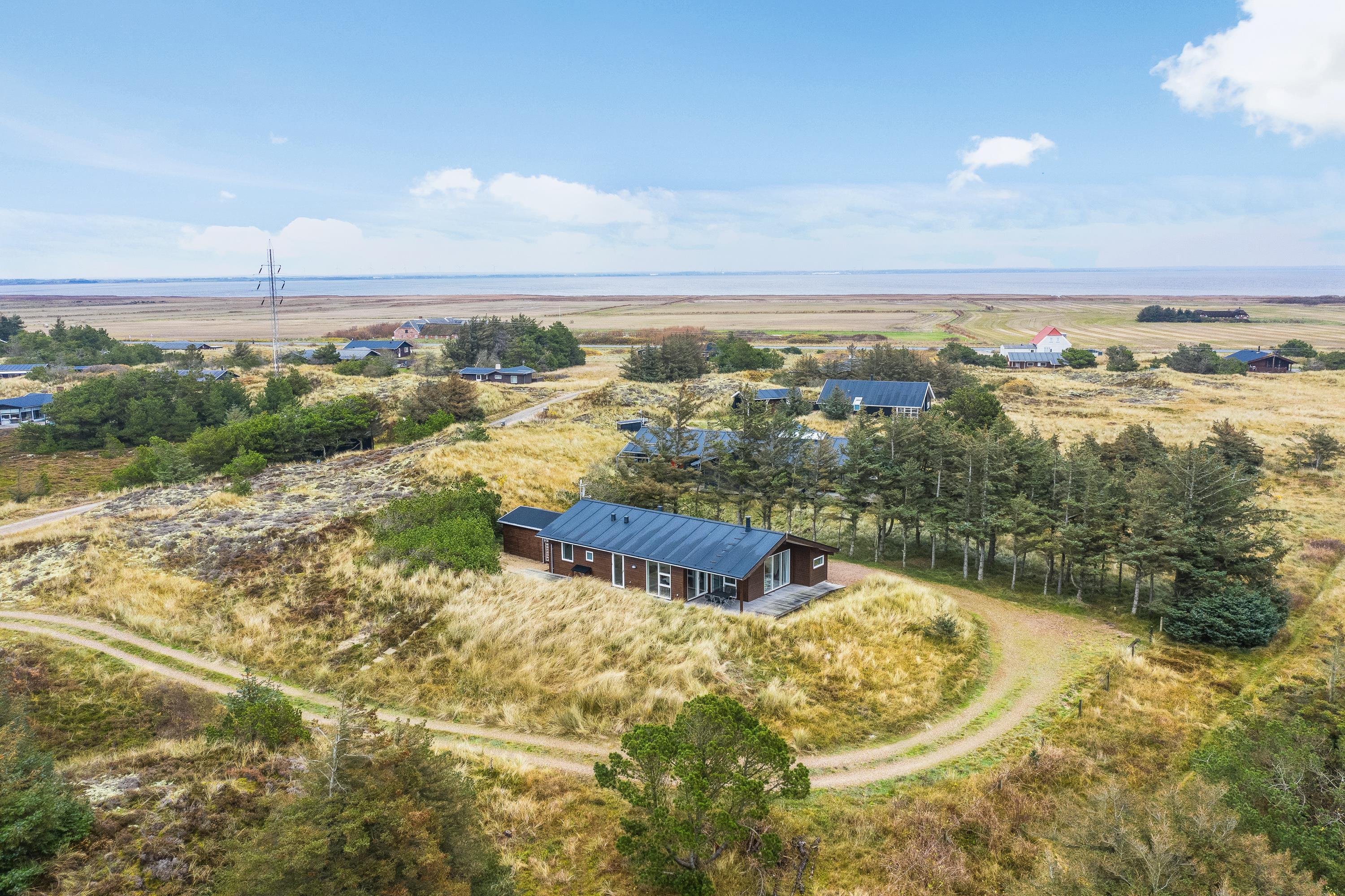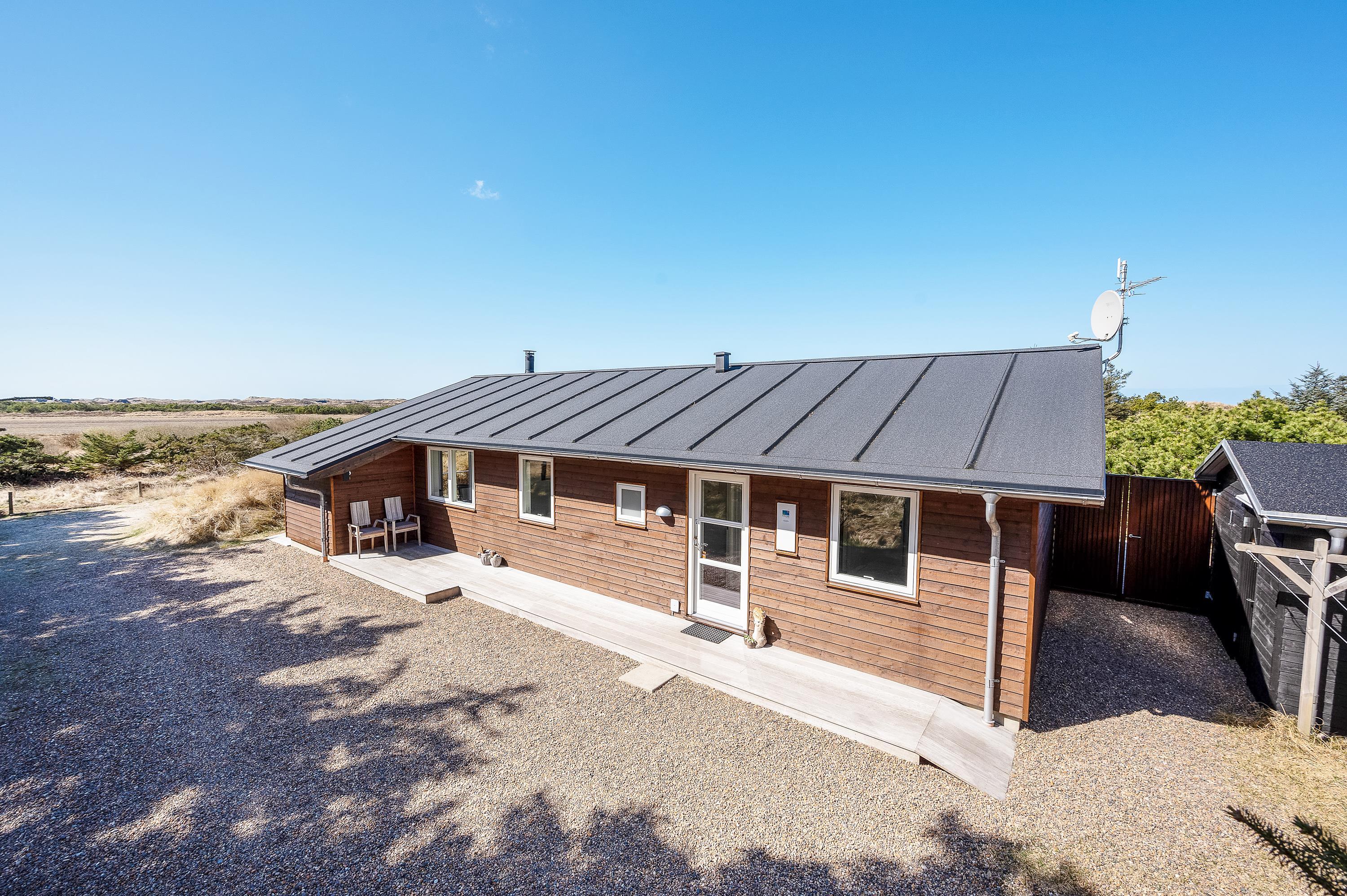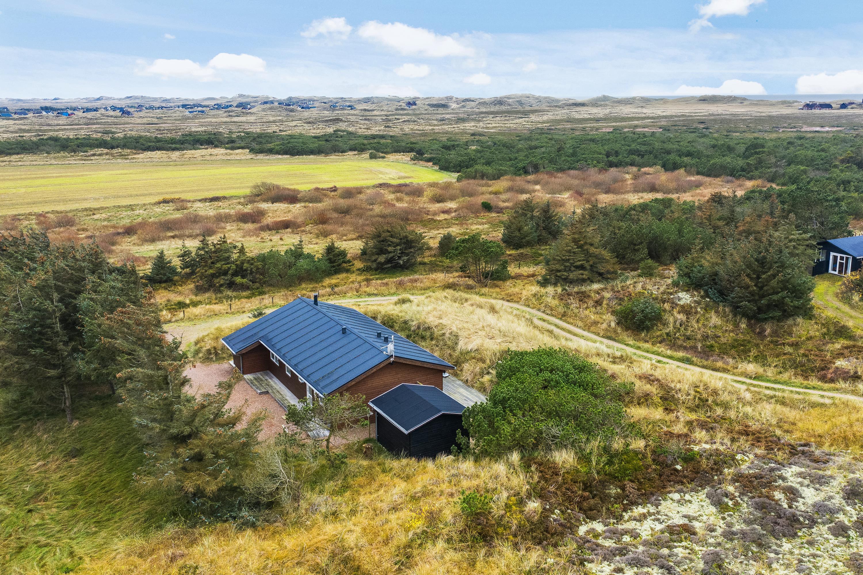 Udsigten fra stuen og terrassen mod sydvest er skøn, det fredede hedeareal og med klitterne i baggrunden er fantastisk smukt og fredfyldt. Sommerhuset er omgivet af træer, så I kan være jer selv og nyde freden og roen.