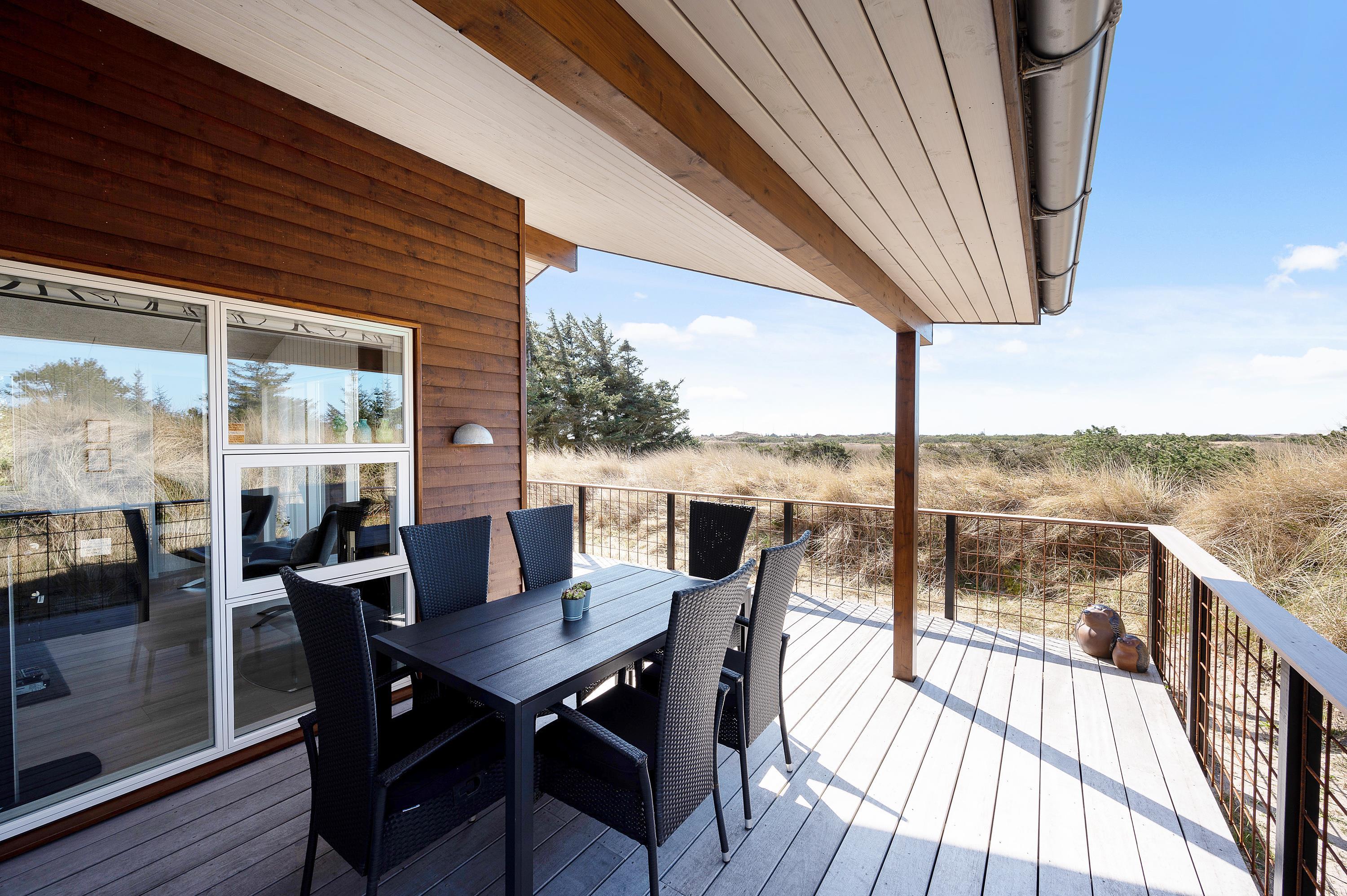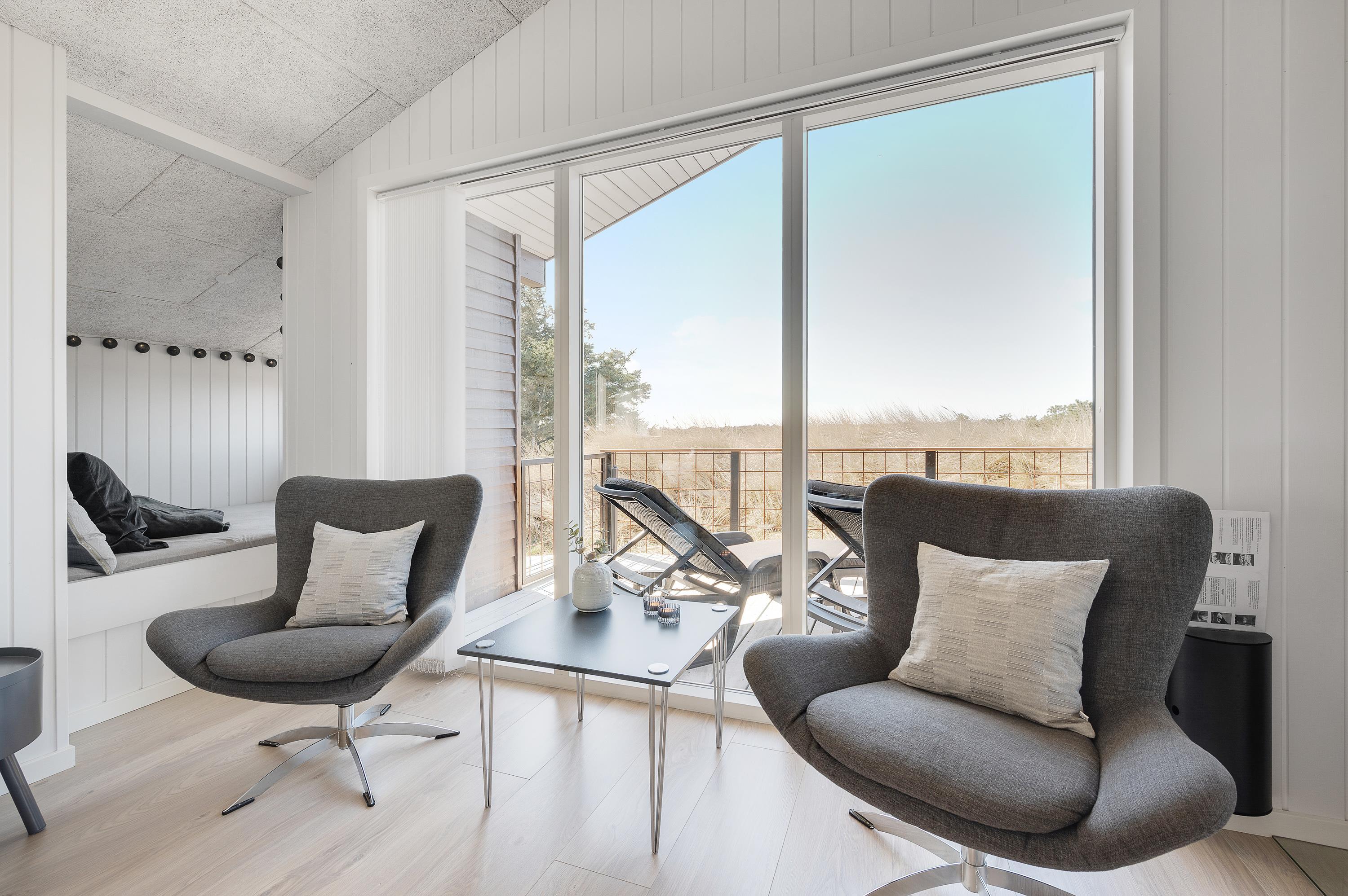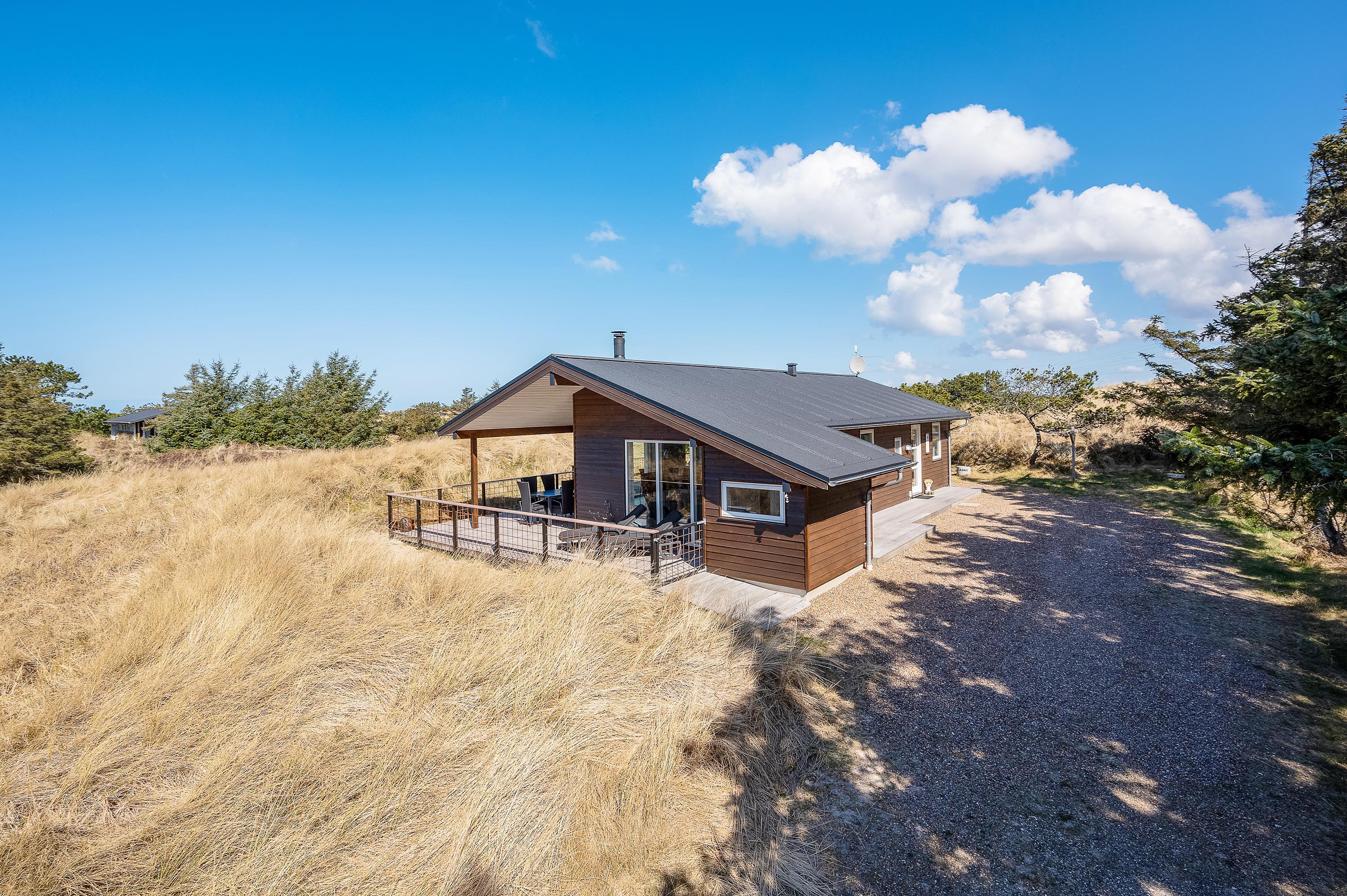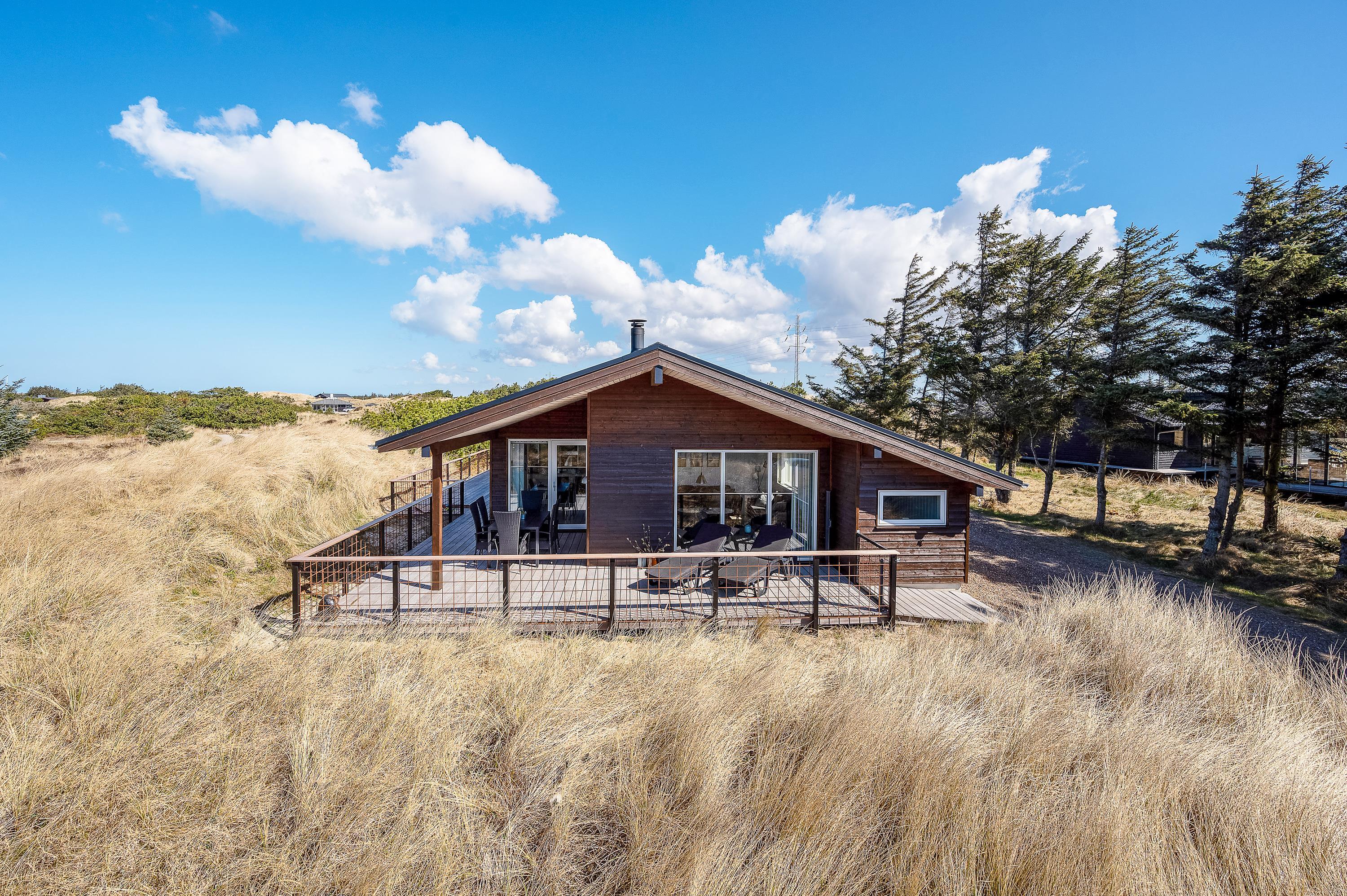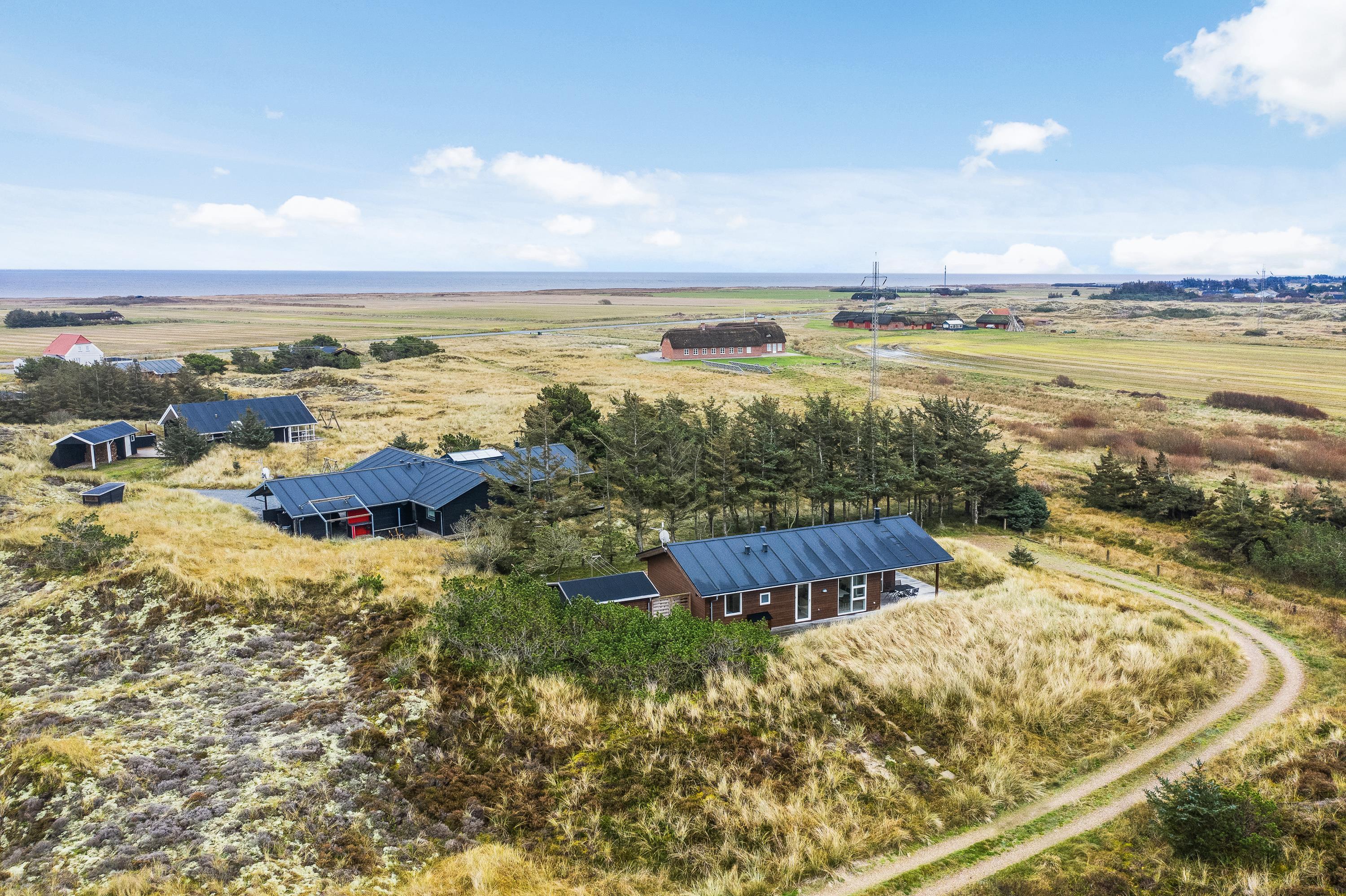 Udsigten fra stuen og terrassen mod sydvest er skøn, det fredede hedeareal og med klitterne i baggrunden er fantastisk smukt og fredfyldt. Sommerhuset er omgivet af træer, så I kan være jer selv og nyde freden og roen.