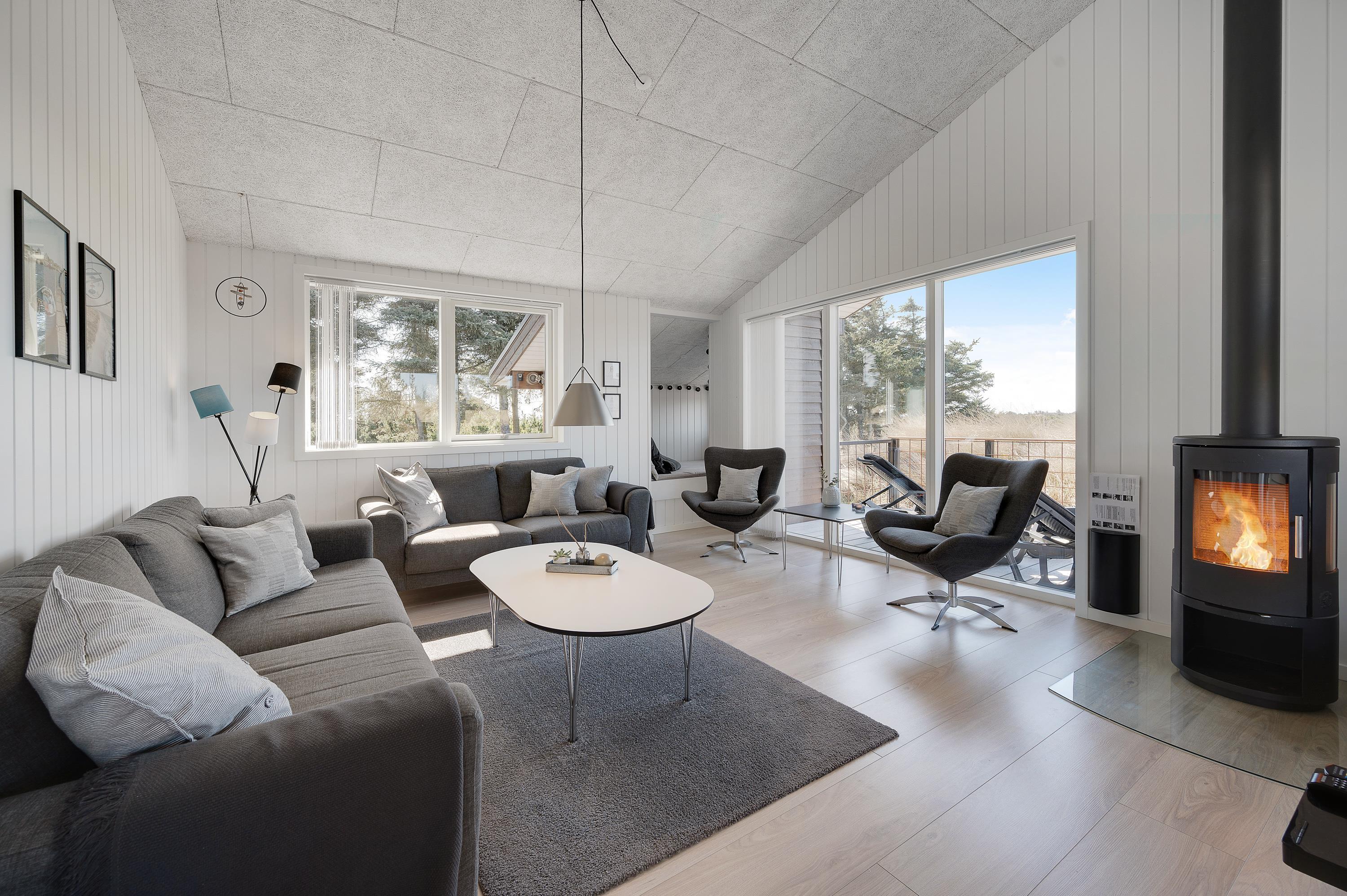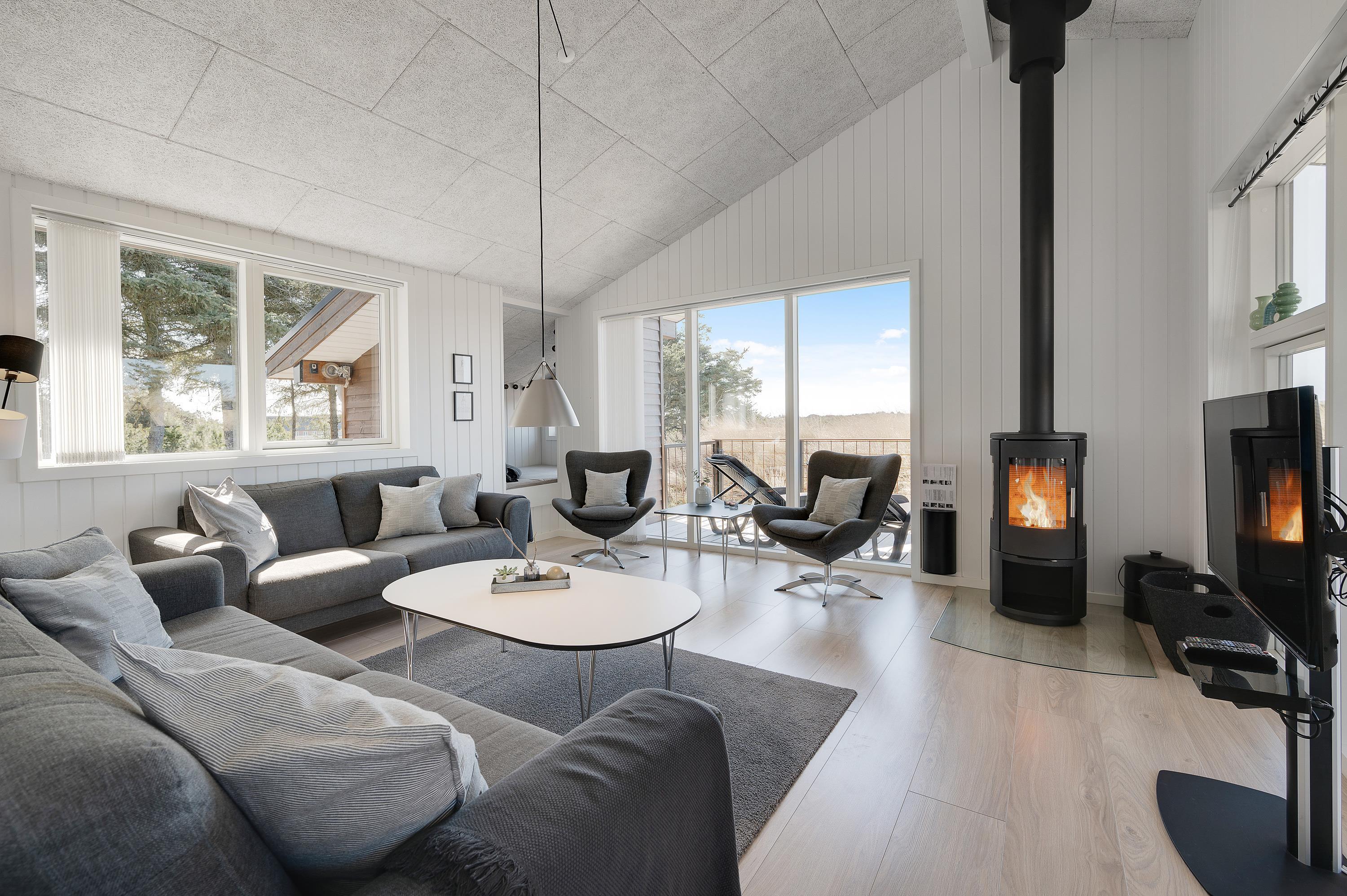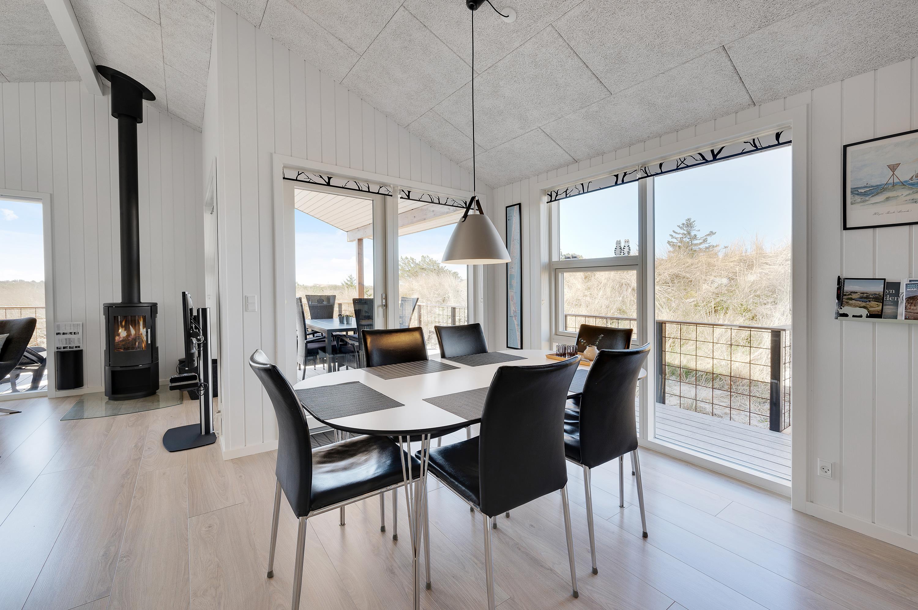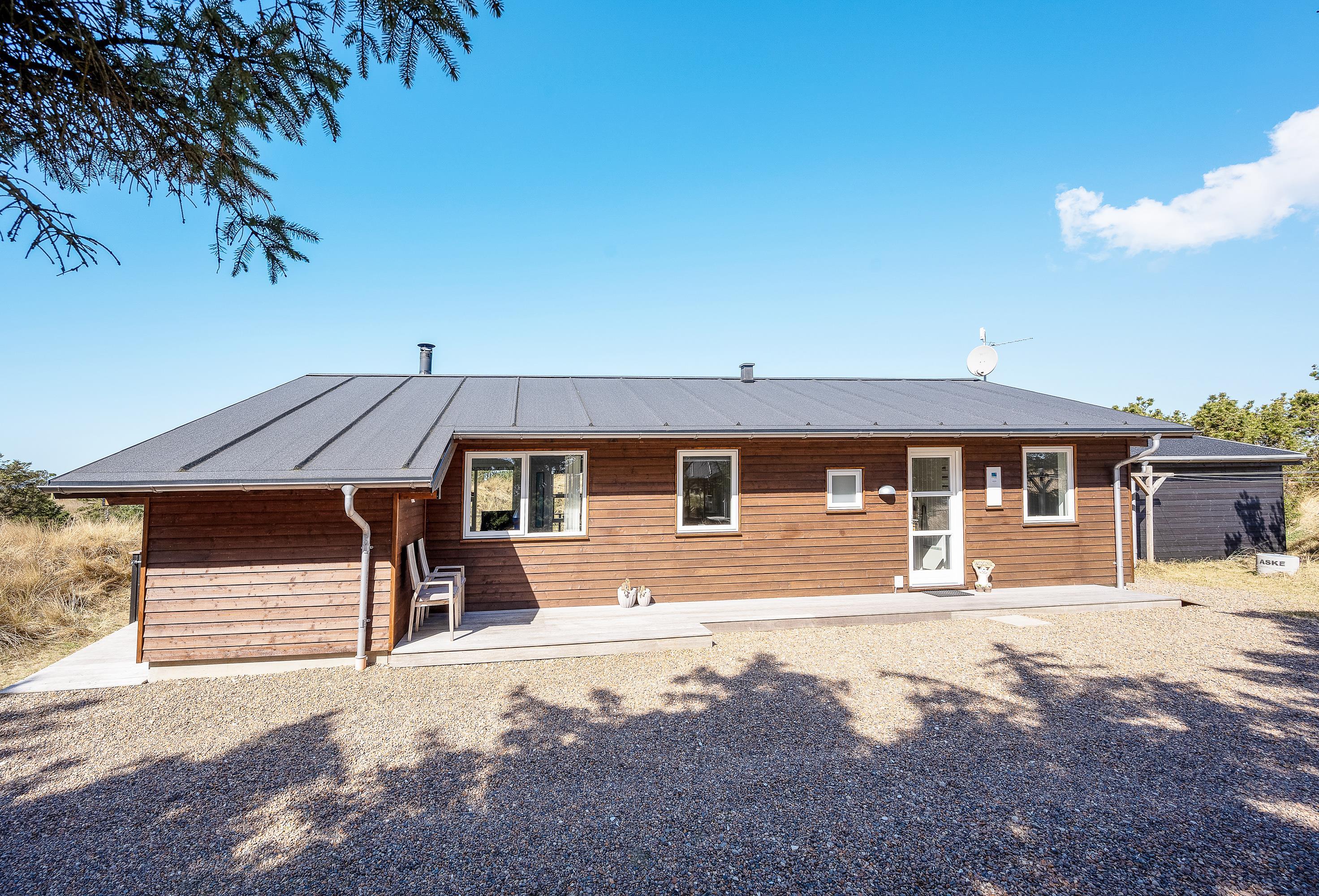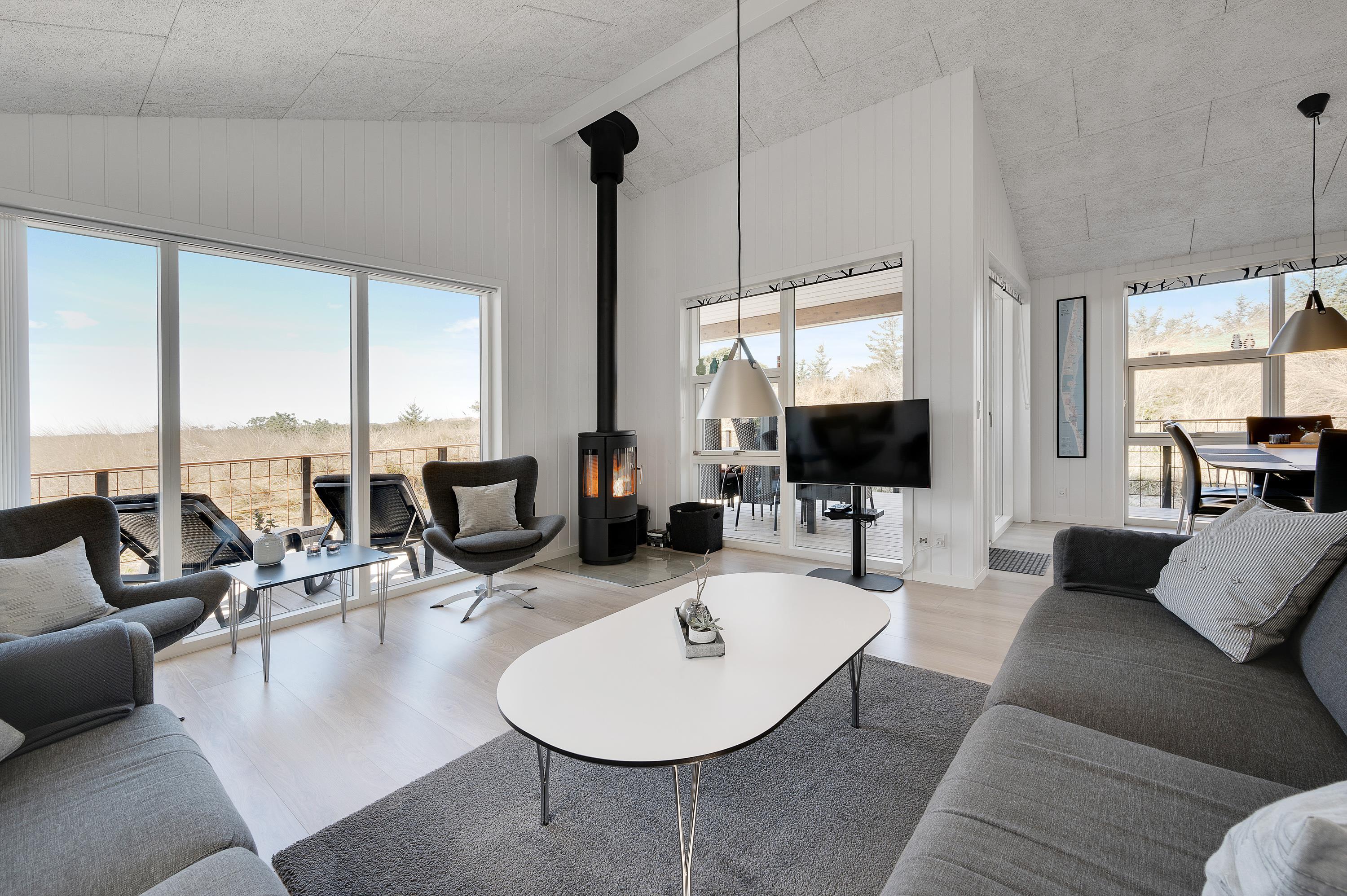 Udsigten fra stuen og terrassen mod sydvest er skøn, det fredede hedeareal og med klitterne i baggrunden er fantastisk smukt og fredfyldt. Sommerhuset er omgivet af træer, så I kan være jer selv og nyde freden og roen.