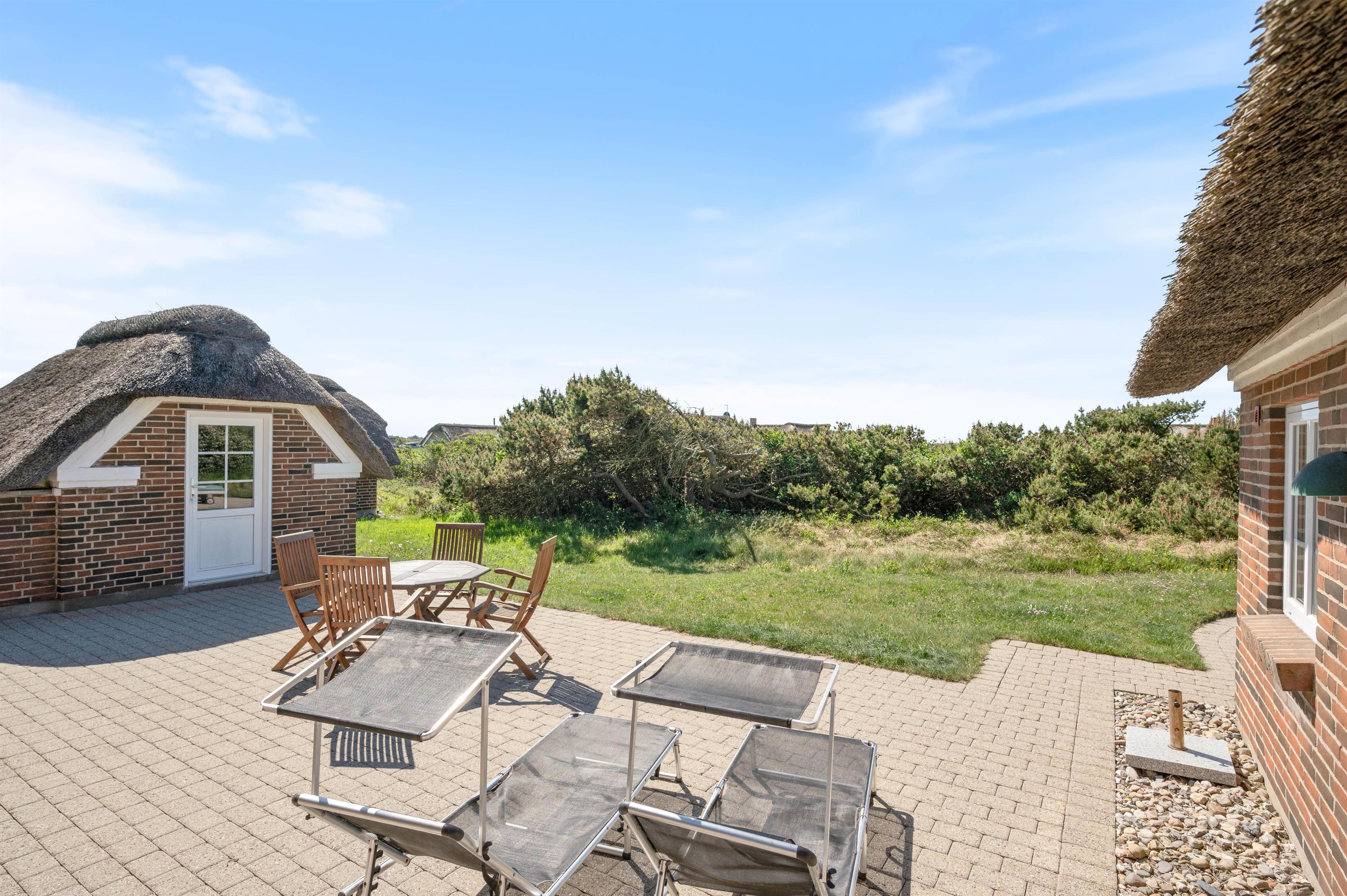 Fra sommerhusets store terrasse kan I på uforstyrret vis nyde området og udsigten helt ned til Lyngvig Fyr. Her er beplantning i kanten af den store grund, så I fuldstændig uforstyrret kan benytte udebruseren, som er tilgængelig fra april til november eller nyde solen, grille bøffen eller bare slappe af med familien.