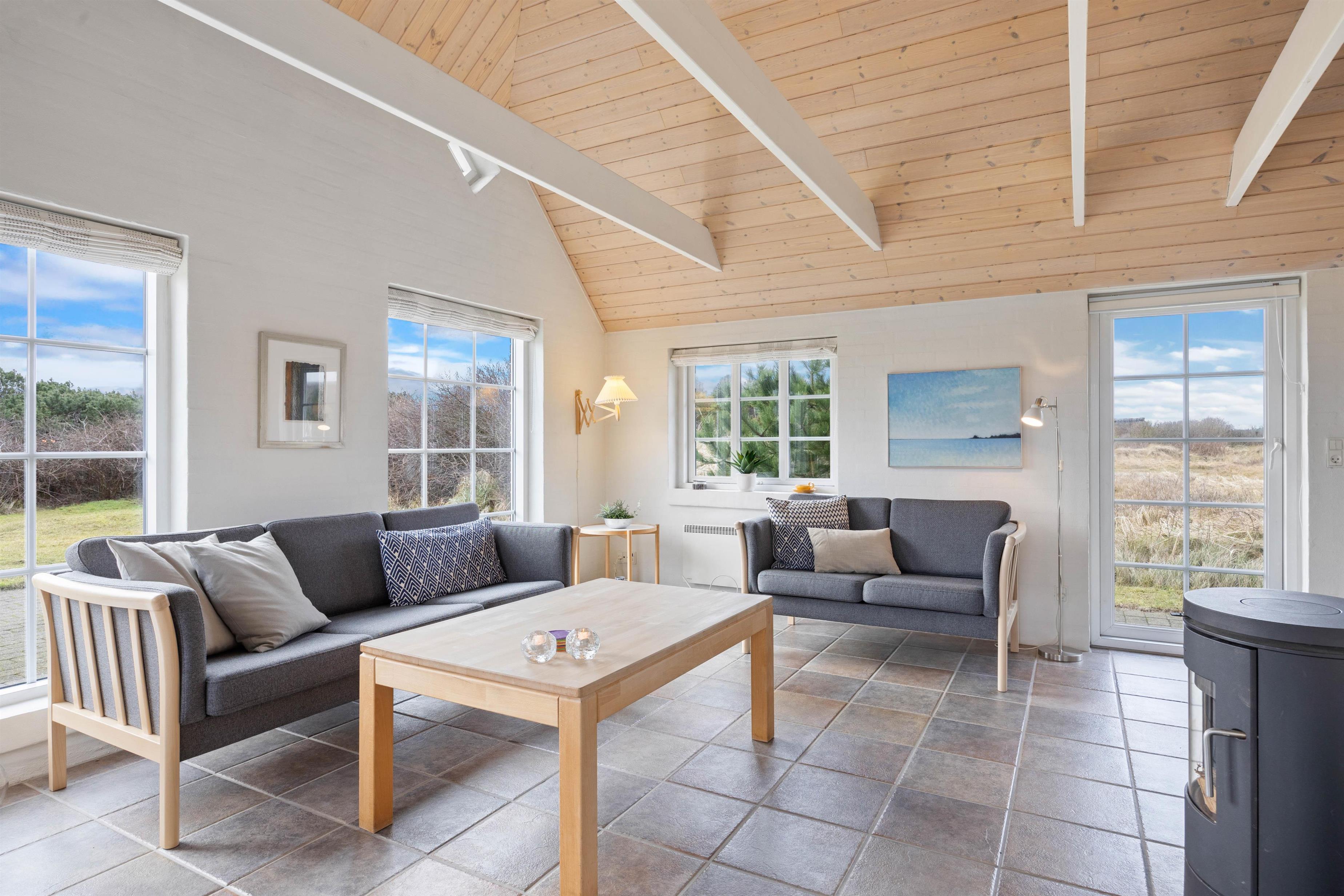 Stuen har flotte klinker, hvide vægge, gode møbler og en brændeovn, der giver den rigtige feriestemning i feriehuset.