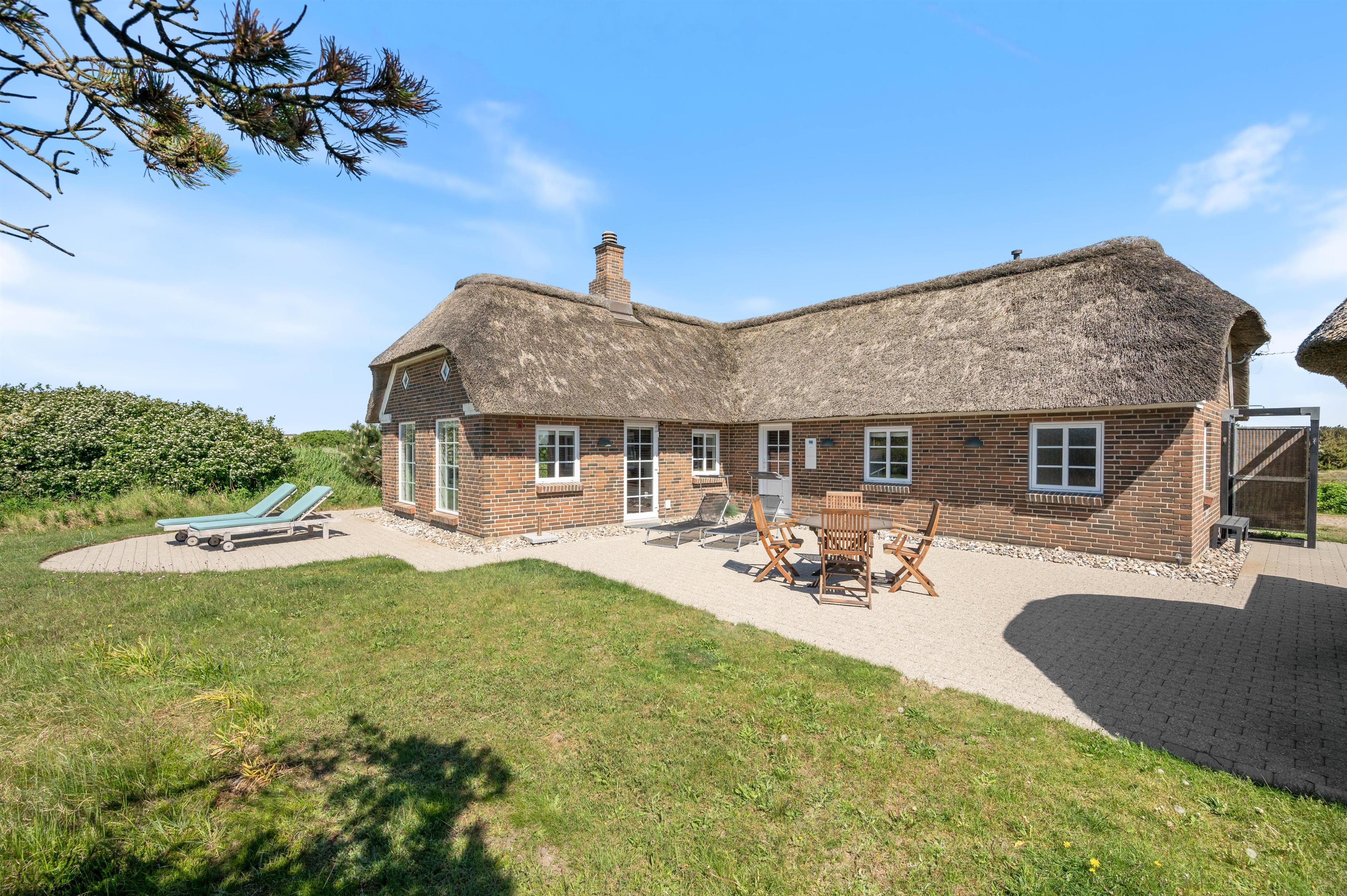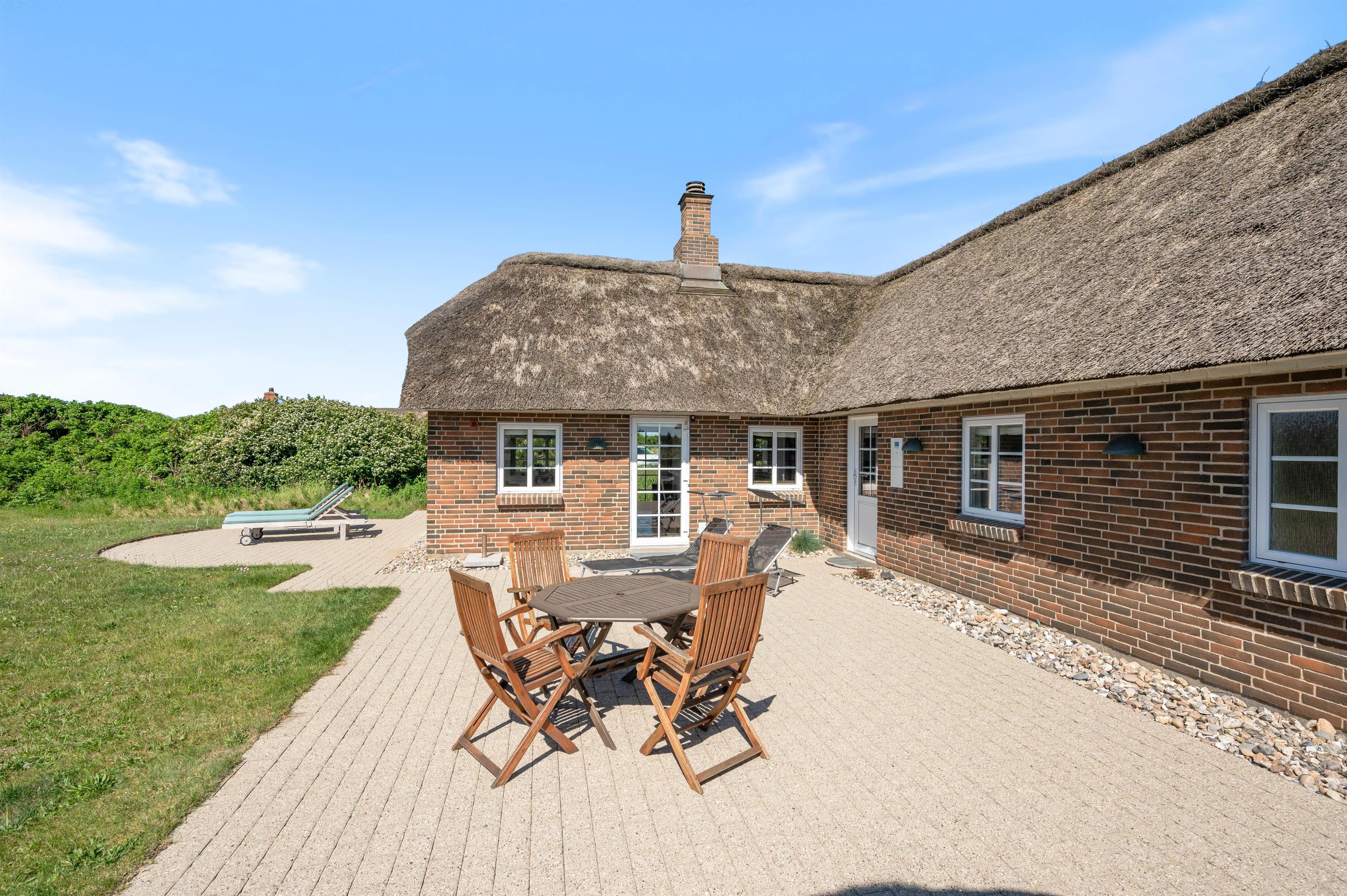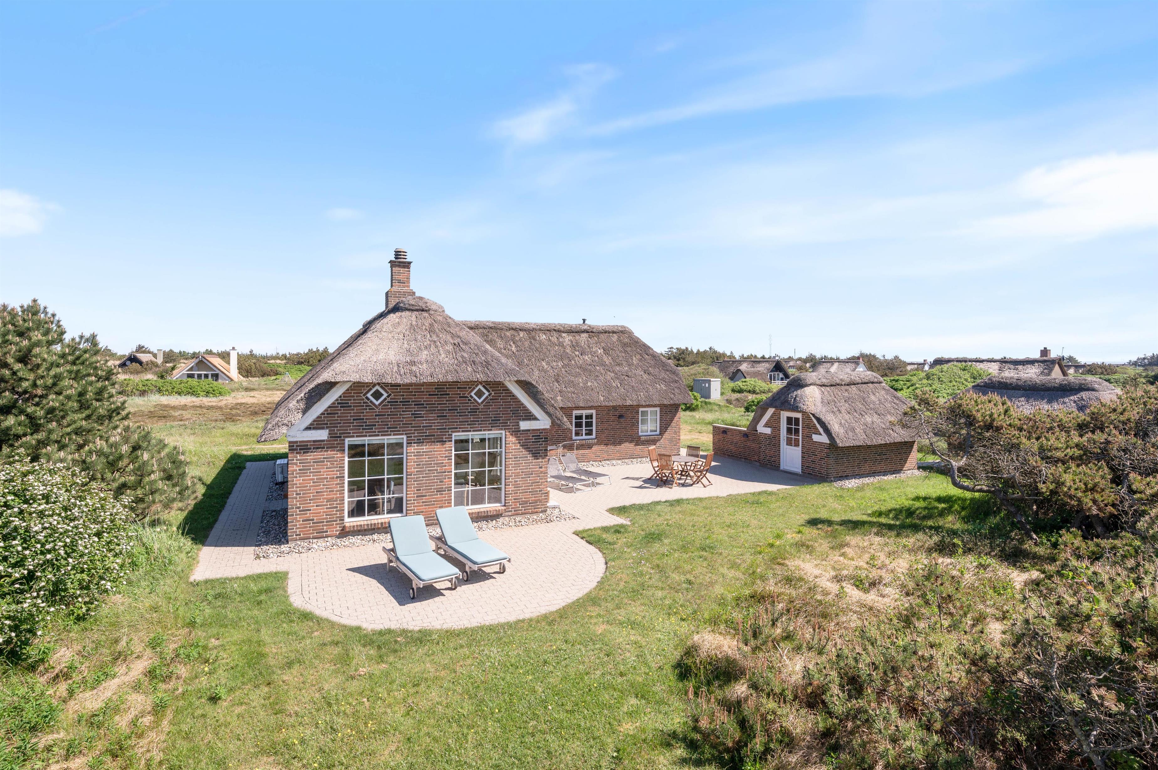 Flot nyere feriehus i traditionel stil, så det emmer af feriehygge, luksus og kvalitetstid med familien. Her er kombination af det charmerende stråtækkede feriehus, muret i flotte håndstrøgne mursten og med en moderne og luksuriøs indretning - blandt andet med sauna og spabad. Rundt om sommerhuset løber en god terrasse, hvor der blandt andet er udendørs bruser.