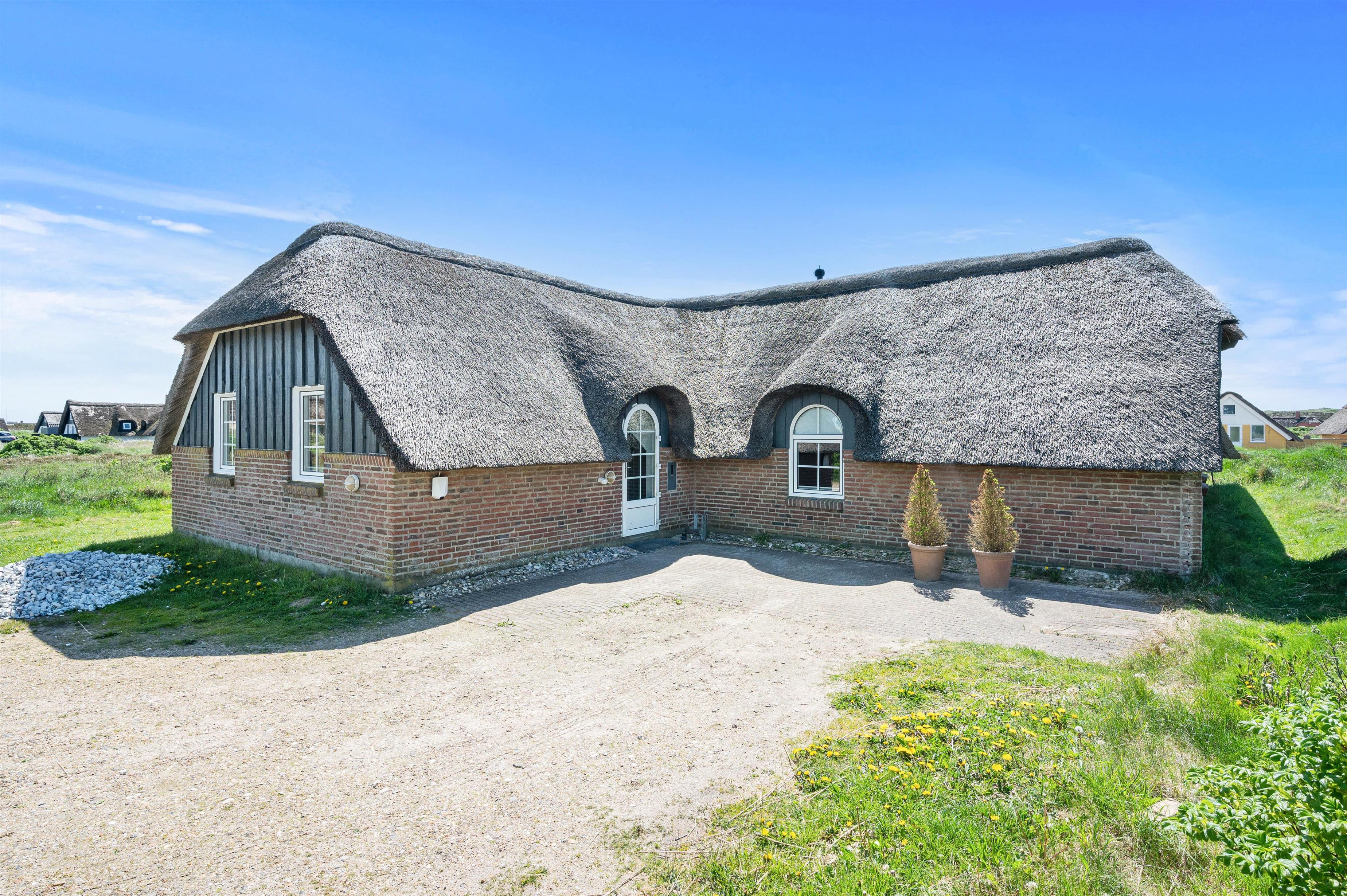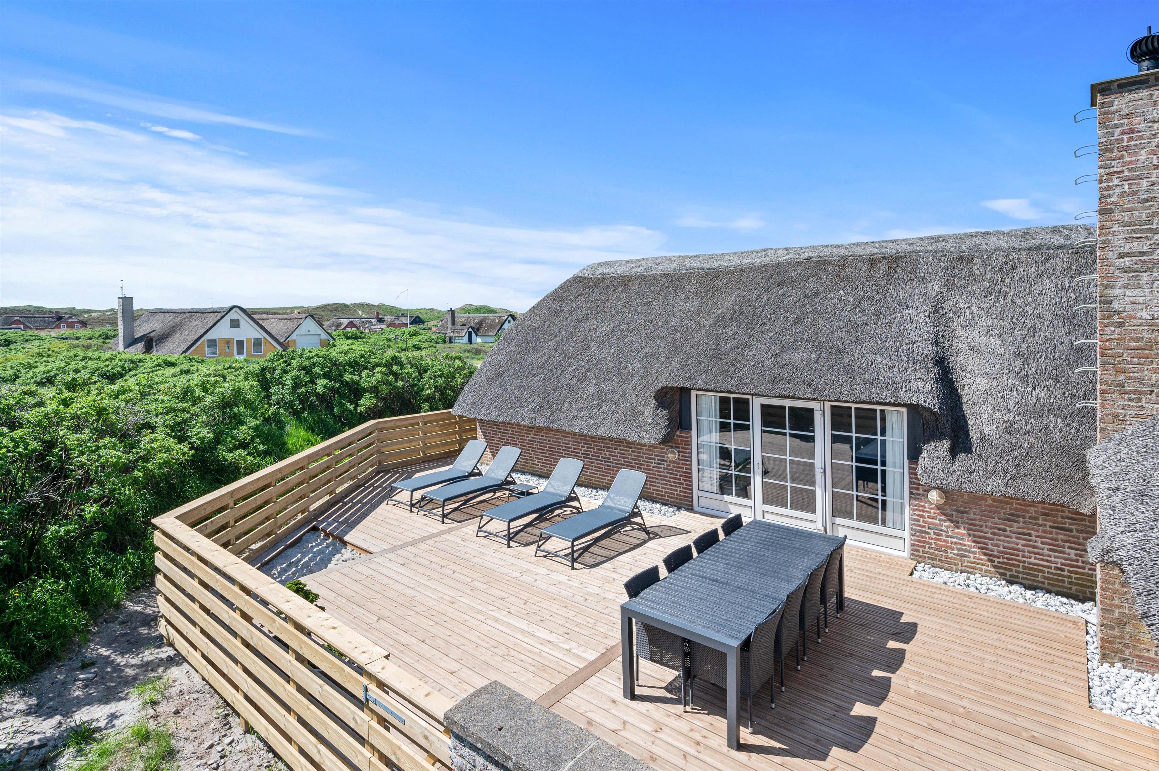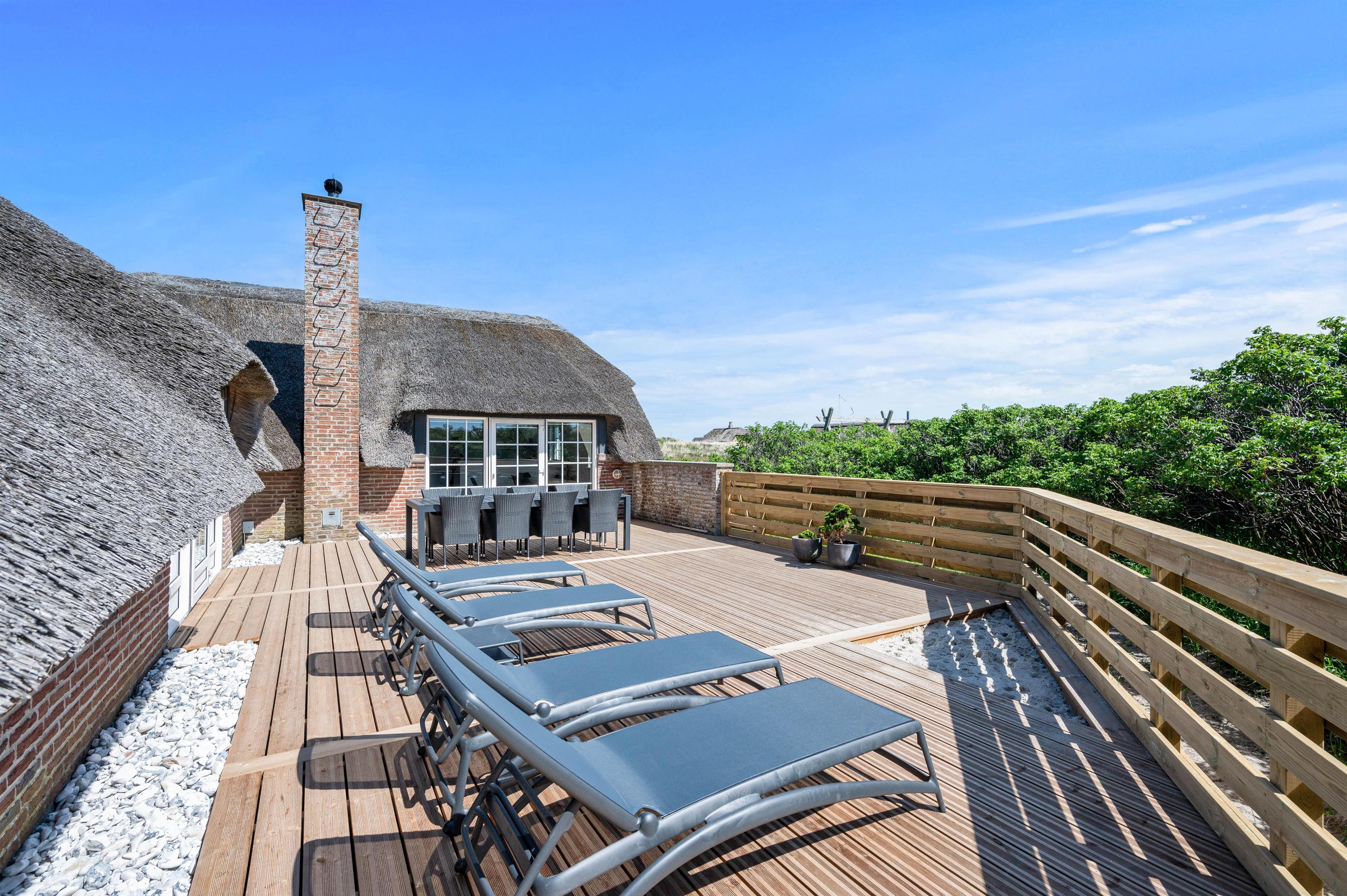 Udendørs har sommerhuset en skøn terrasse, der er delvist overdækket og lukket, og dermed har I mulighed for at sidde i ly og læ, når I er på terrassen. Her står der havemøbler og liggestole klar til jer, så I kan læne jer godt tilbage på en plads i solen, hvor I kan nyde det omkringliggende landskab og lyden af brændingen i baggrunden.