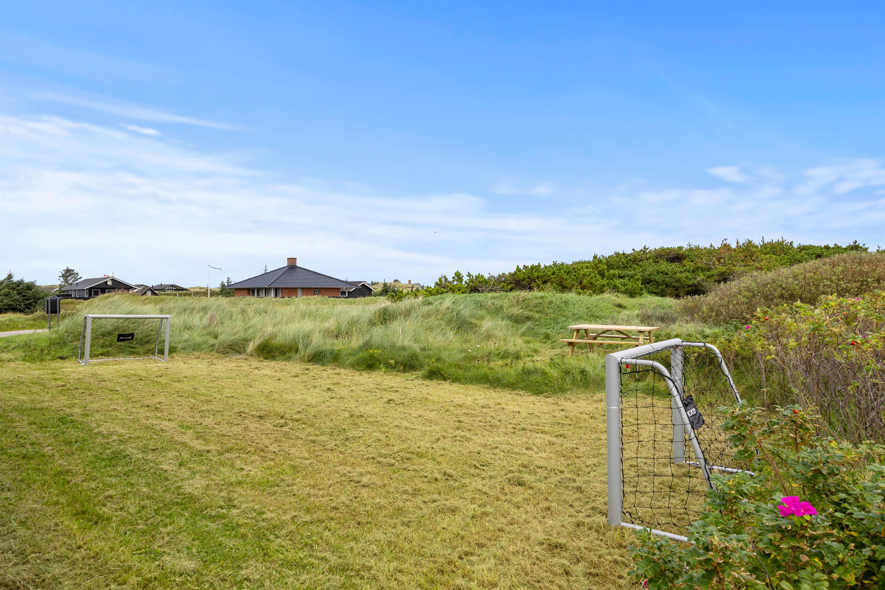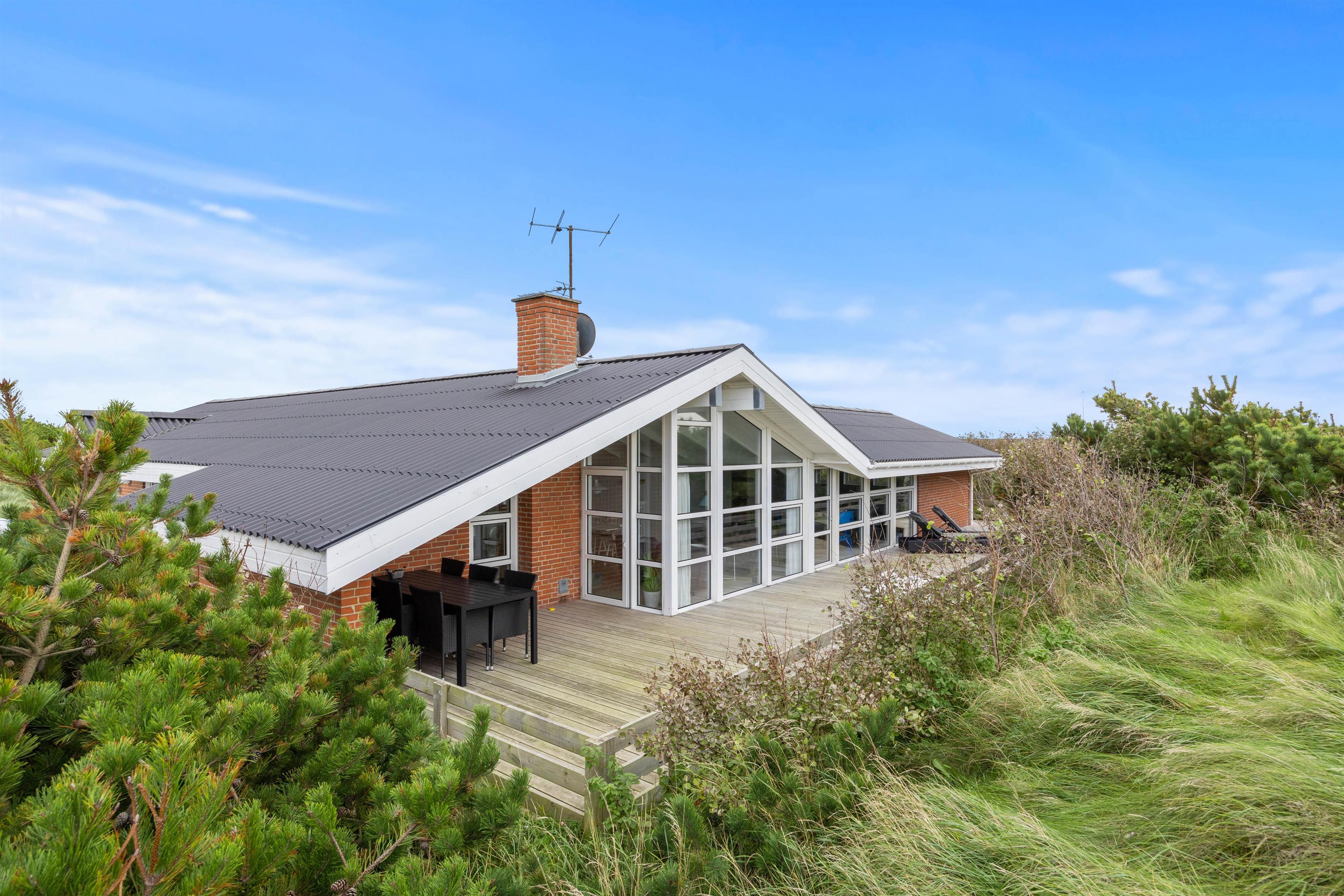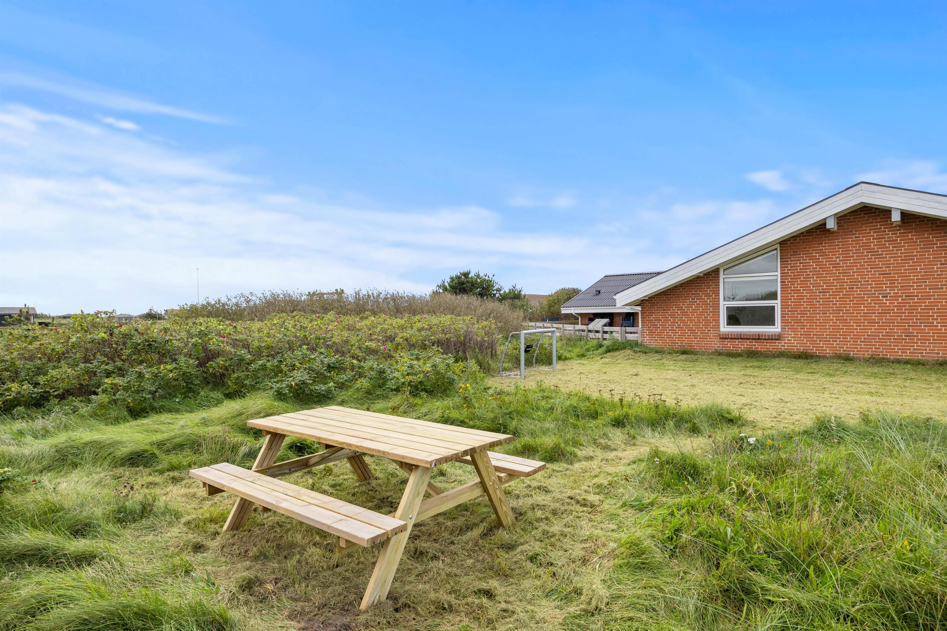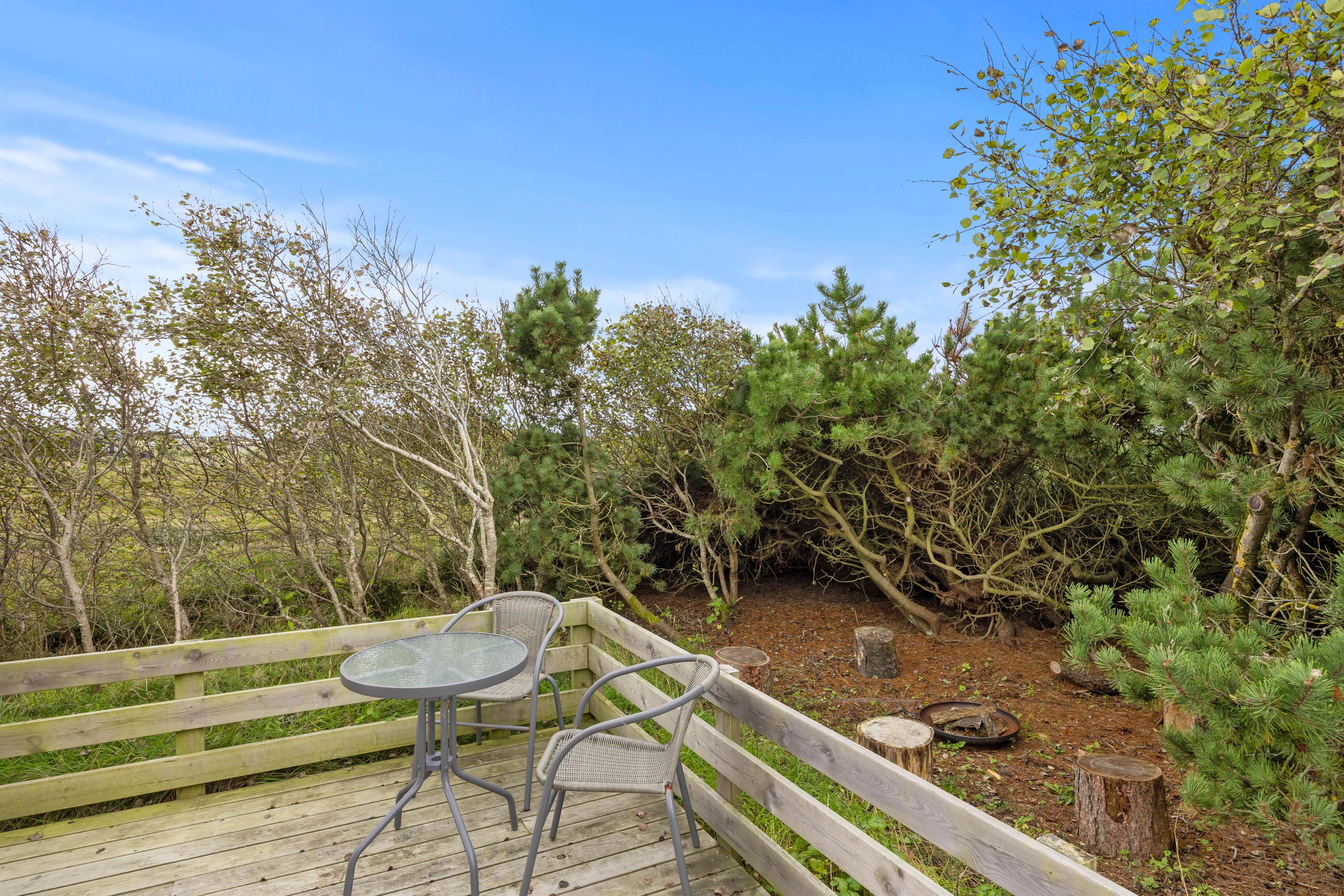 Tilhørende sommerhuset er der en stor træterrasse, hvor I kan tilbringe feriens varme og solrige dage. Her kan I nyde udsigten til den omkringliggende og karakteristiske natur, hvor klitter og hedearealer er dominerende. I har både havemøbler, liggestole og gasgrill til rådighed.