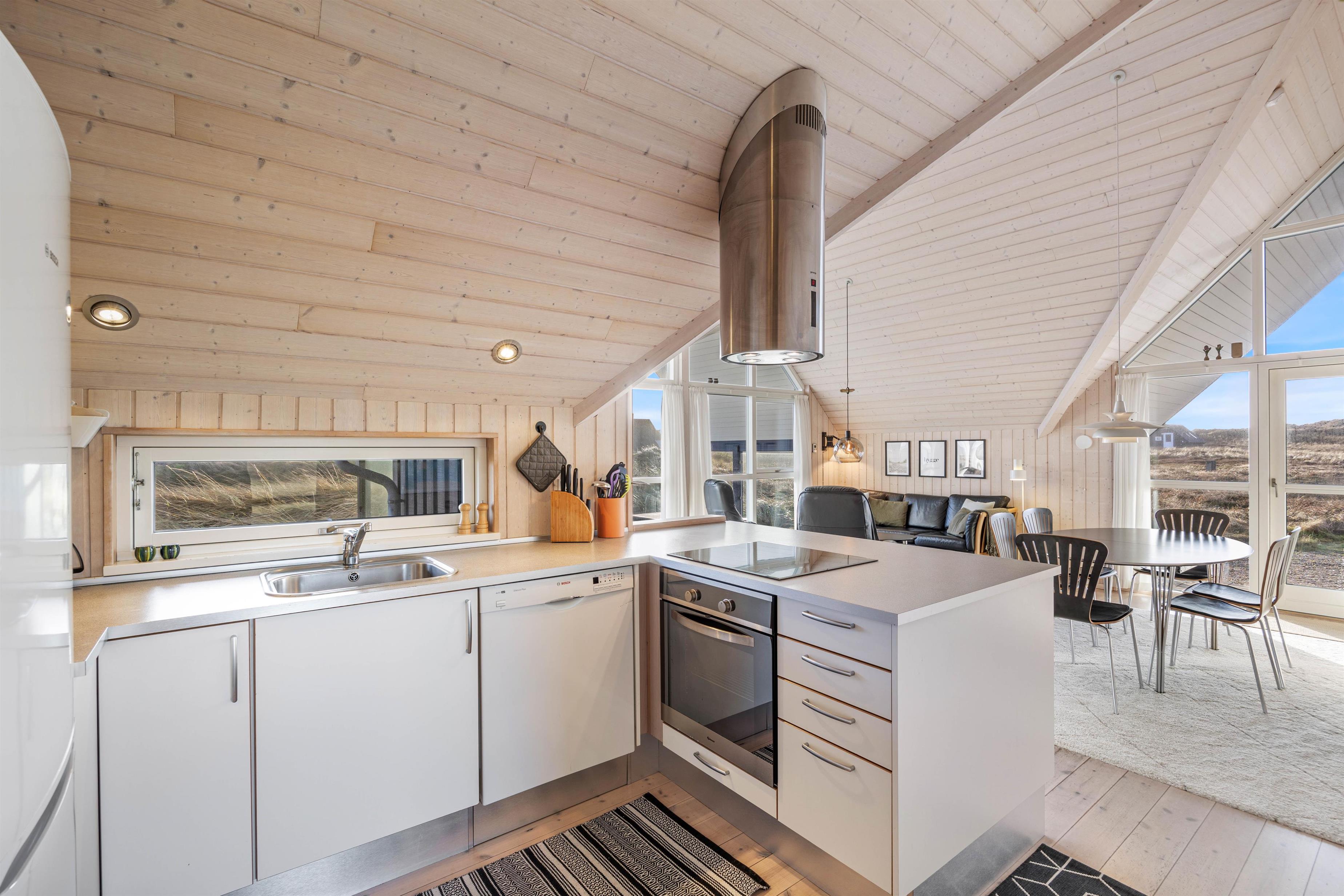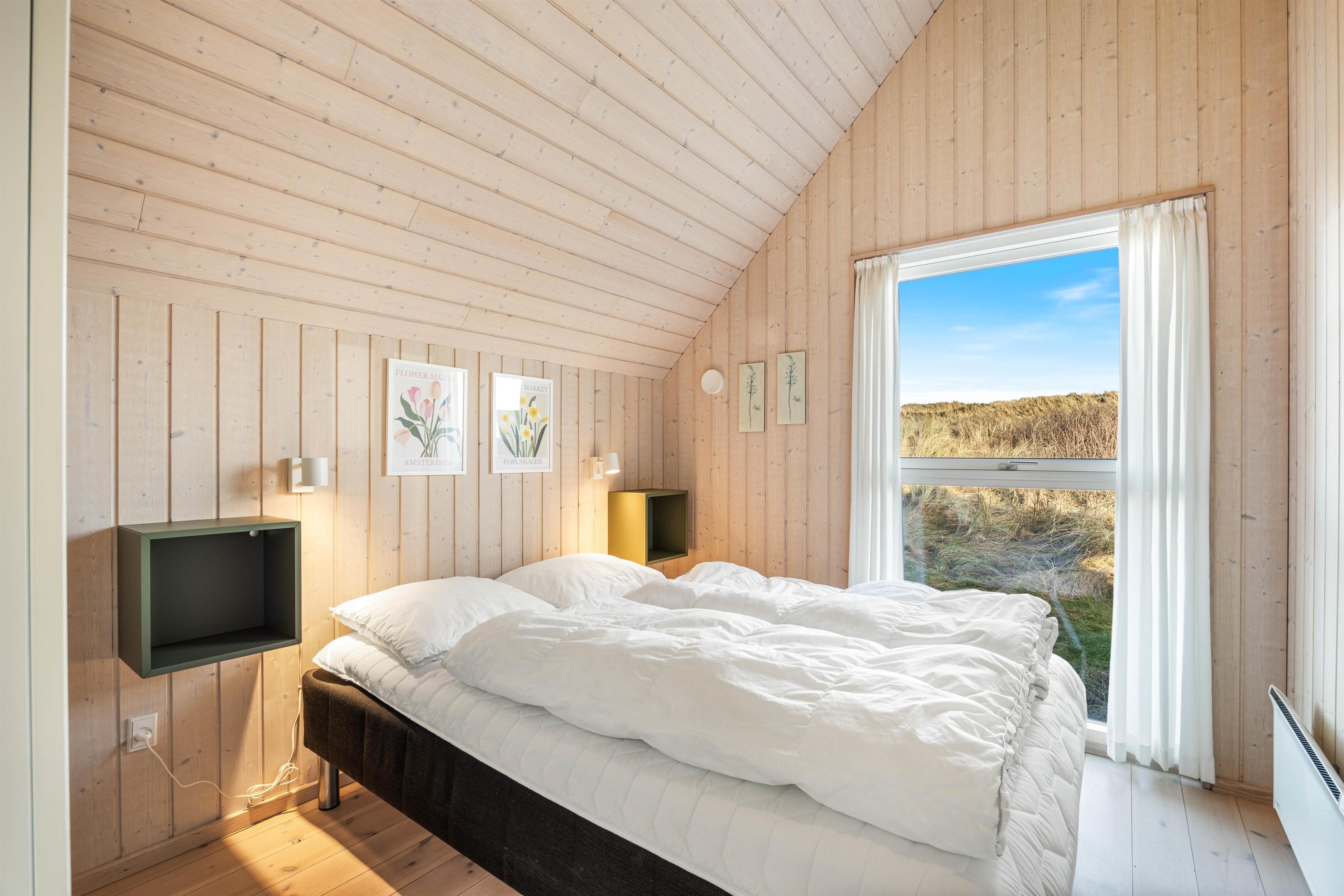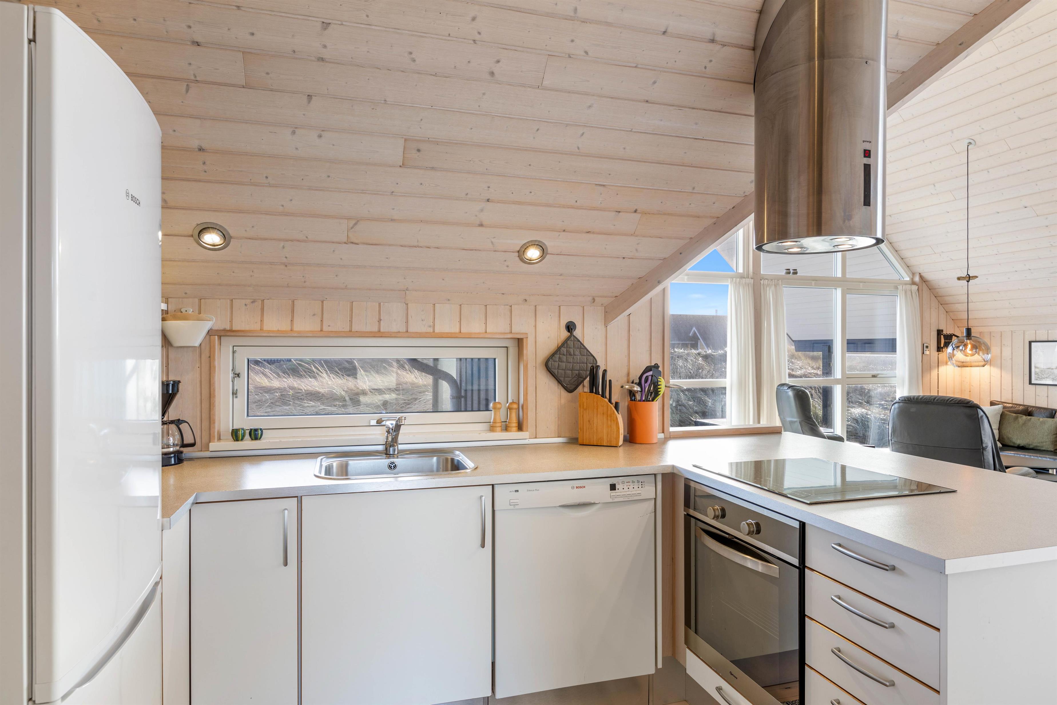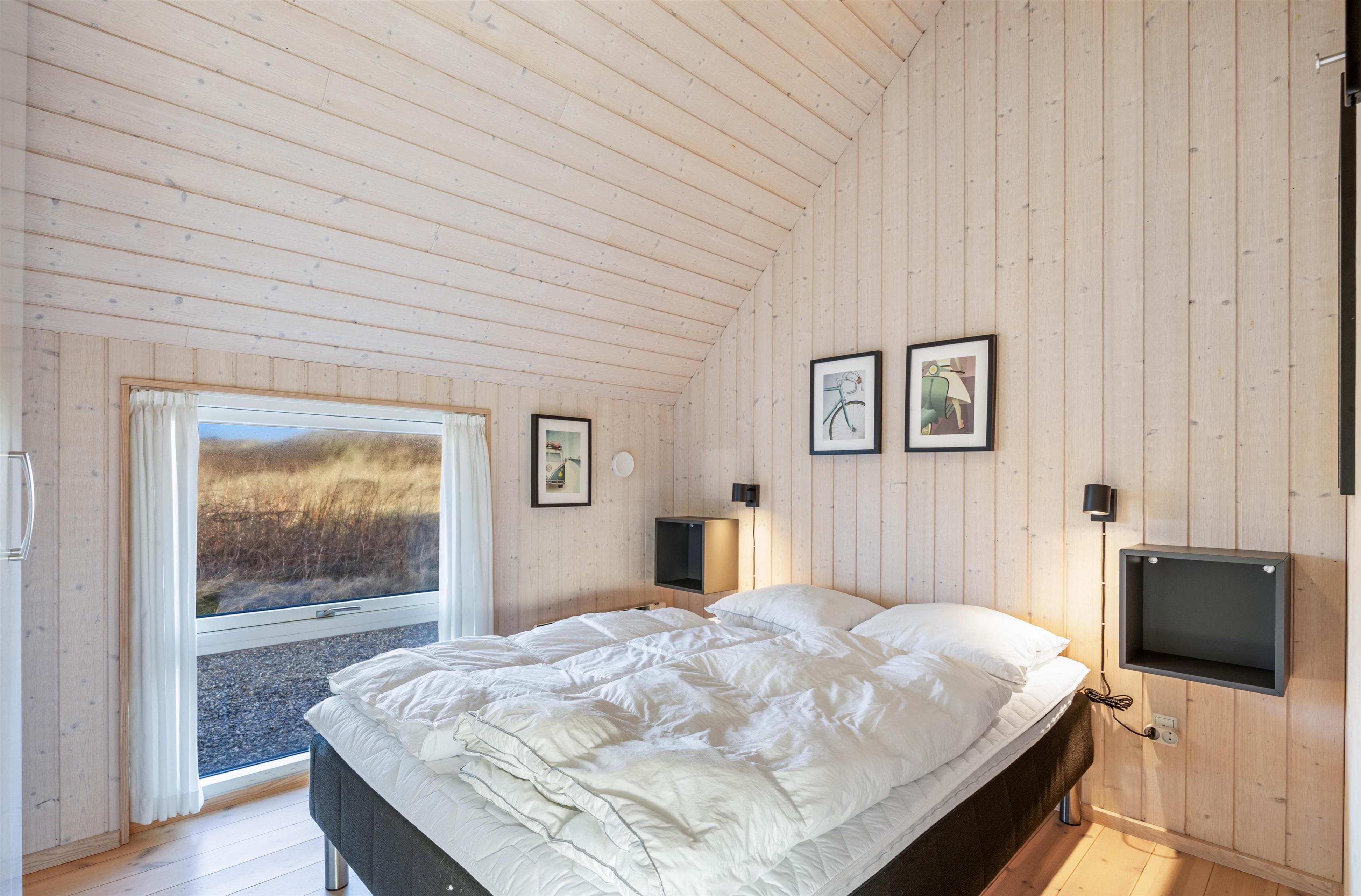 Dette dejlige sommerhus har 3 soveværelser, alle med dobbeltsenge. Badeværelset er med gulvvarme, en skøn bruseniche og en vaskemaskine. I køkkenet, der er placeret i forbindelse med stuen, finder du både opvaskemaskine, mikroovn og en fryser på 60 liter. I stuen er der store og flotte vinduespartier, både mod vest og mod syd, så man har dejligt udsyn over den smukke natur, hvor klitterne ses længst mod vest. I stuen er der en flot brændeovn med glaslåger, et fladskærms-TV, en radio m/CD-afspiller, parabol og gratis trådløst internet.