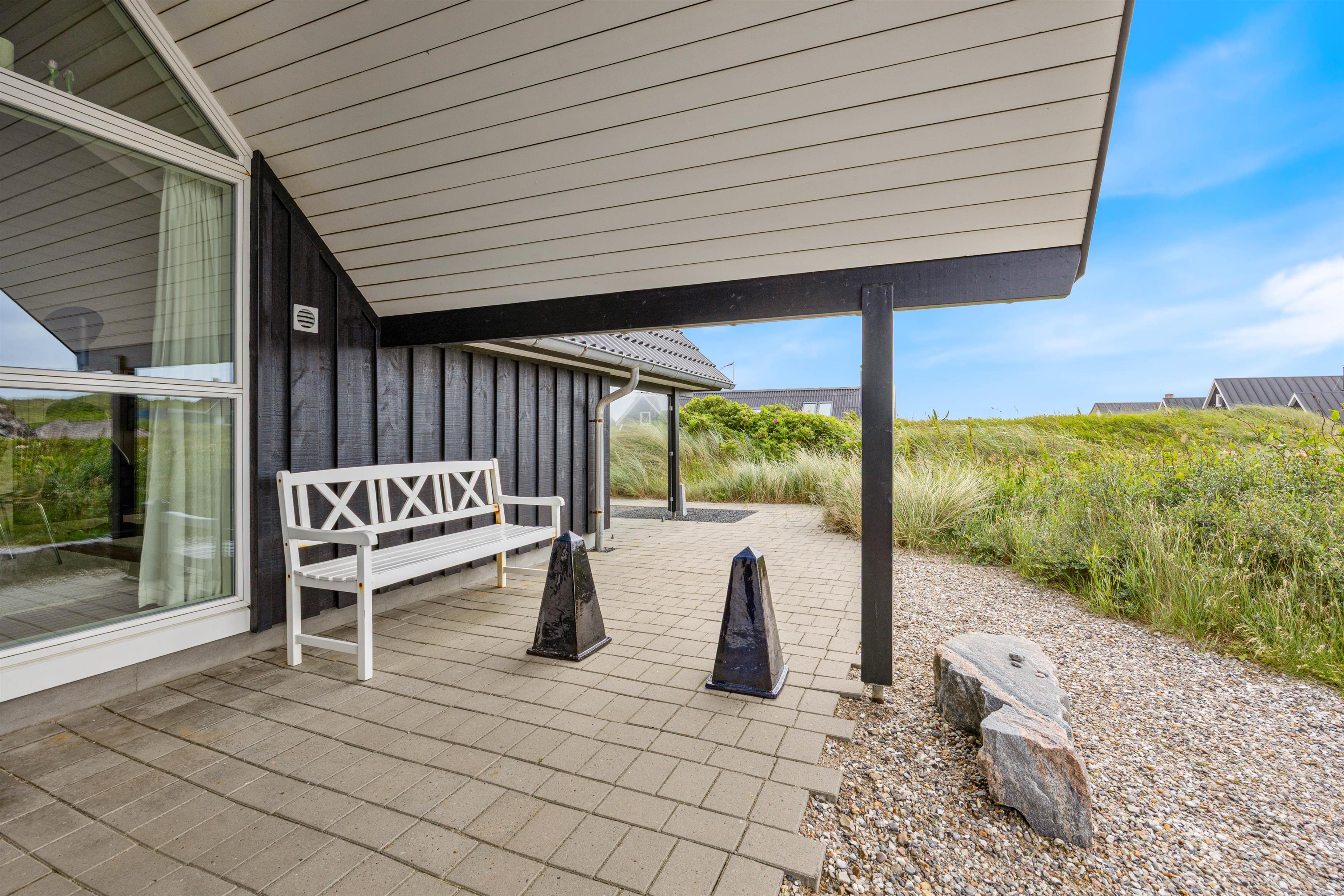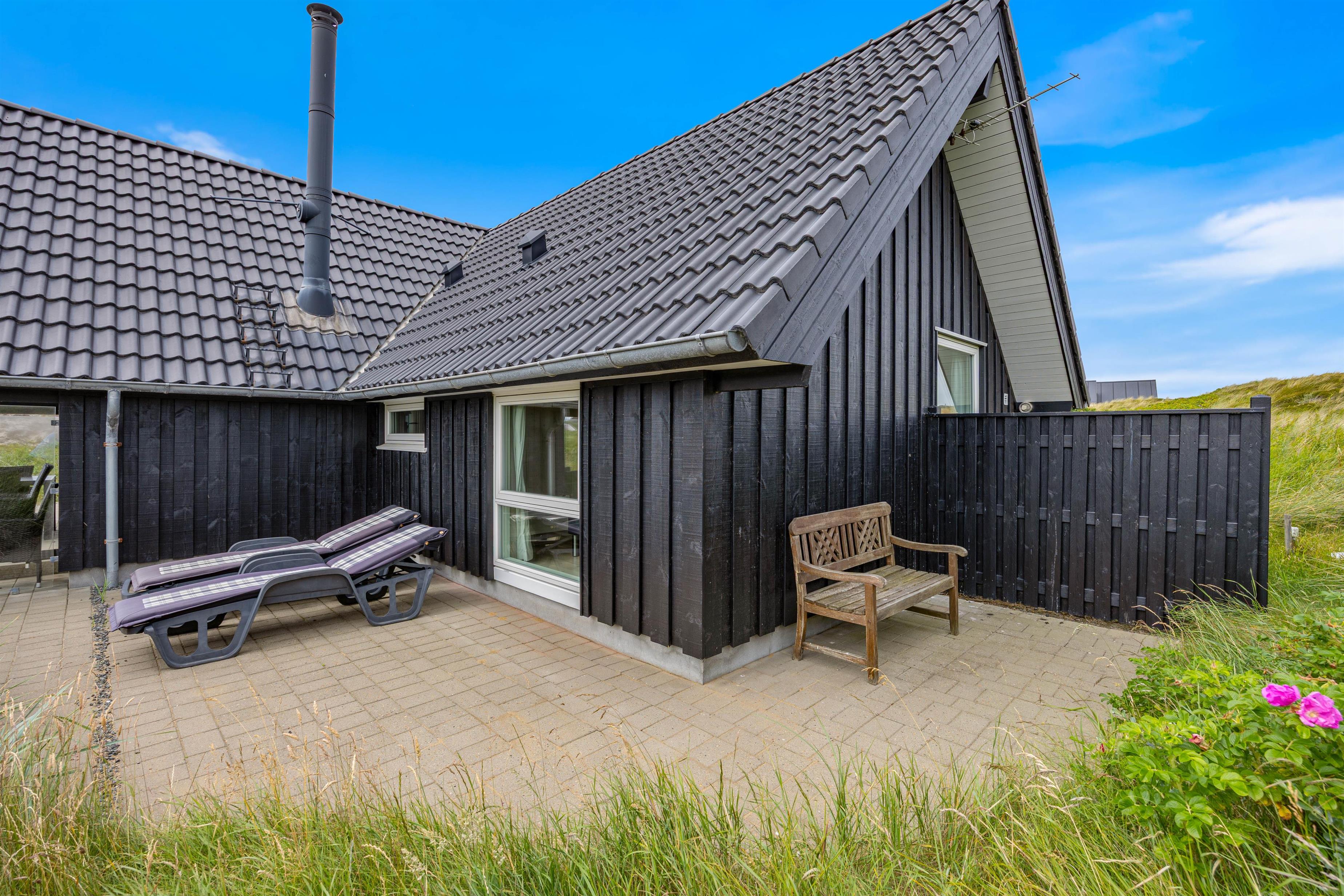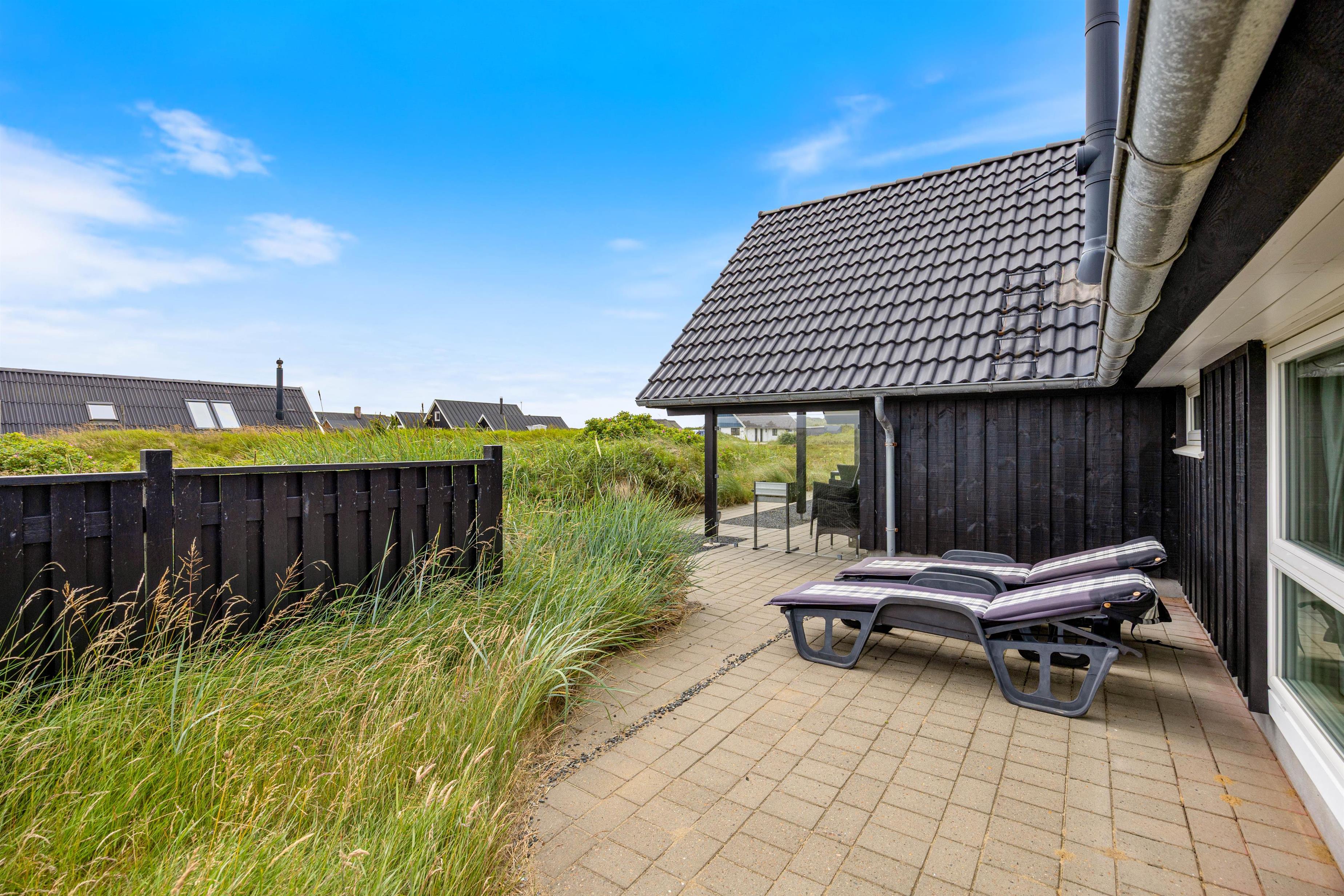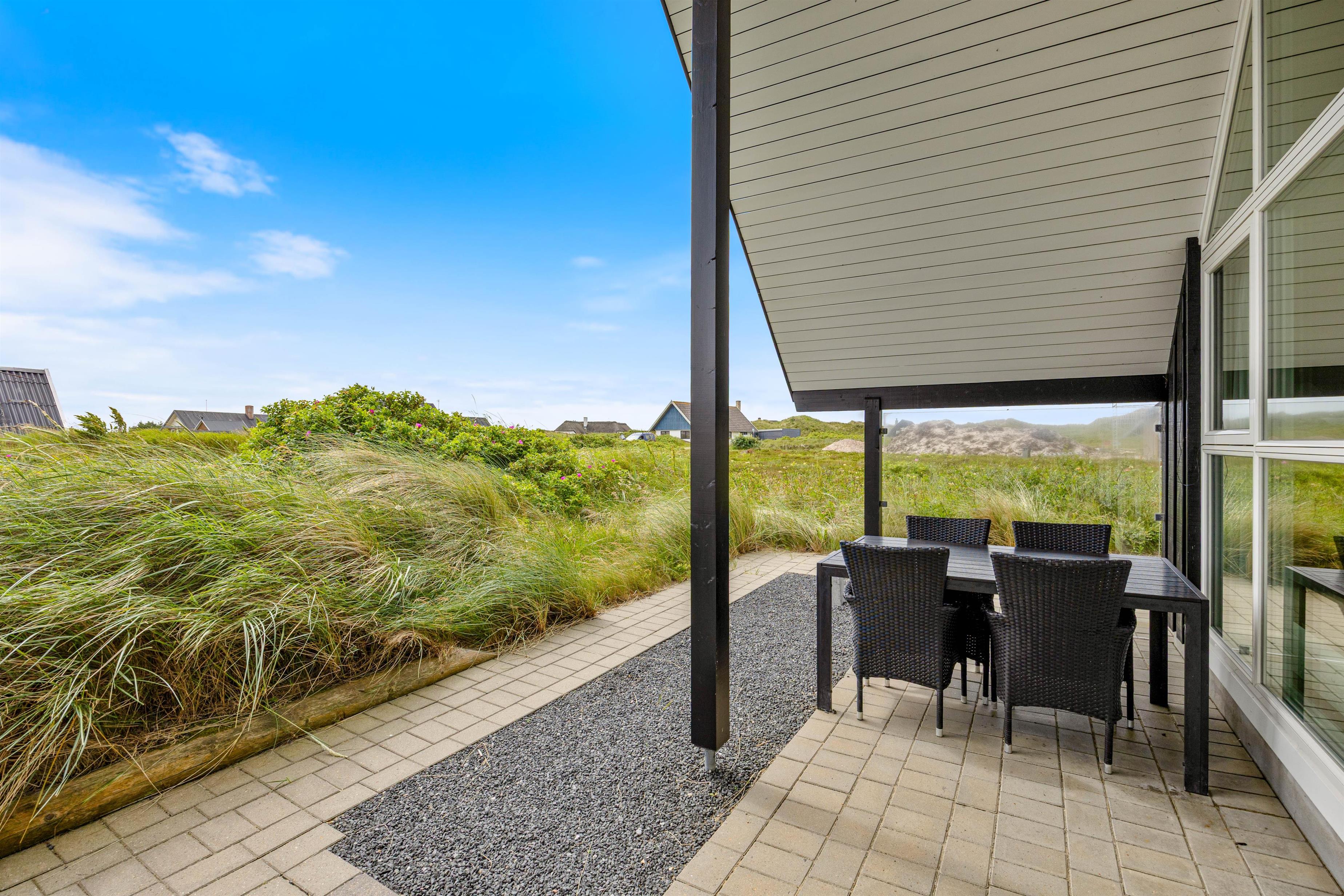 Huset har flere skønne terrasser. Mod øst og sydøst er den største terrasse placeret, og her er der mulighed for at nyde solen mange timer om dagen.Terrassen er delvist afskærmet og delvist overdækket mod syd. Mod vest er der også en terrasse, og her er udsigten over det lyngbeklædte landskab så flot, og klitterne mod vest ligger tæt på.