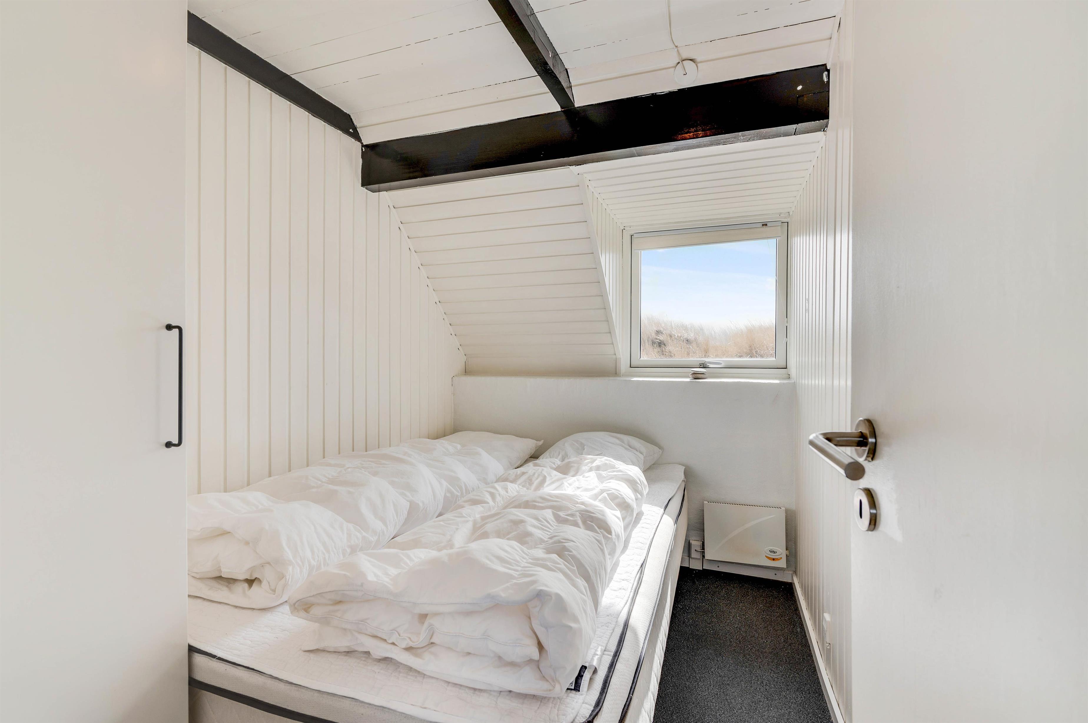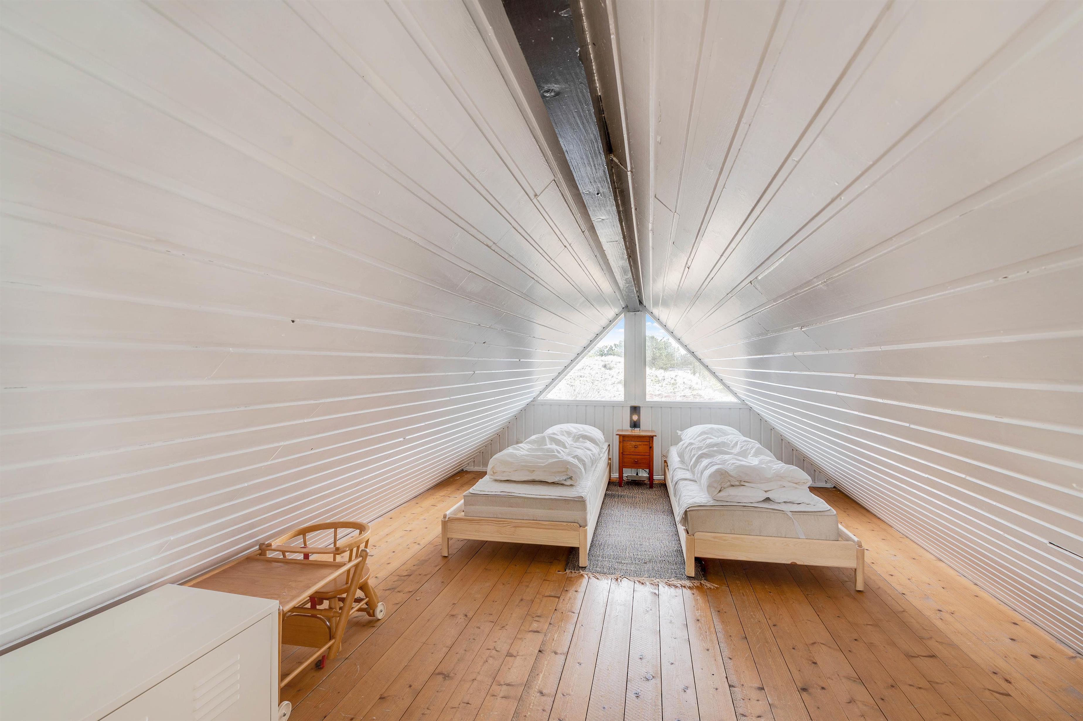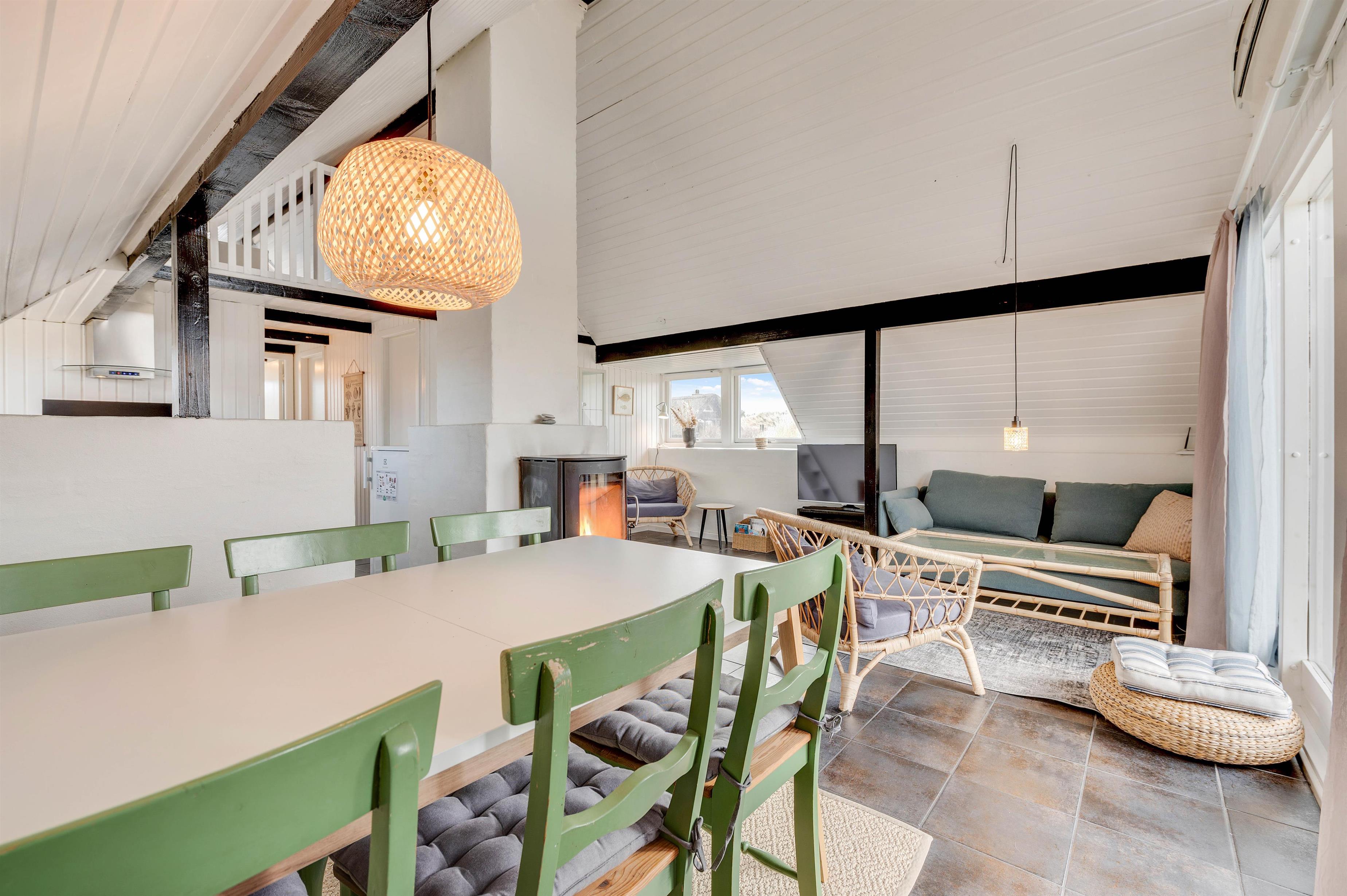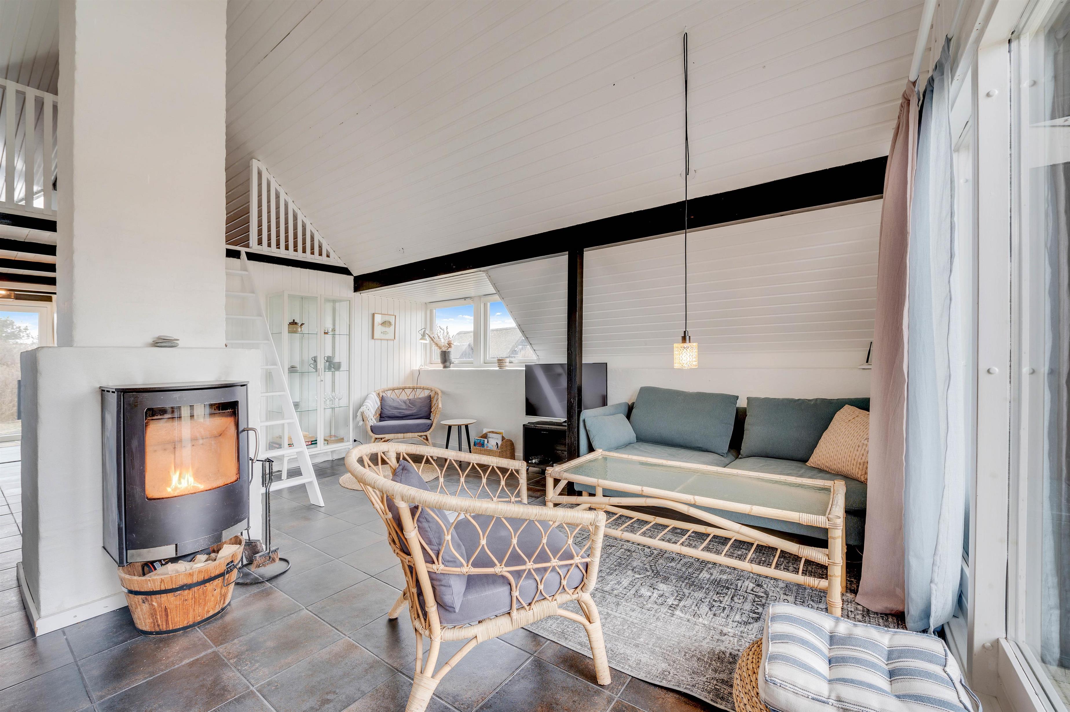 Sovepladserne er fordelt på 2 værelser med dobbeltseng og 2 enkeltmandssenge på sommerhusets hems. På hemsen kan familiens børn få lov til at have deres eget, mens de har udsigt ud over stuen og køkken. I stuen er der placeret en brændeovn, som I kan samles foran, mens I ser en god film eller spiller kort. I kan også streame jeres yndlingsserie på sommerhusets Chromecast.