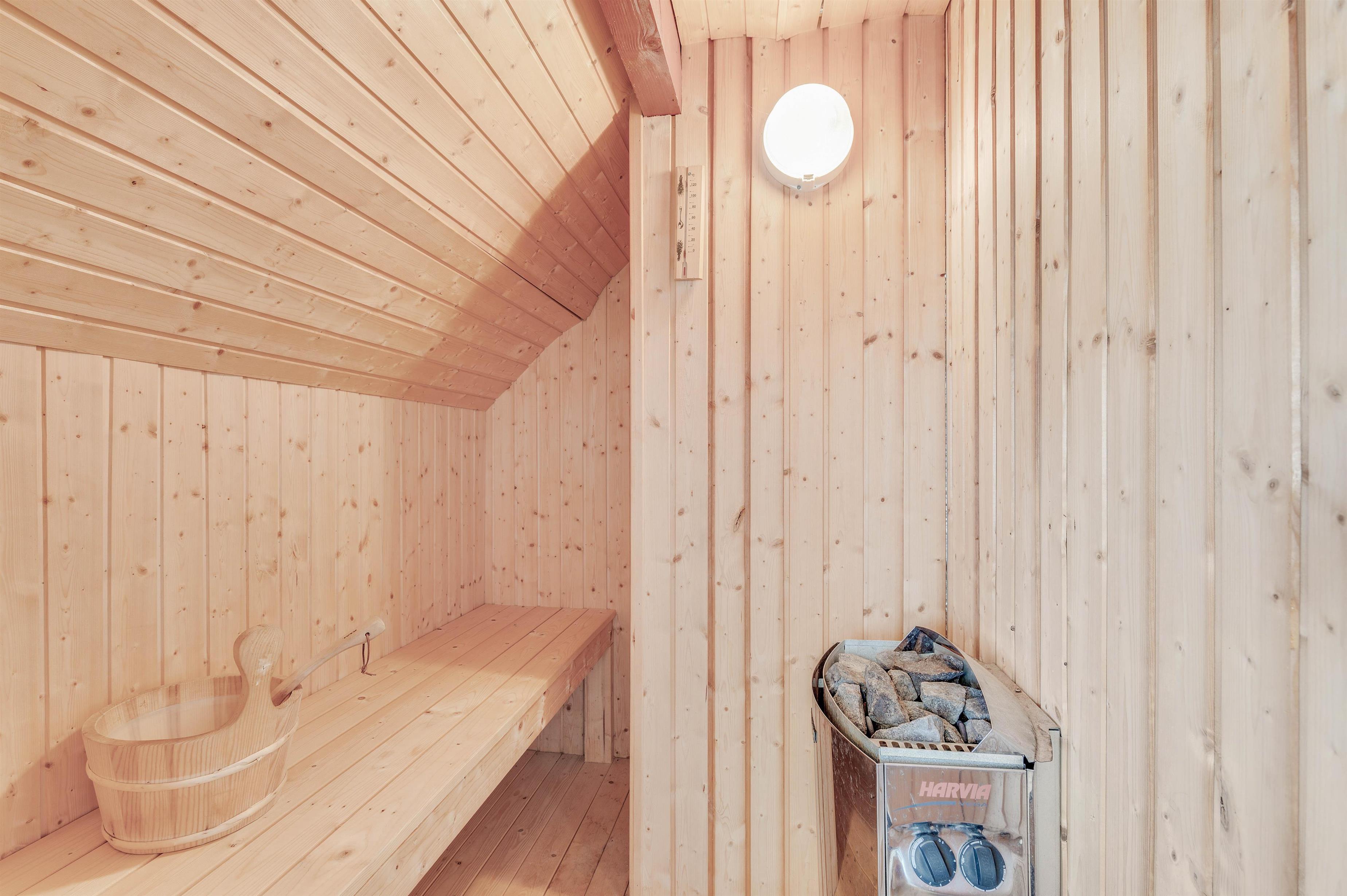 Hvis I ikke kan få nok af afslapning, så har sommerhuset en sauna. Her kan I nyde varmen og det ekstra velvære – så er det rigtigt ferie! Sommerhusets badeværelse er yderligere udstyret med gulvvarme.