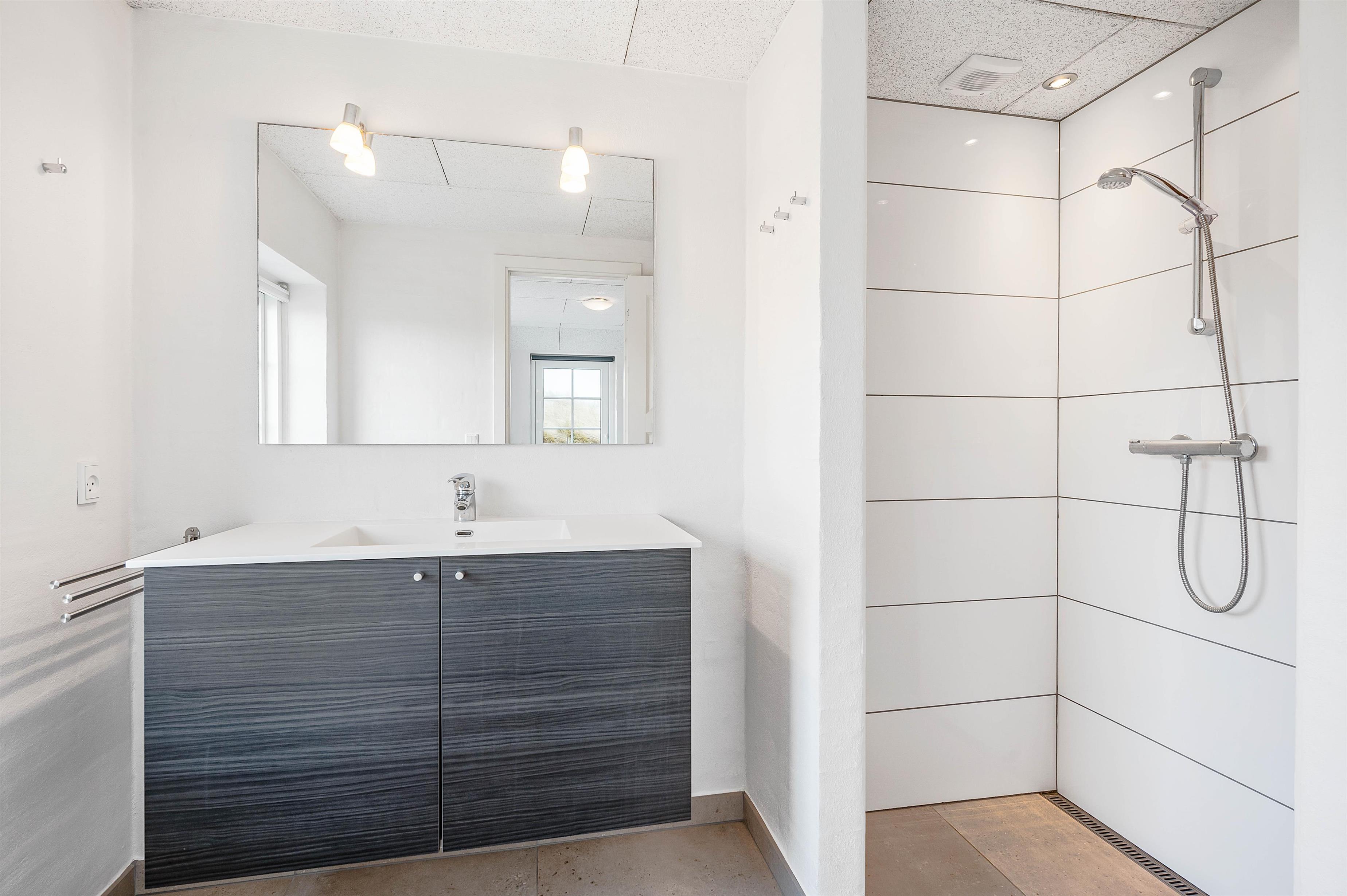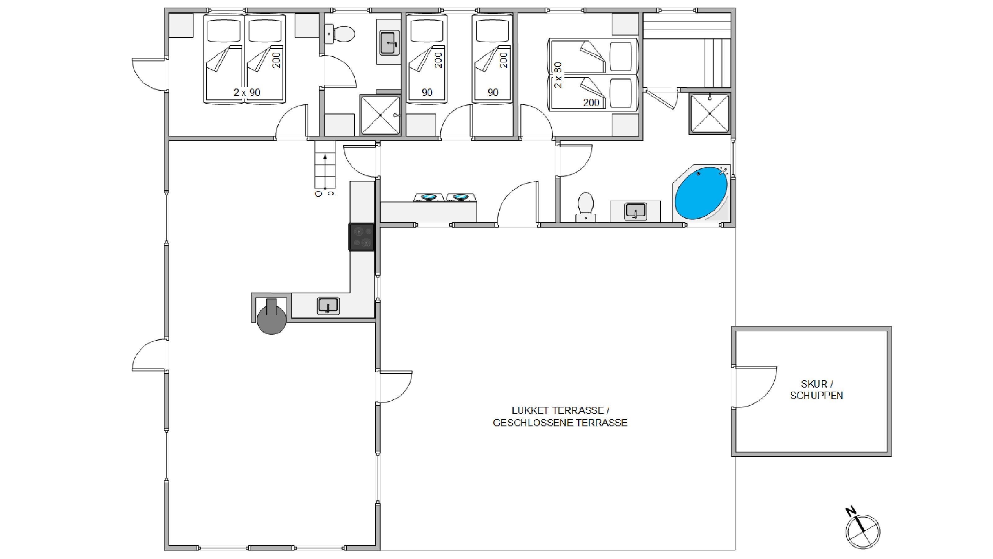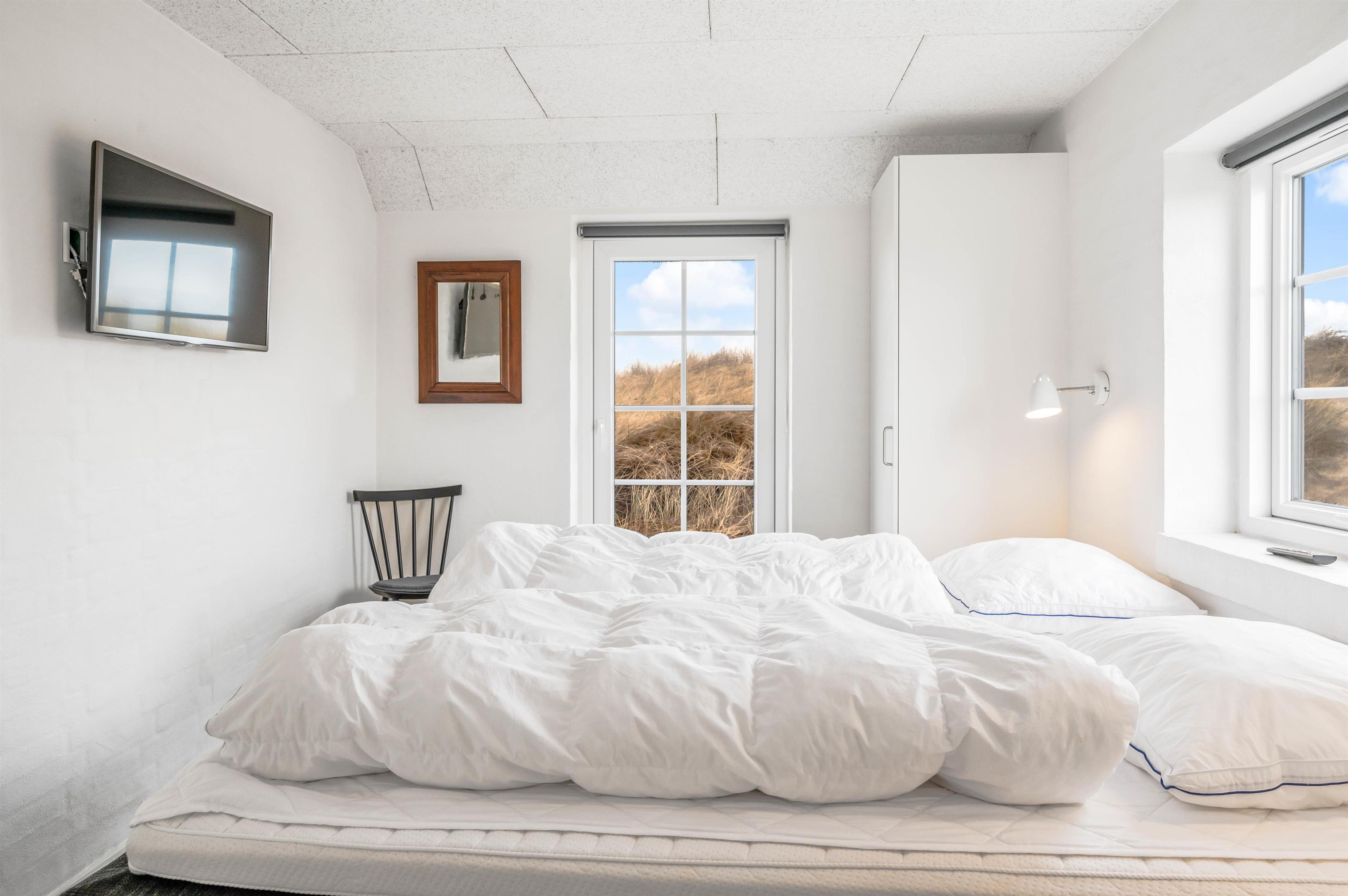 Sommerhuset består af tre lyse værelser med hver to sengepladser. To af værelserne er nydeligt indrettet med behagelige kontinentalsenge og skabsplads, mens det tredje indeholder to enkeltsenge. Oplagt til familiens teenagere.
