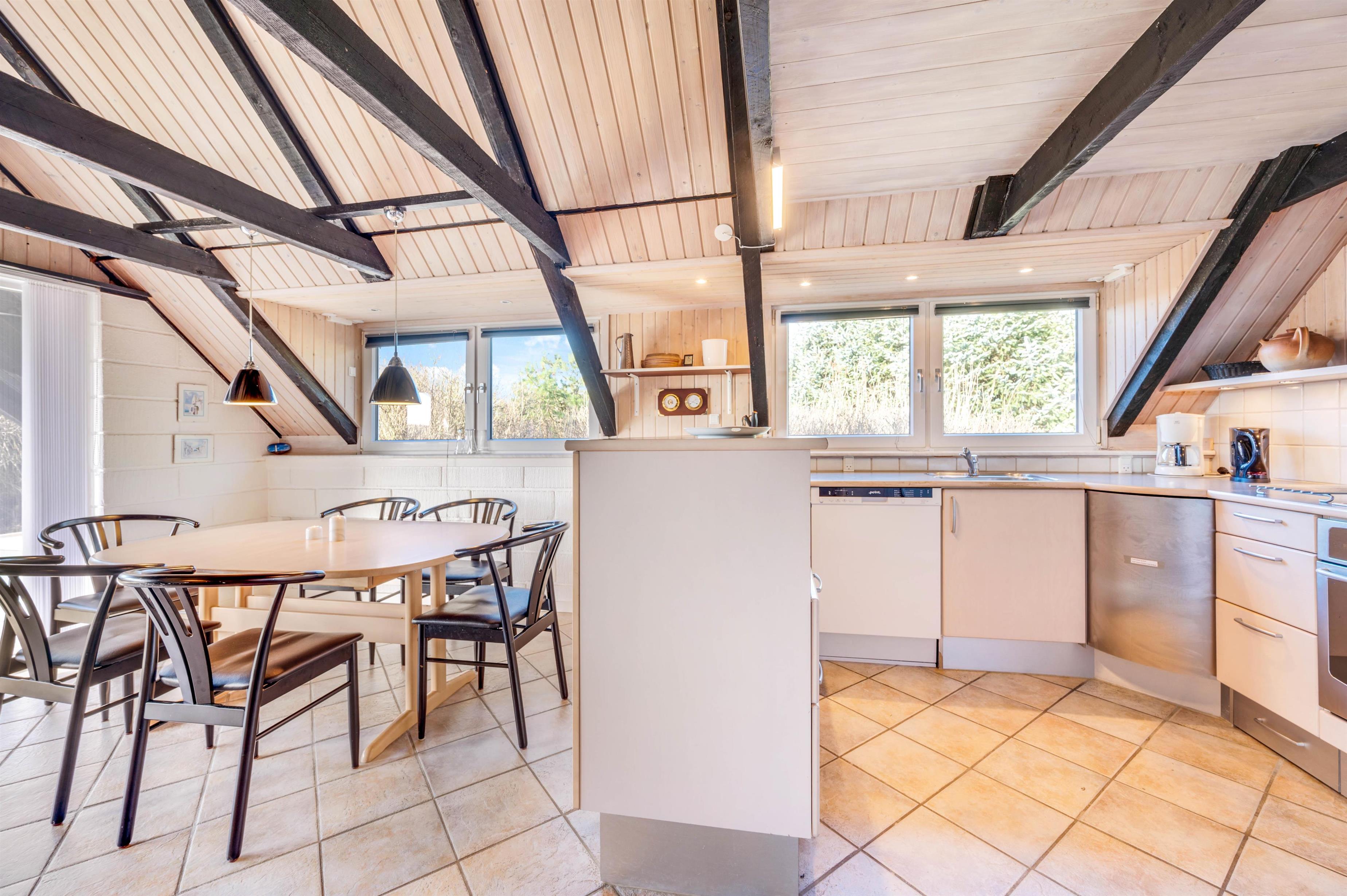 Sommerhusets opholdsstue er samlingspunktet for hele feriebesætningen. Her kan I samle jer til hyggelige stunder med madlavning, spil og film. For at sætte prikken over i’et, kan I tænde op i brændeovnen, der sørger for god varme og stemning. Fra stuen har I også udsigt til Nr. Lyngvig Fyr.
