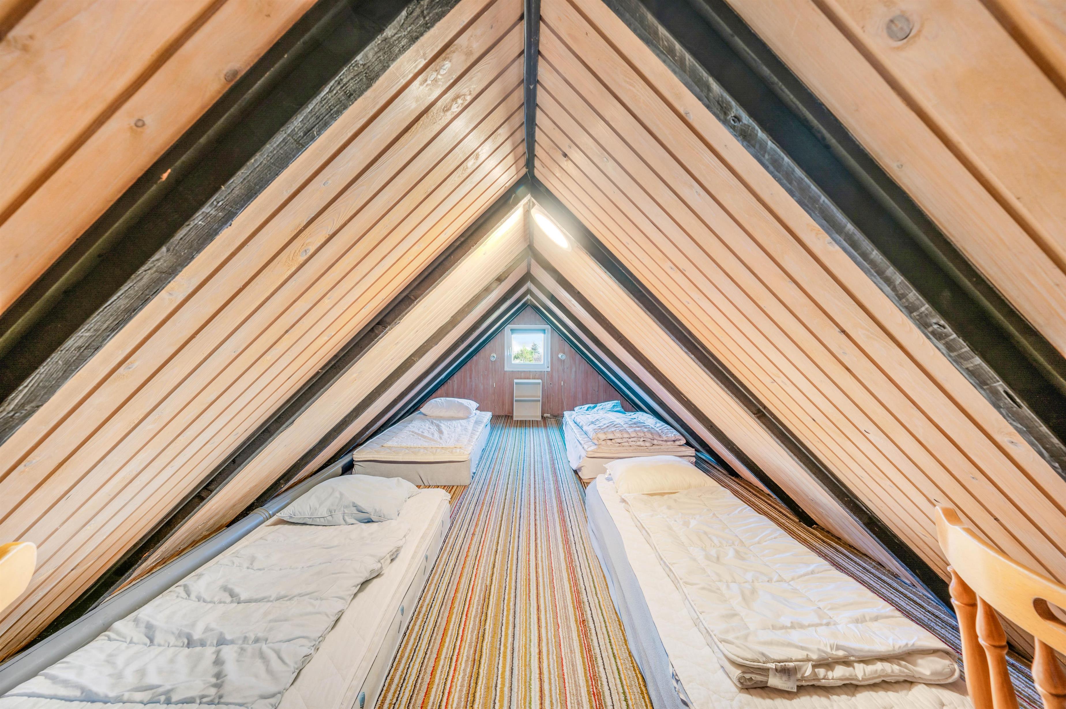 I sommerhuset er der 3 soveværelser og 1 badeværelse med en lækker sauna. Derudover er der også en hems i feriehuset. Har I børn med på ferien, vil de helt sikkert elske at have førsteret til hemsen.