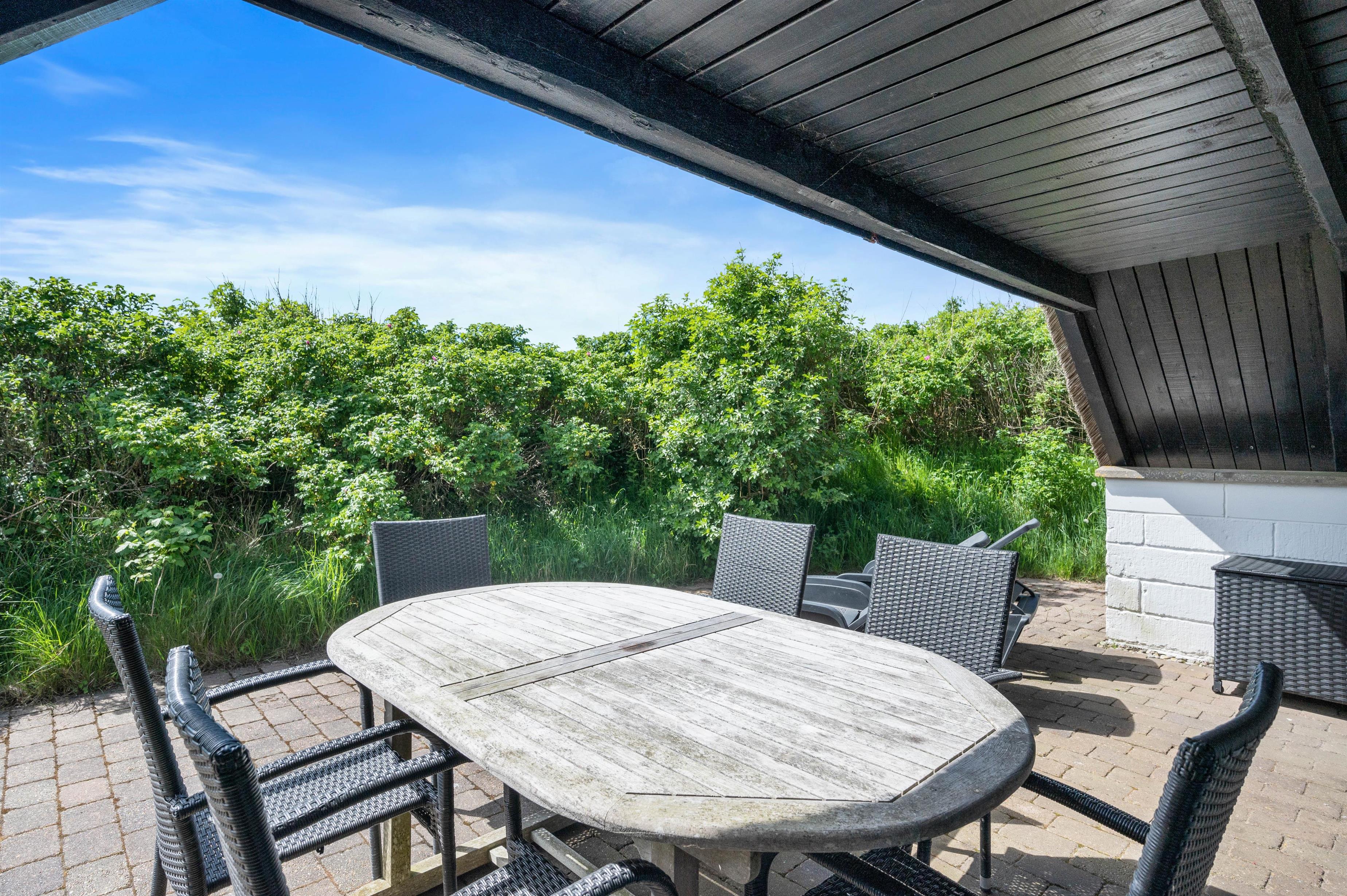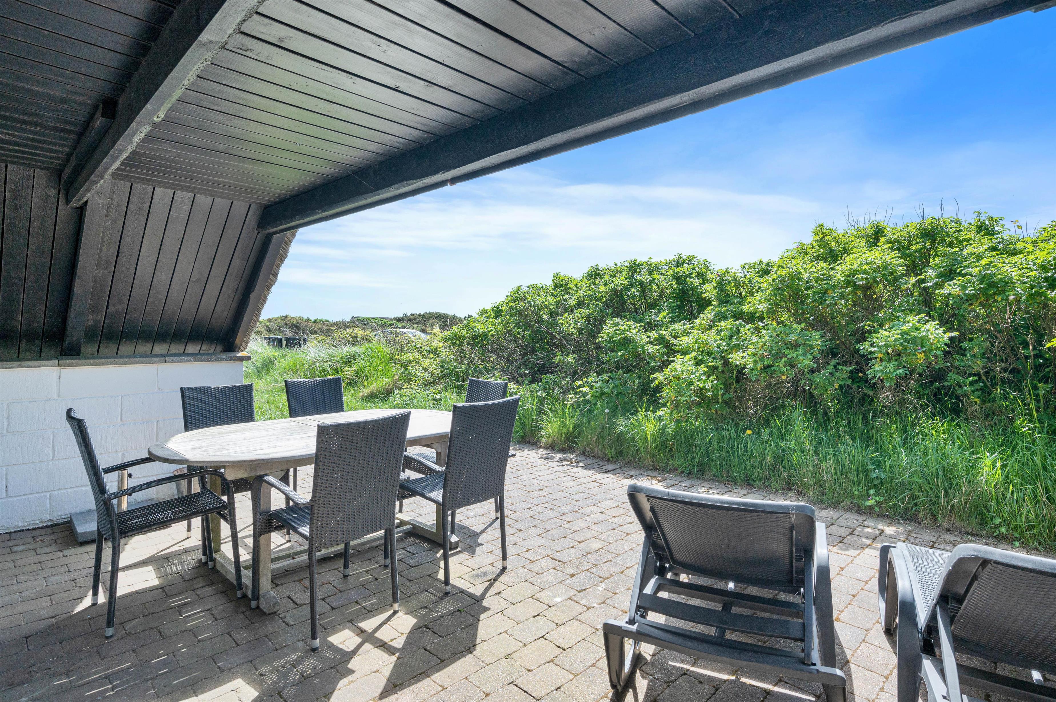 Fra opholdsstuen kan I træde ud på terrassen, der er delvist overdækket. Terrassen vender mod sydvest, så I har sol både om dagen og aftenen. I har både havemøbler, liggestole og grill til rådighed, så I kan få mest muligt ud af de solrige dage.