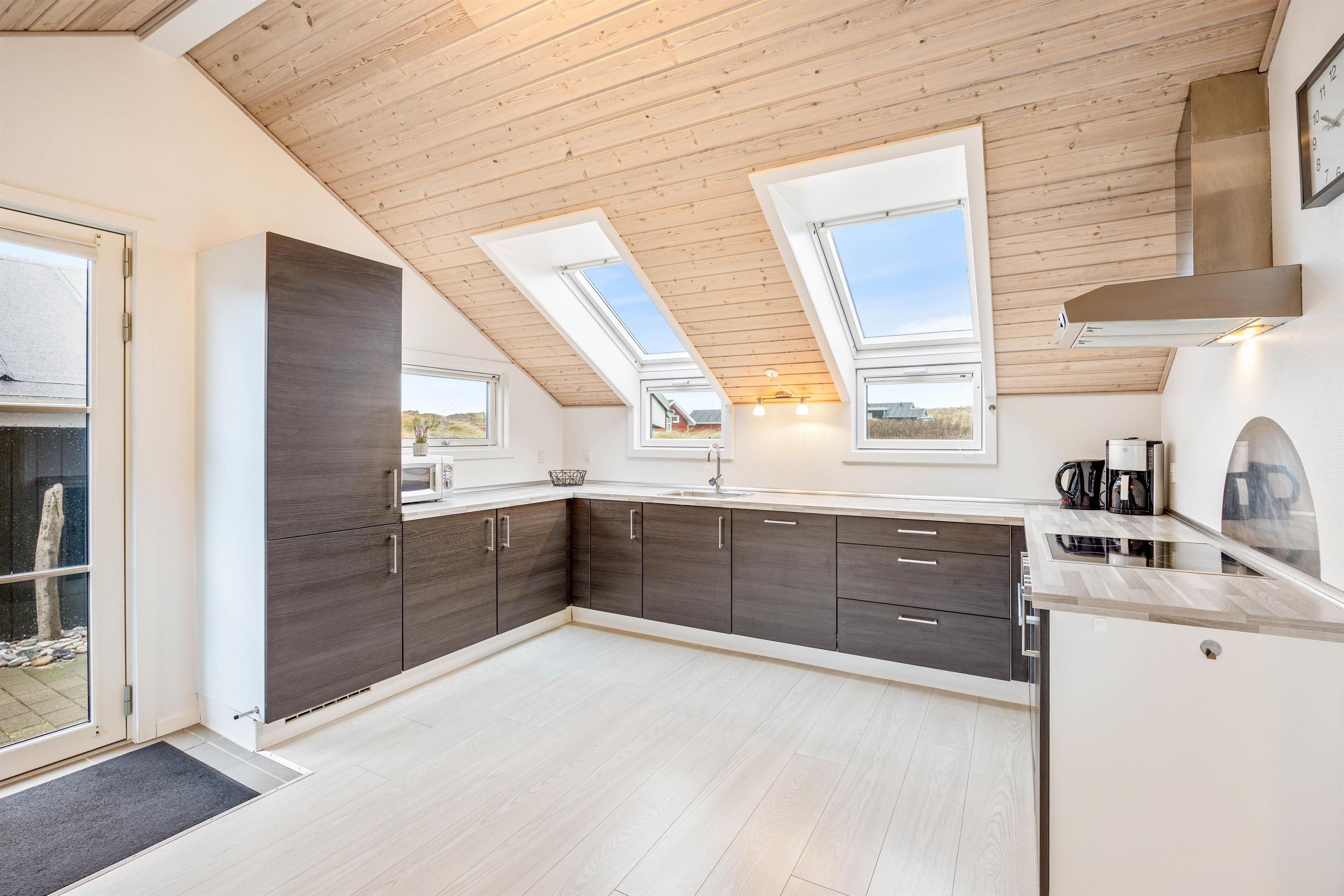 Møblerne såvel som det store og elegante køkken skaber en hjemlig form for hygge. Køkkenet er tilmed veludstyret med en opvaskemaskine, 80 liter fryser og mikrobølgeovn, så feriekokken kan slå sig løs med den friskfangede (friskhentede) fisk fra havnebyen Hvide Sande.