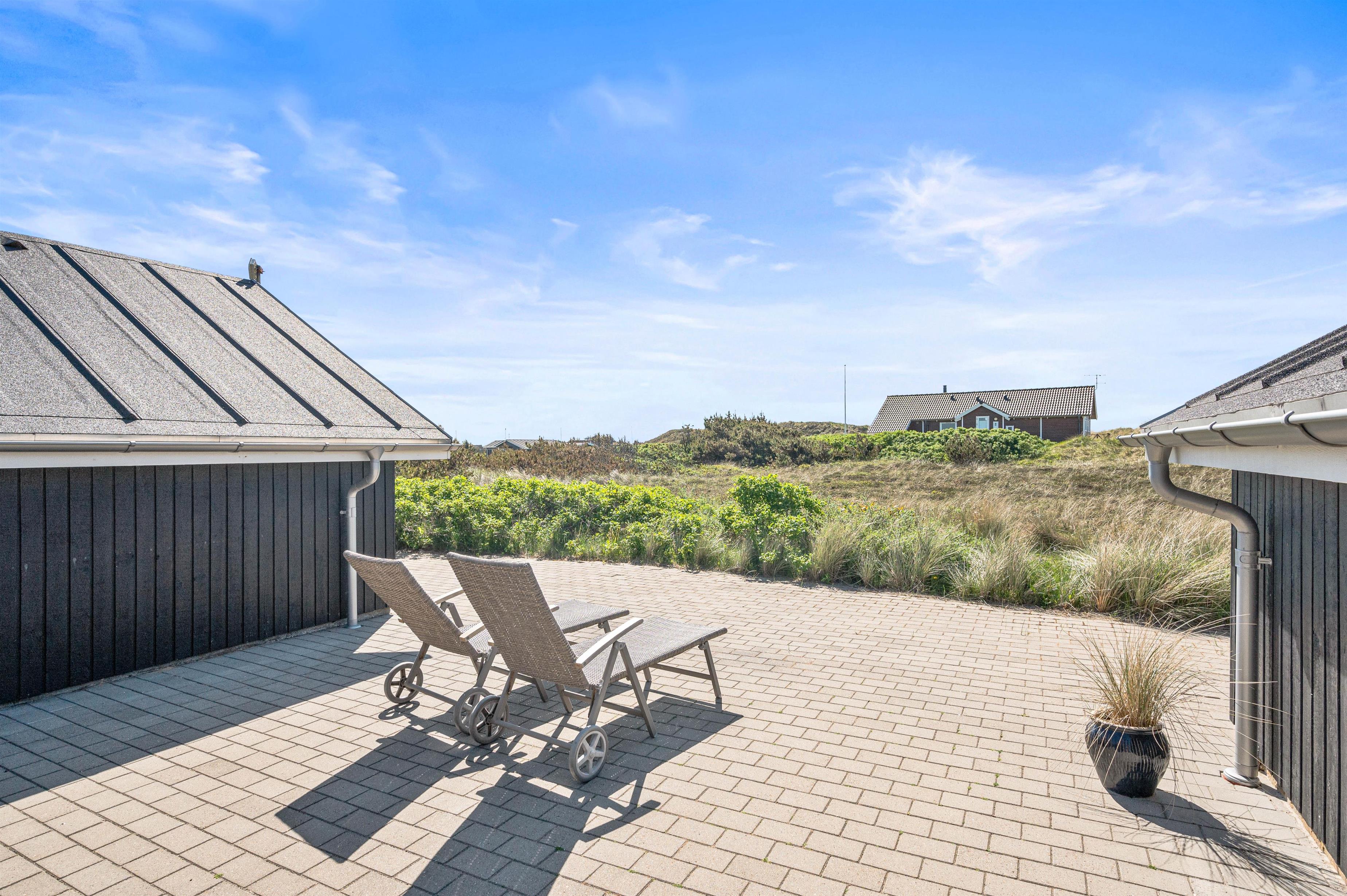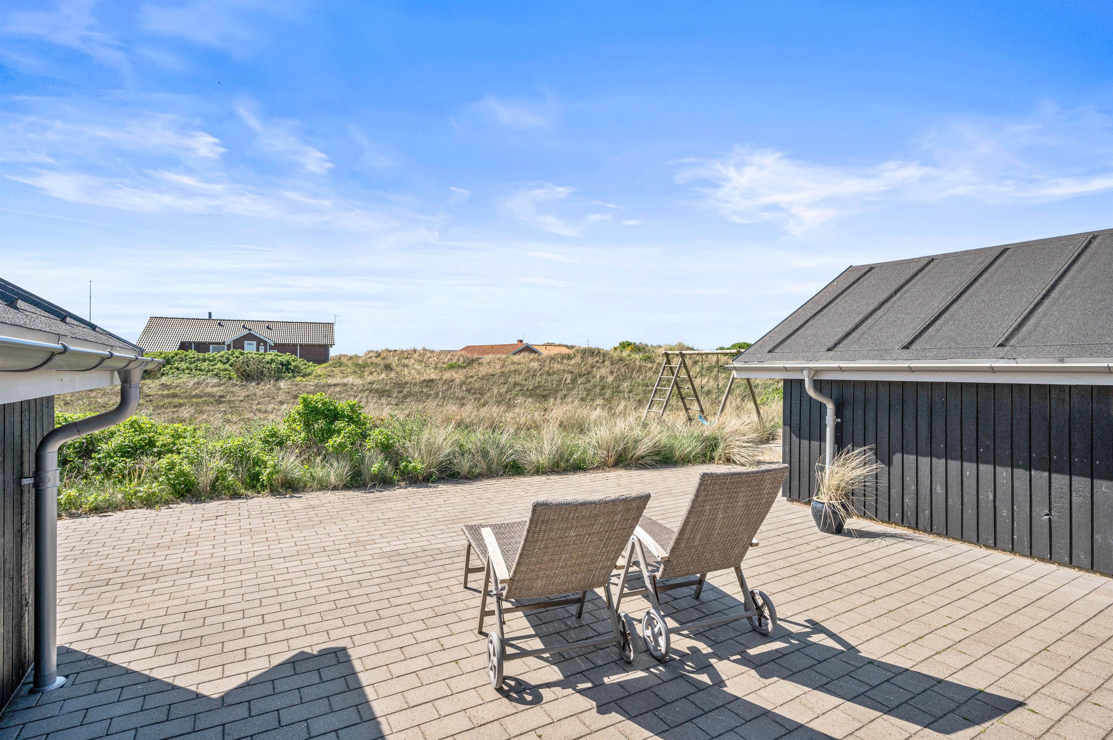 Sommerhusets store stenbelagte terrasse strækker sig langs hele sydsiden af huset. Der er gode havemøbler og en grill til aftensmaden. Børnene vil elske gyngestativet og sandkassen.