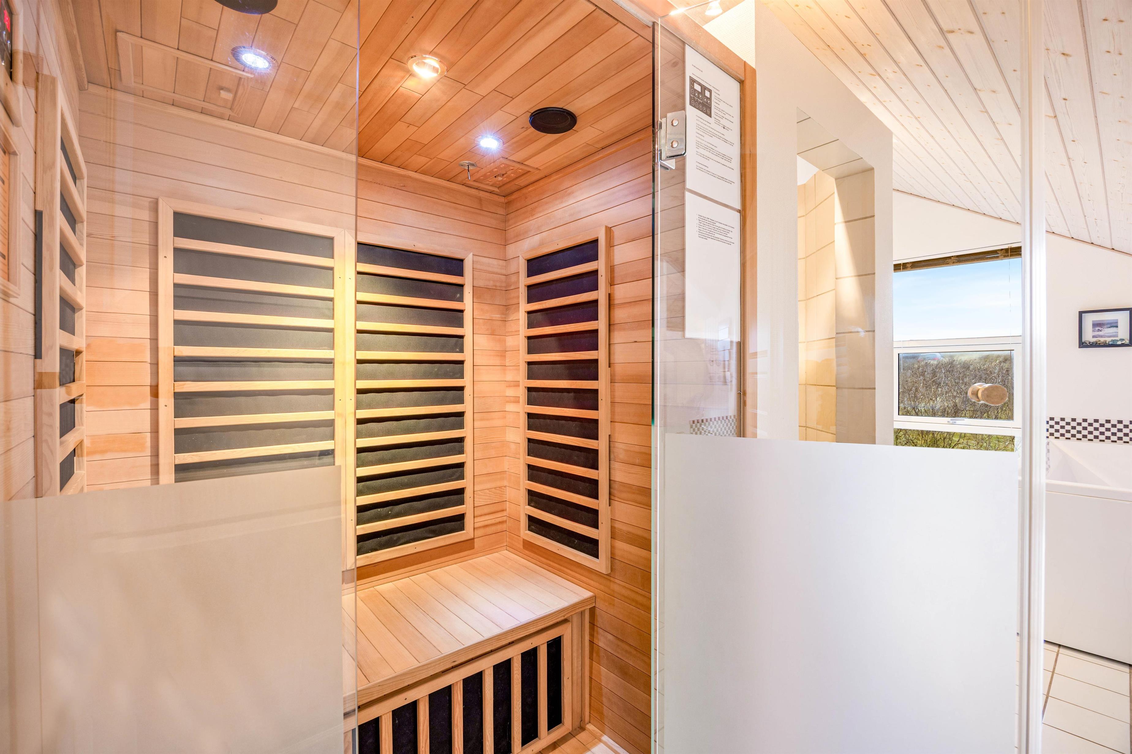 Badeværelset er ikke blot dejlig rummeligt og lyst, men en sand oase af velvære. De tre vinduer lukker dagslyset ind i rummet og al hverdagsstress ud. Hjørnespaen og infrarødsaunaen byder ind til afslapning og kvalitetstid. Et skønt afbræk fra hverdagen kombineret med den friske havluft er wellness for krop og sind.