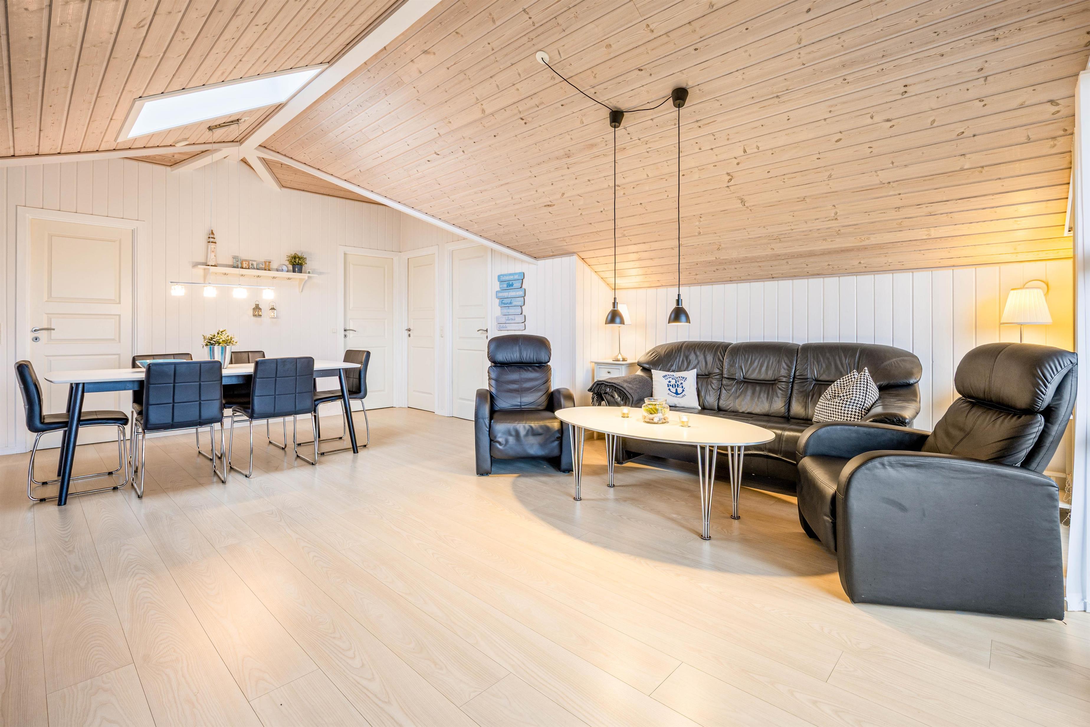 De høje, lyse trælofter sammen med de indbyggede ovenlysvinduer giver sommerhuset en god pladsfornemmelse.