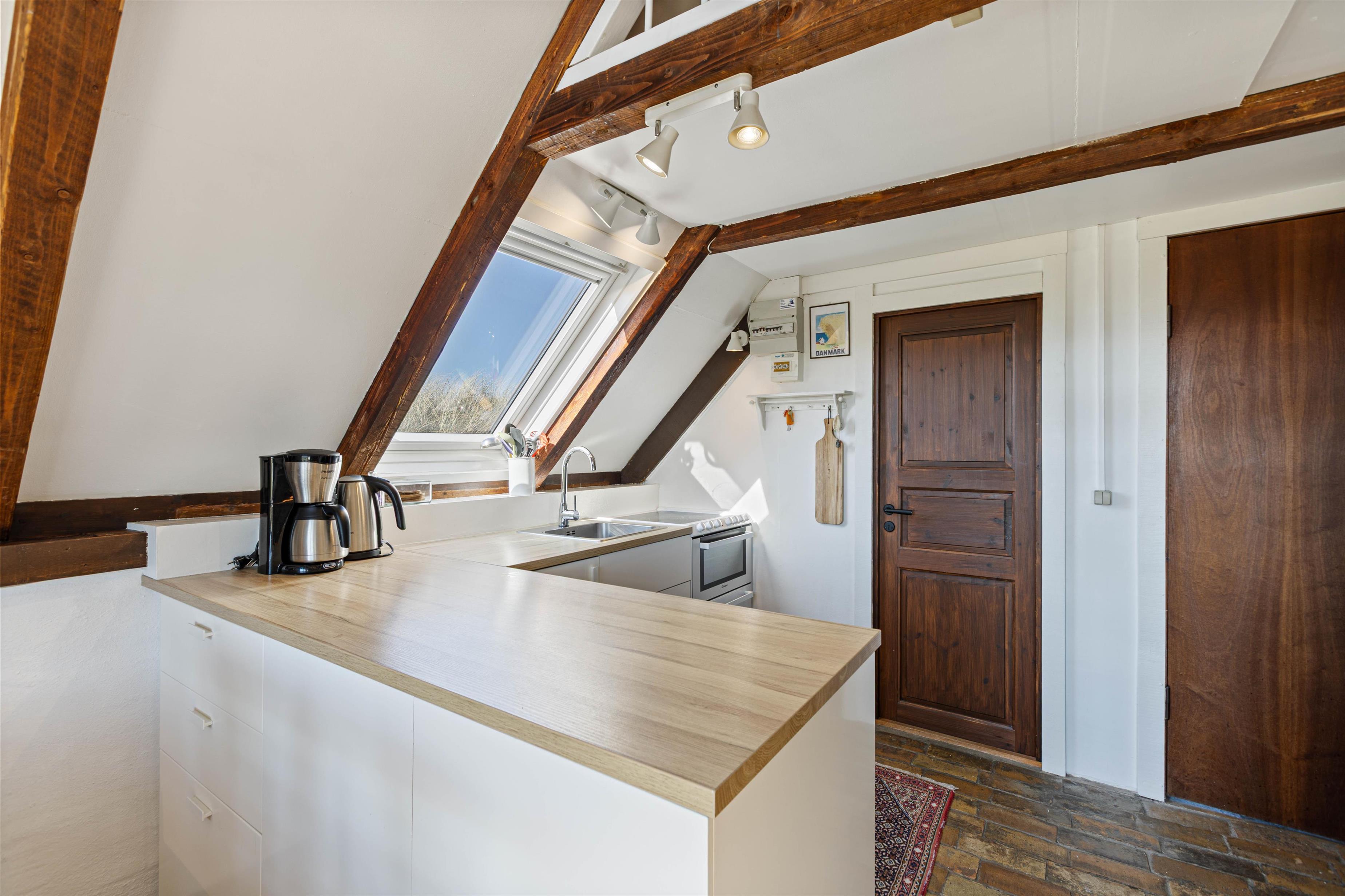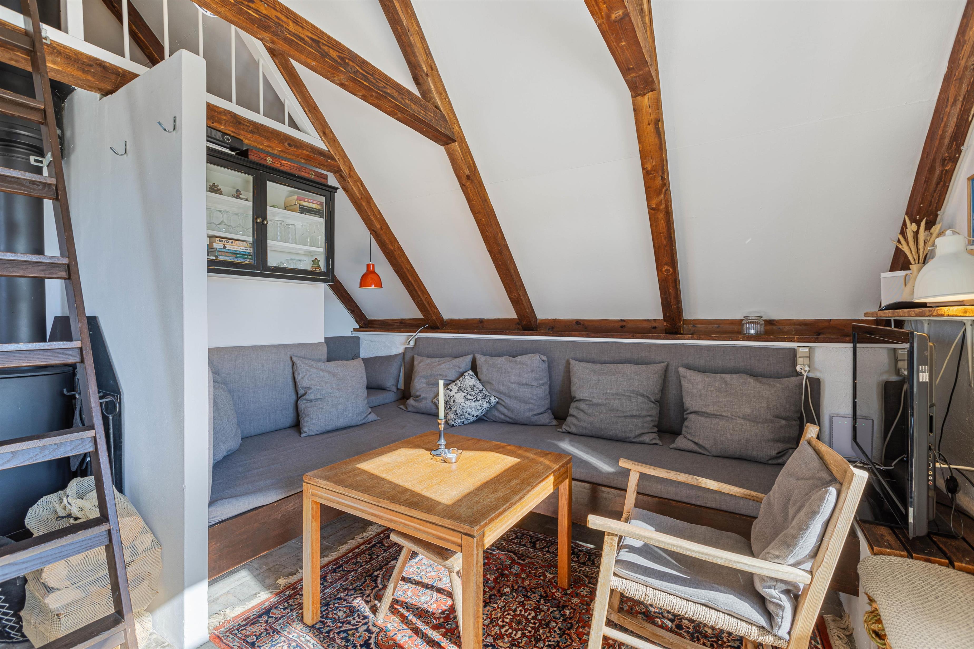 Husets hjerte er det åbne opholdsrum, hvor stue og køkken er lagt sammen, og hele familien kan samles til en masse hyggelige stunder. Her står også brændeovnen, som sørger for varme og god feriestemning i alle årets måneder.