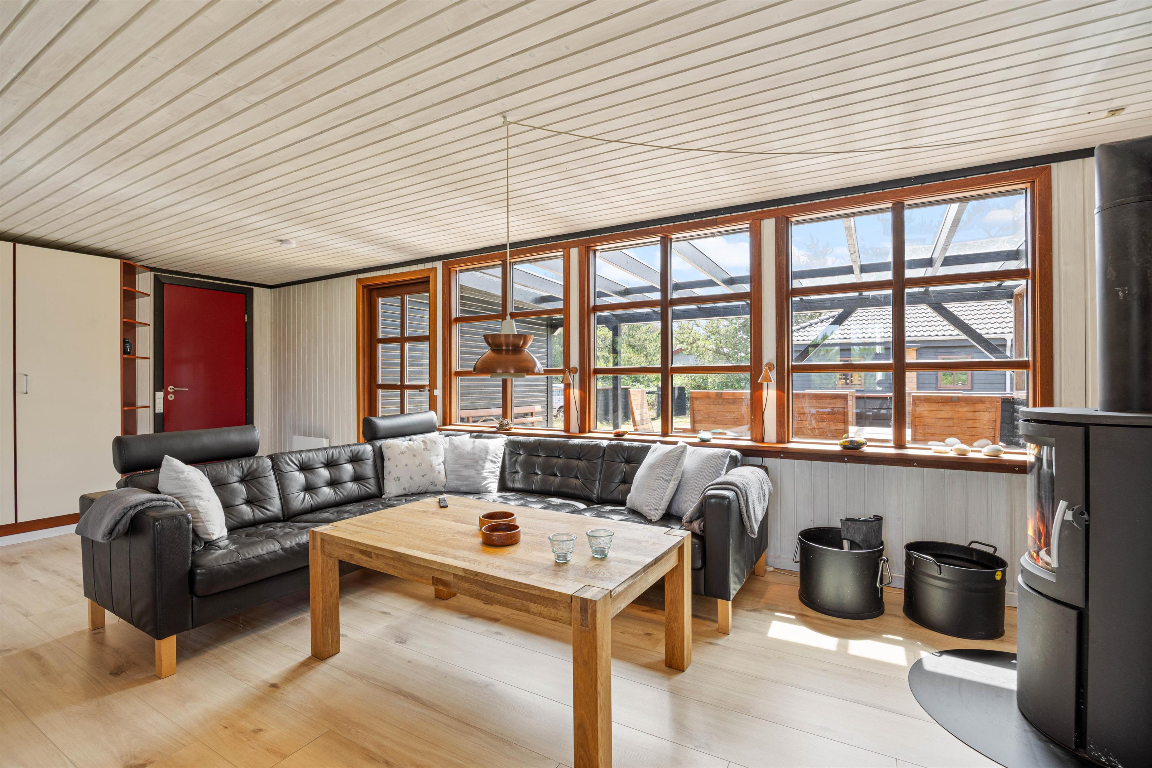 Indenfor bliver I mødt af en dejlig og hyggelig atmosfære. I stuen kan I samles omkring brændeovnen – perfekt til en rolig aften med spil og film med ildens knitrende lyde i baggrunden. Det åbne køkken er blandt andet udstyret med opvaskemaskine, så I ikke skal tænke på opvasken efter madlavningen.