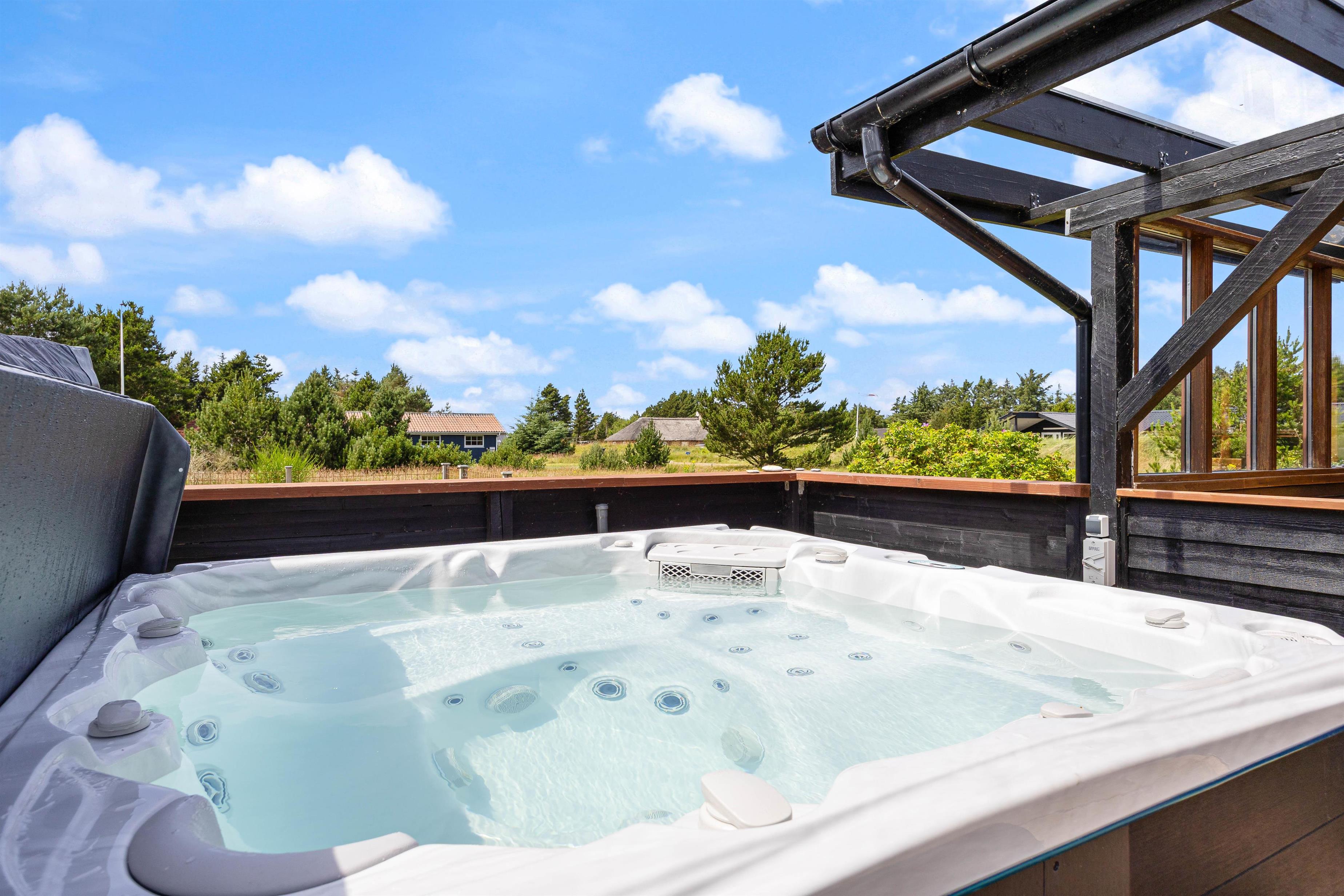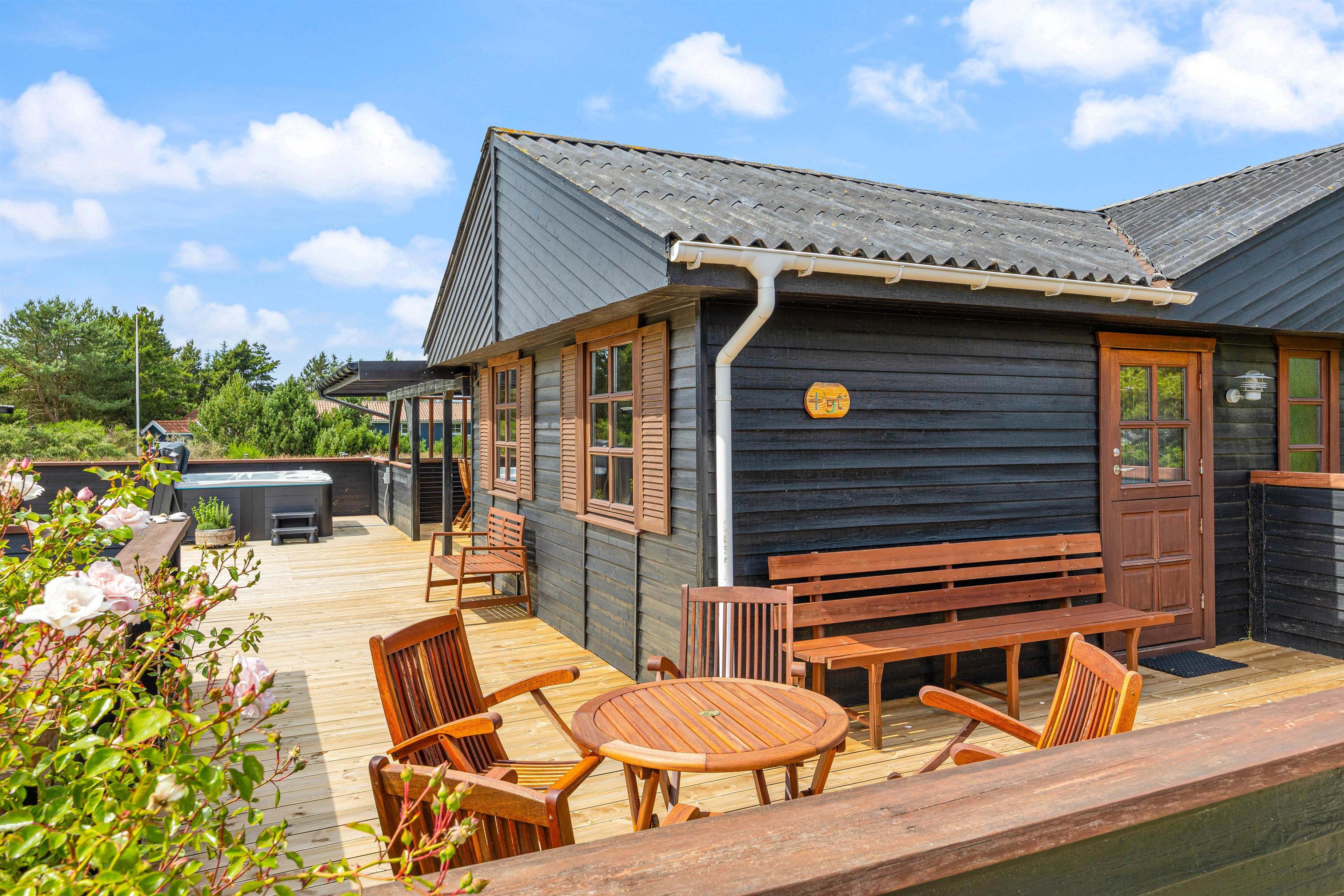 Udenfor finder I en skøn terrasse som er delvist overdækket og helt lukket – perfekt til at hundene kan løbe frit rundt. Her kan I sætte jer ned i havemøblerne og nyde solen med en god bog i hånden. Når I trænger til at komme helt ned i gear, kan I tage et dyp i udespaen og nyde roen.
