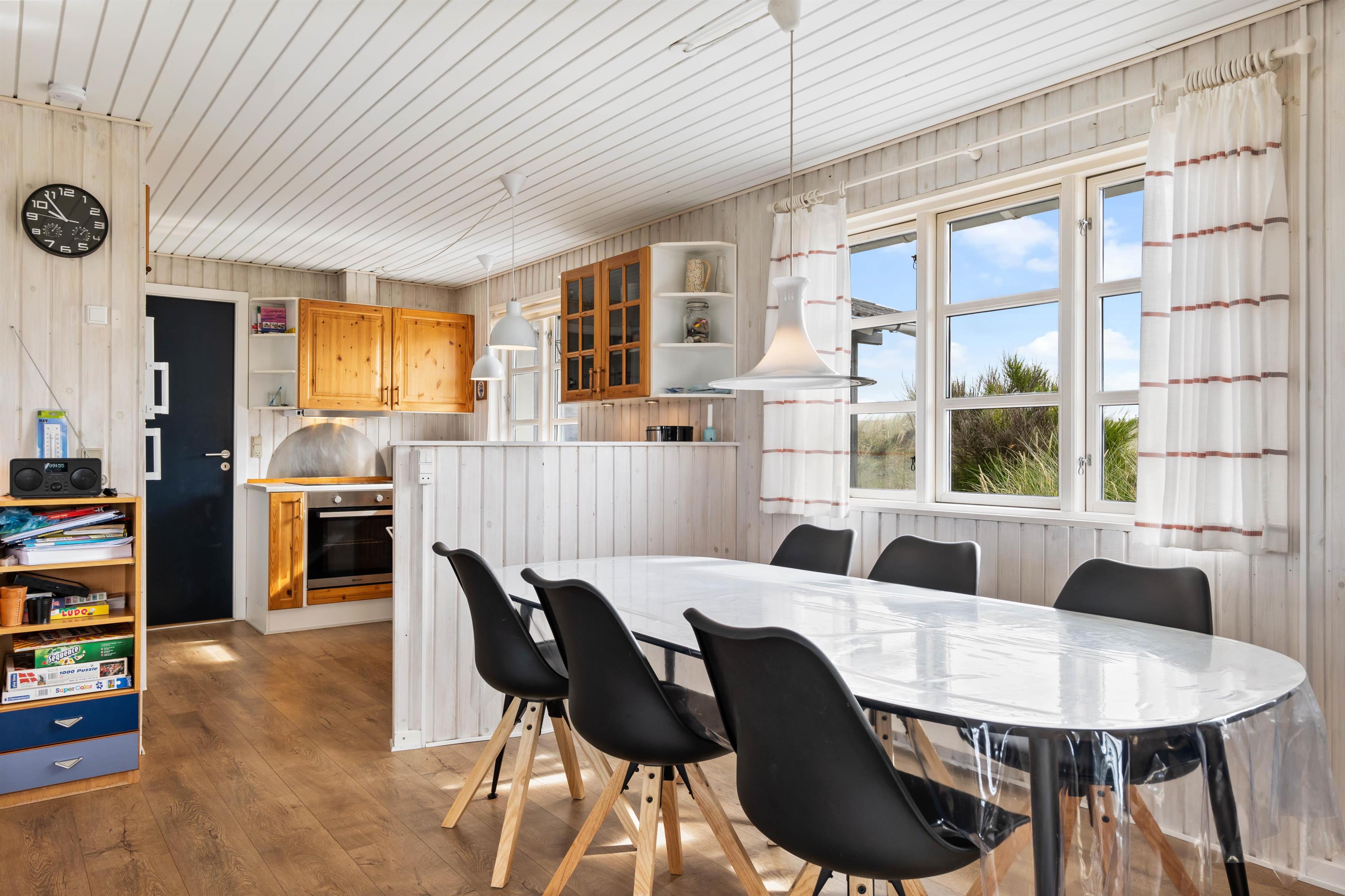Sommerhuset er hyggeligt indrettet, og I vil utvivlsomt samles i feriehusets kombinerede stue-, køkken– og spiseafdeling. Her kan I følge med i madlavning og slappe af med en god kop kaffe eller et godt brætspil, alt sammen på samme tid.