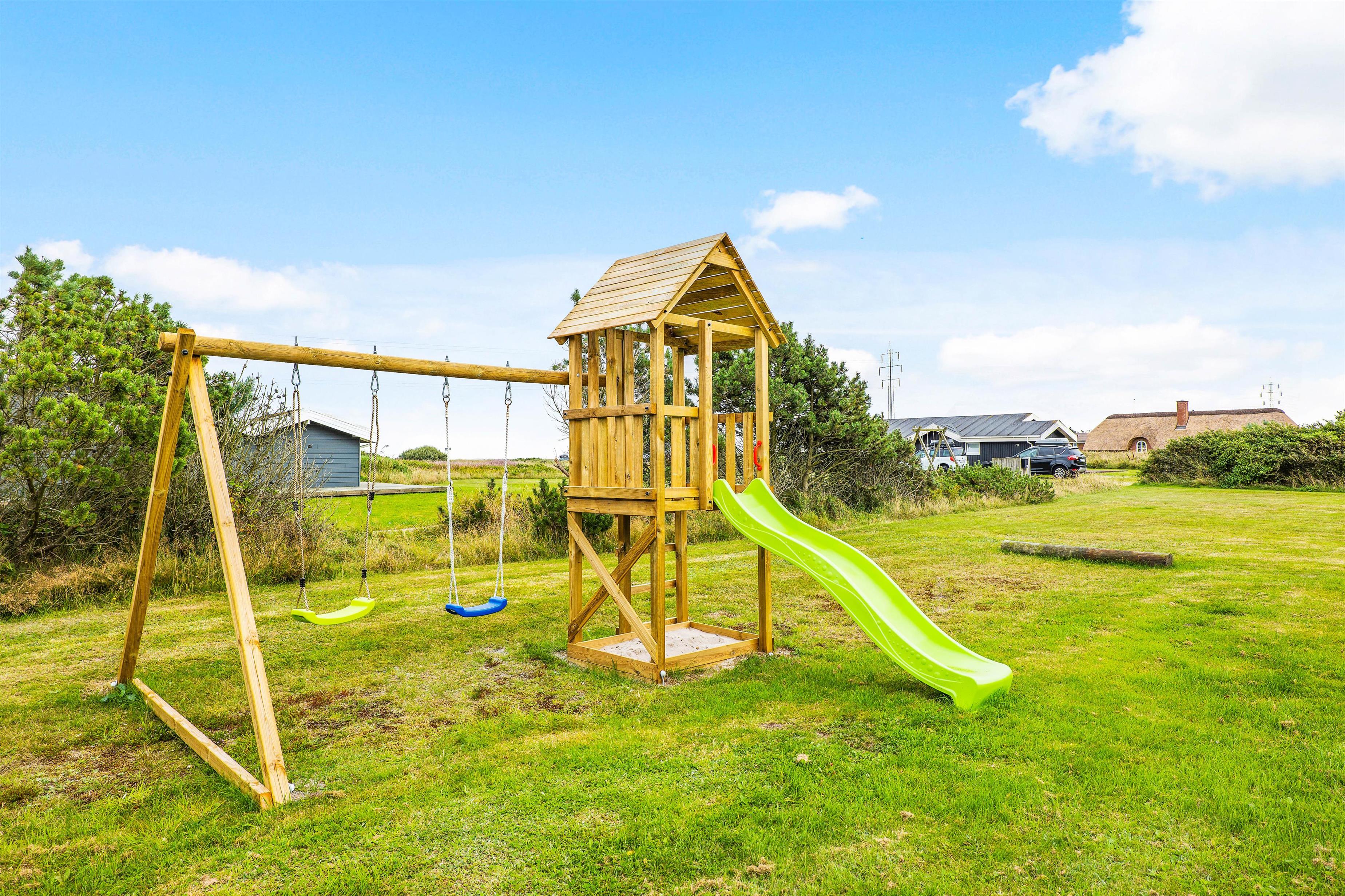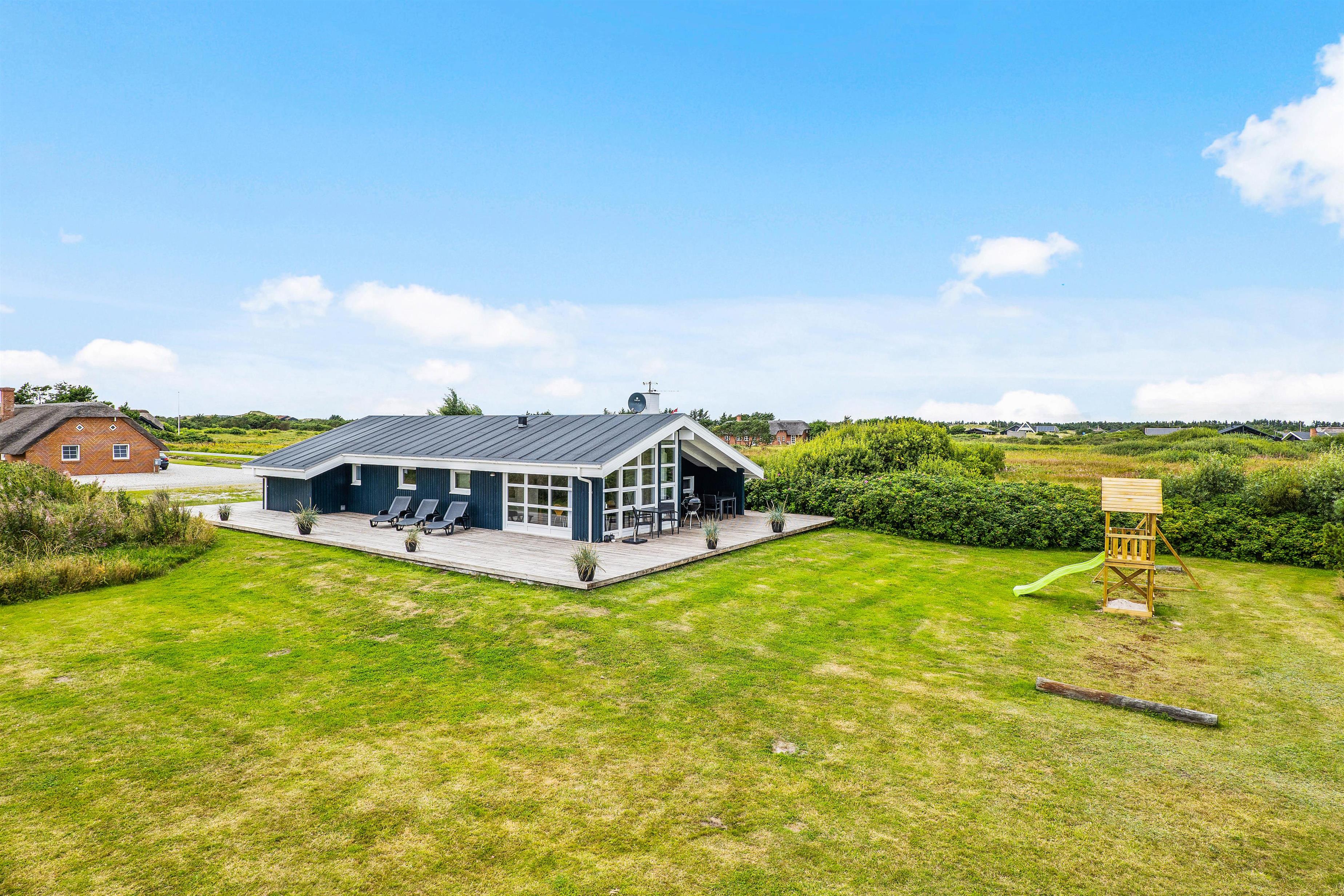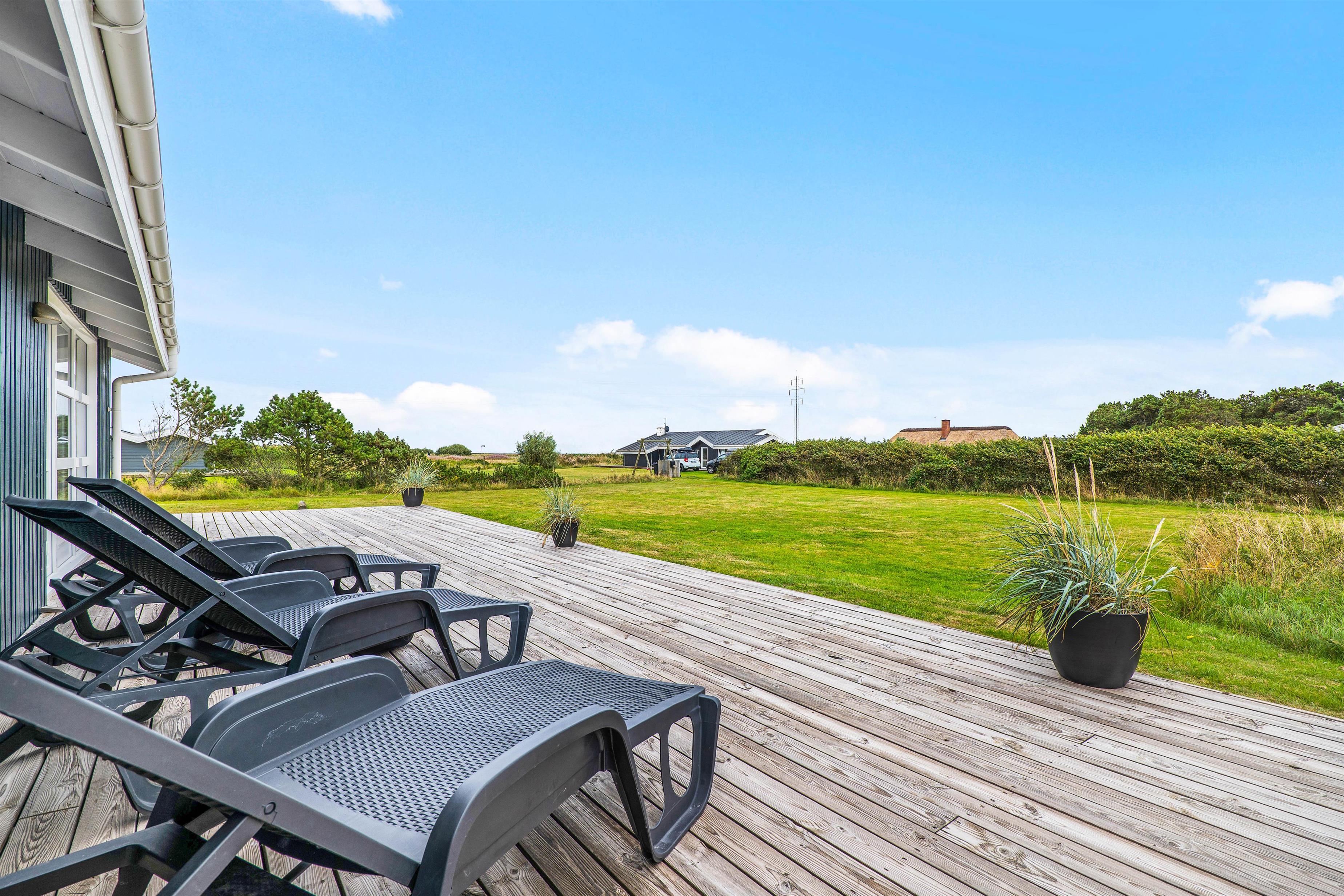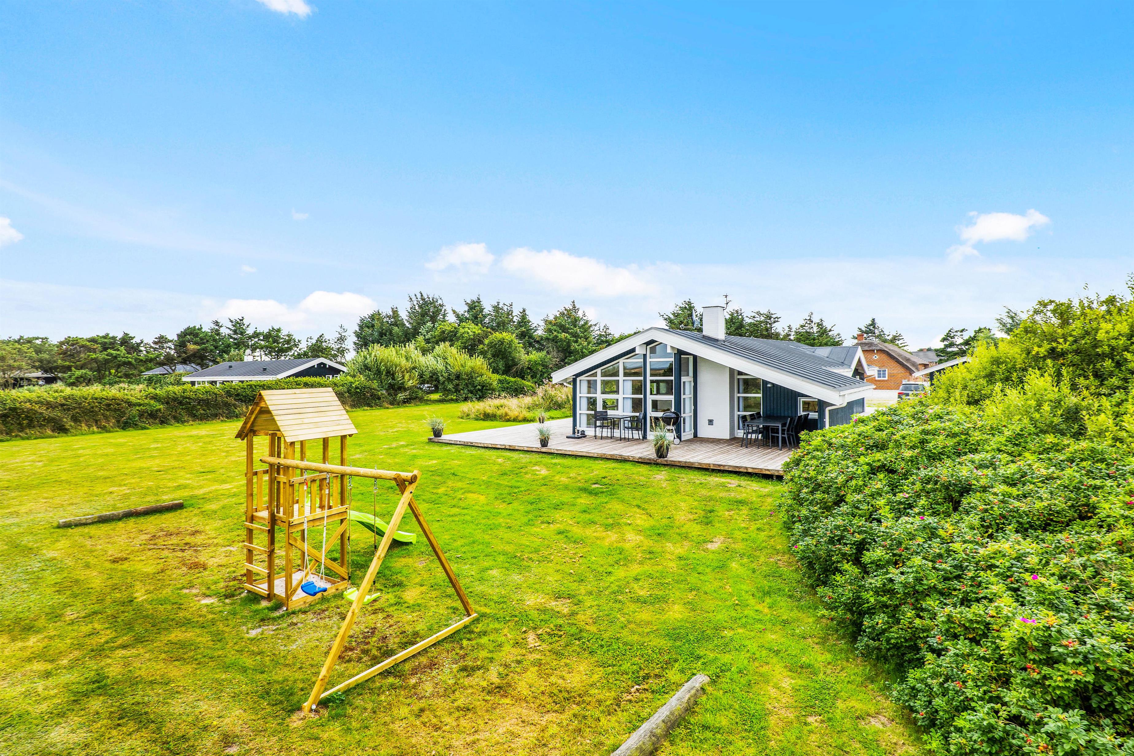 Fra den sydøst vendte terrasse er der en flot udsigt til Ringkøbing Fjord, ligesom man kan nyde den delvist overdækkede terrasse mod øst. Der er terrasse hele vejen rundt om huset, så morgenkaffen kan også indtages mod nordøst. Vesterhavet er kun 800 m fra huset, og det er naturligvis et perfekt sted for traveture med børn og hund. På græsplænen er der et gyngestativ til børnene.