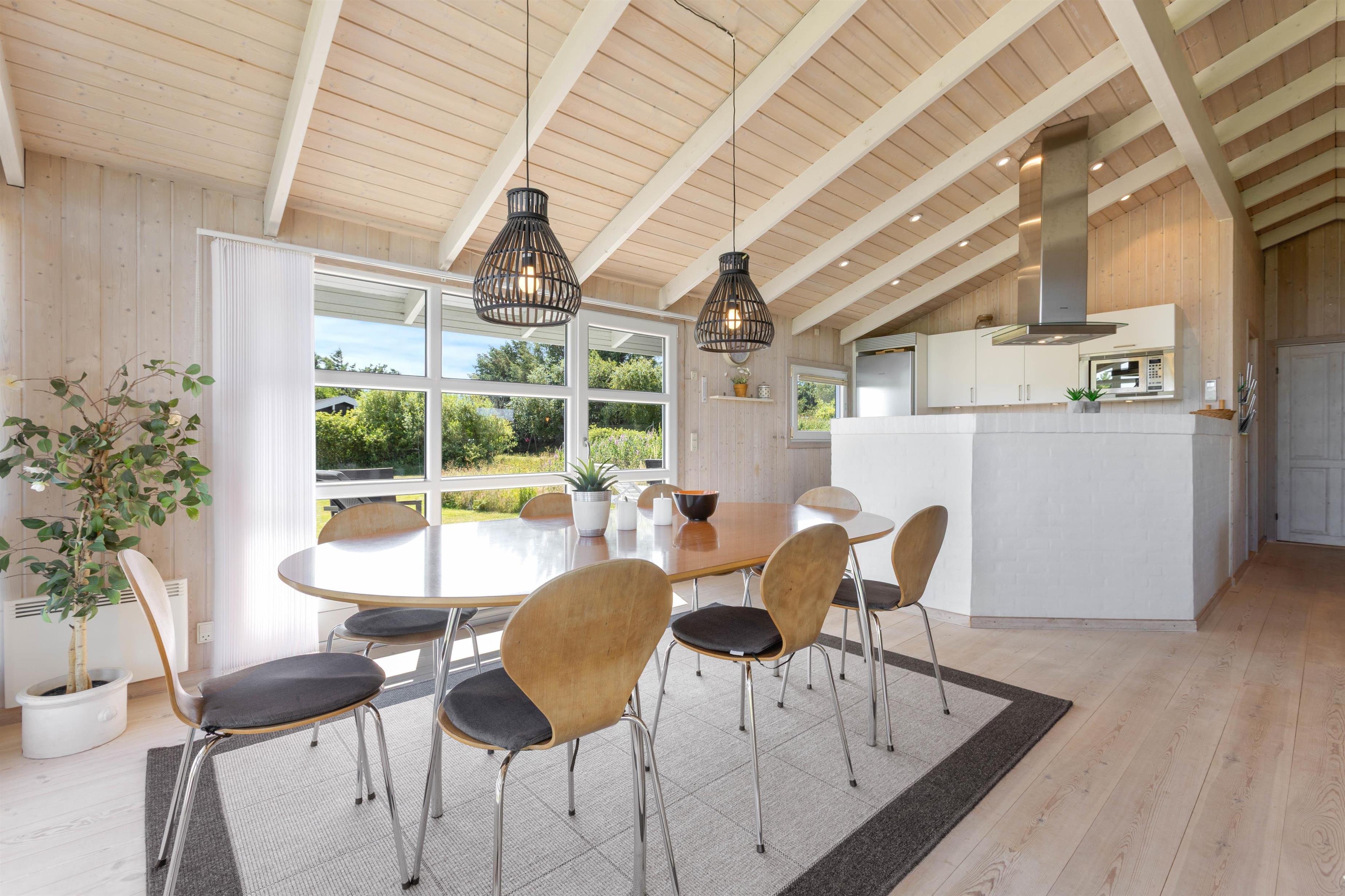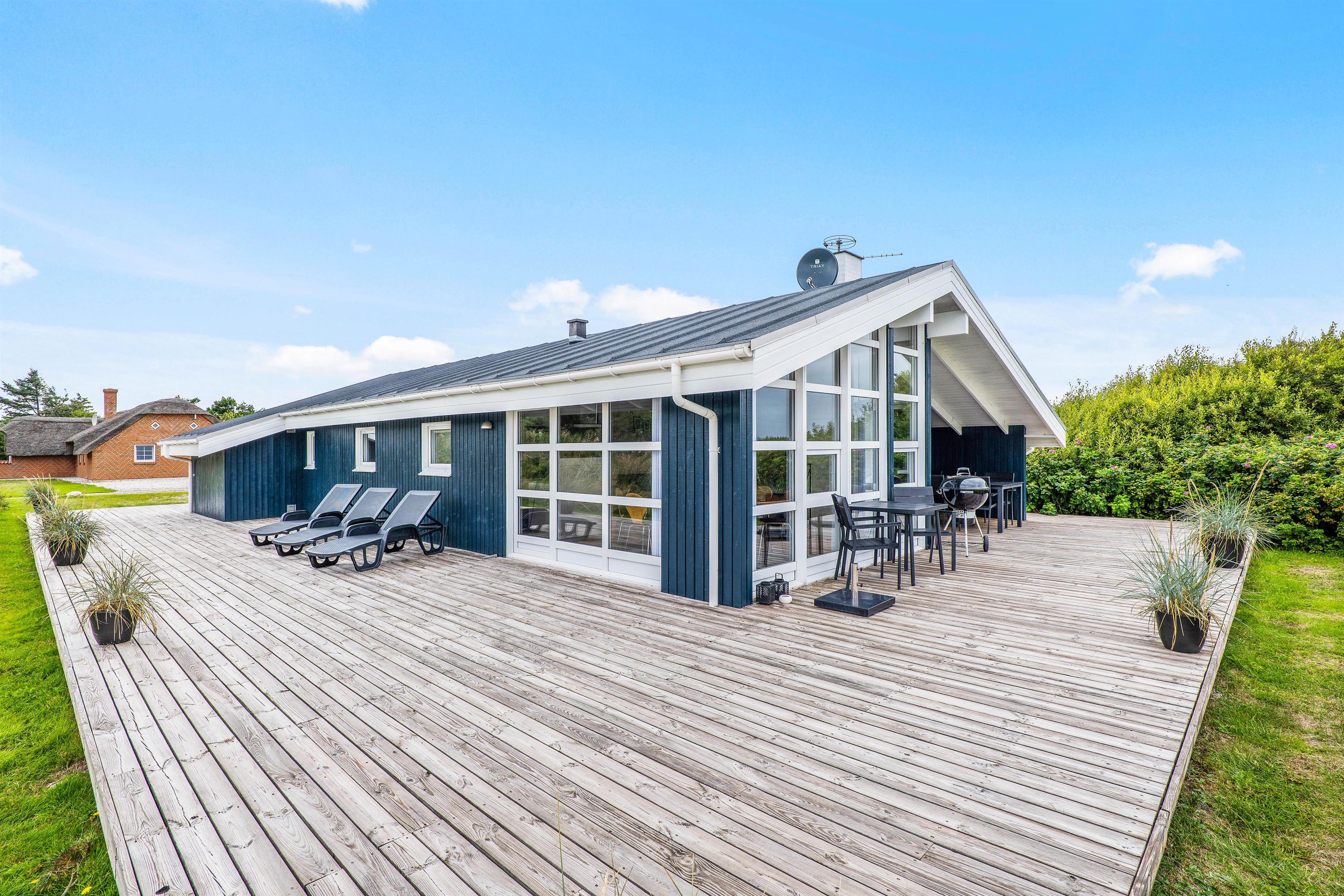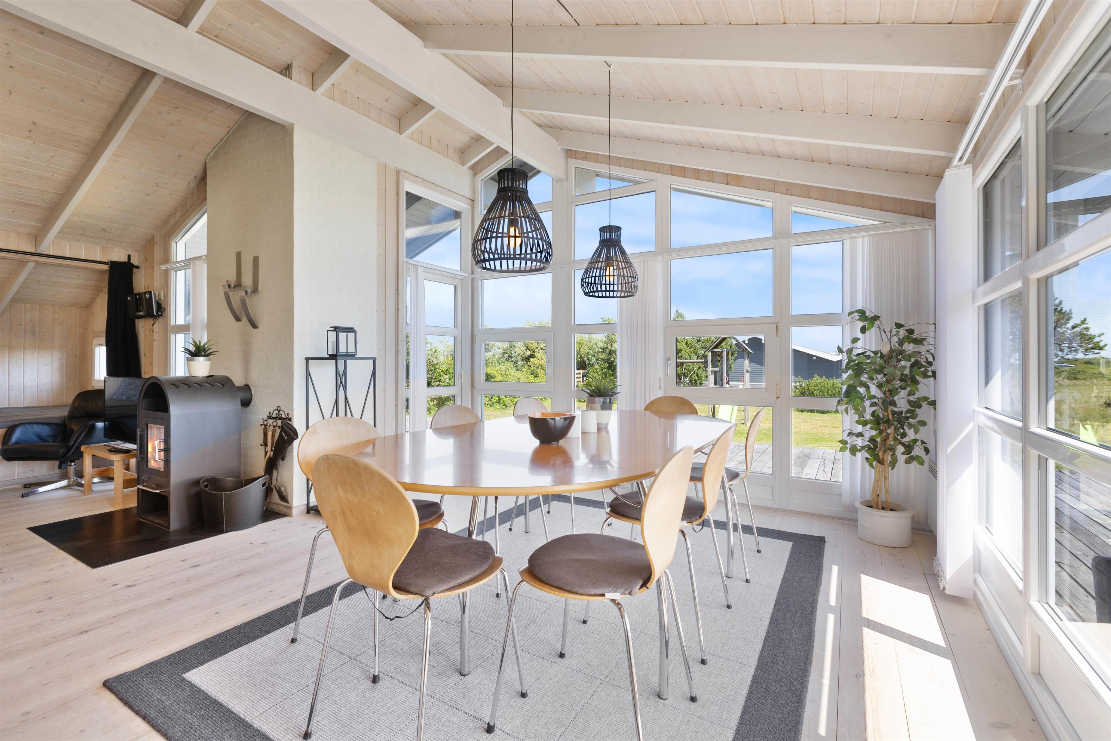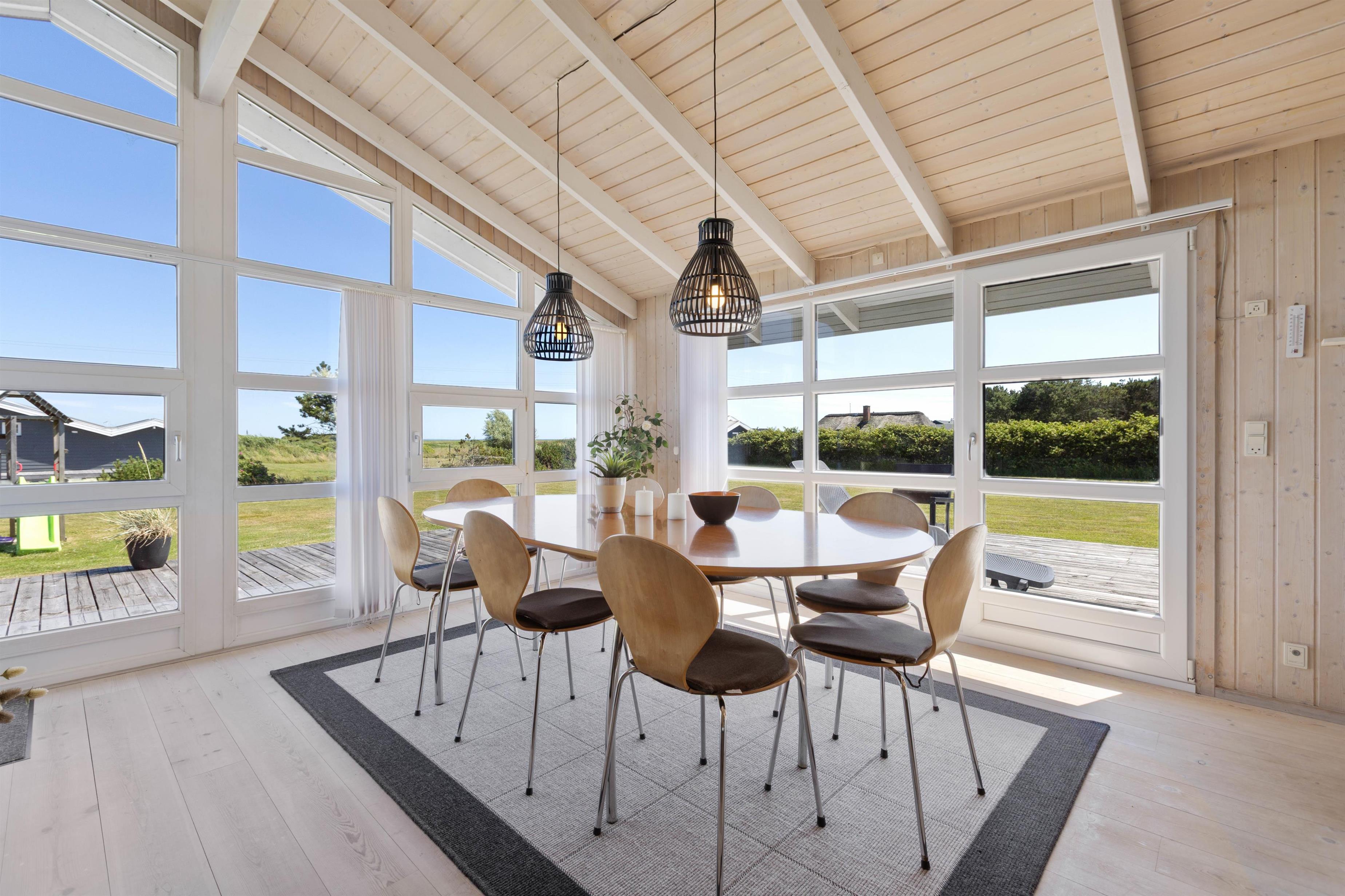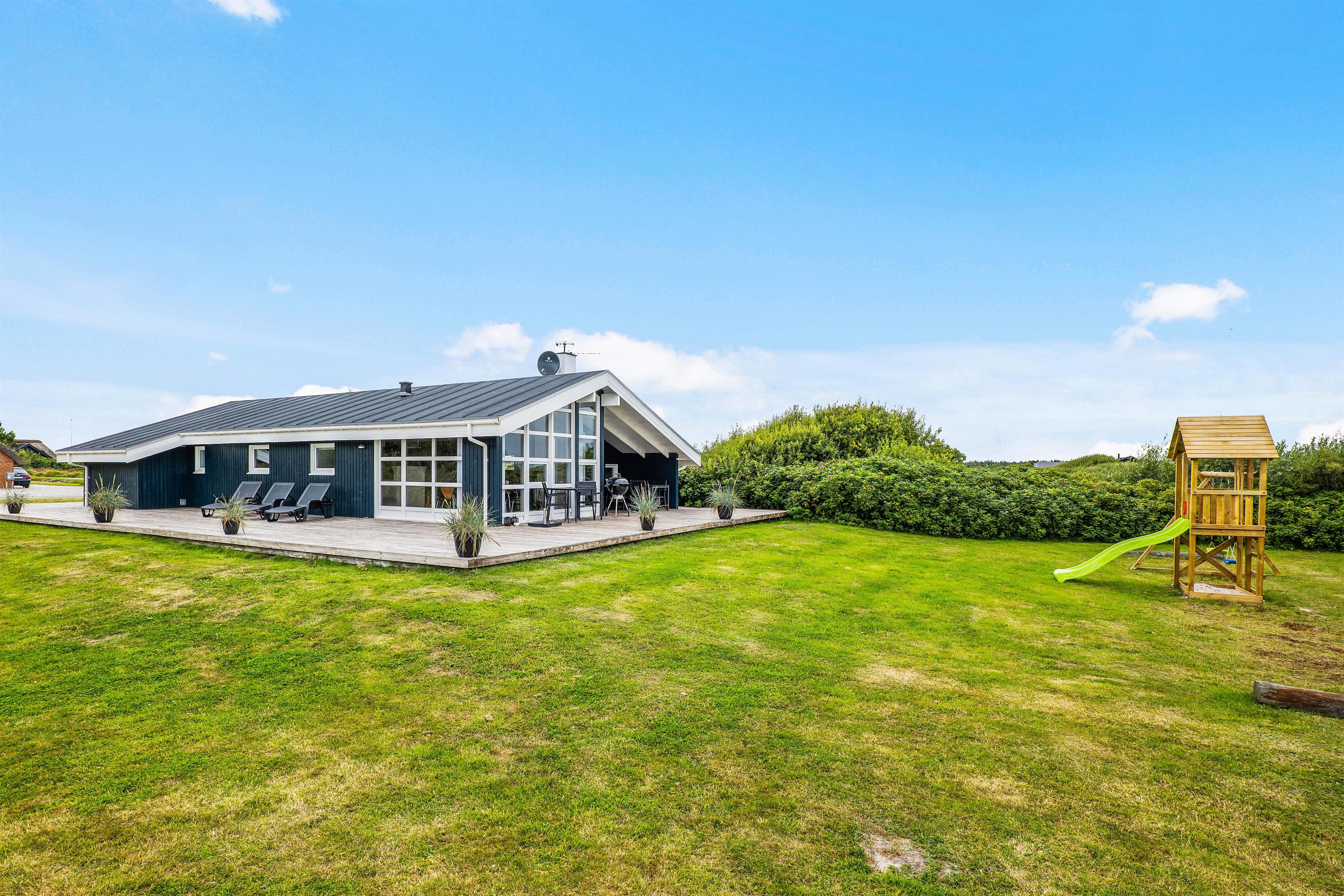 Fra den sydøst vendte terrasse er der en flot udsigt til Ringkøbing Fjord, ligesom man kan nyde den delvist overdækkede terrasse mod øst. Der er terrasse hele vejen rundt om huset, så morgenkaffen kan også indtages mod nordøst. Vesterhavet er kun 800 m fra huset, og det er naturligvis et perfekt sted for traveture med børn og hund. På græsplænen er der et gyngestativ til børnene.